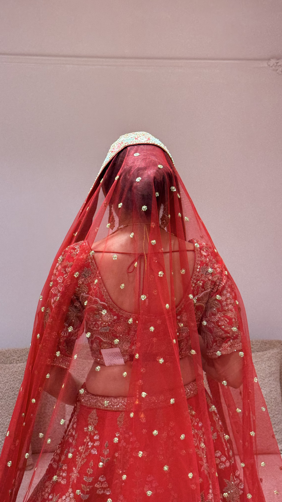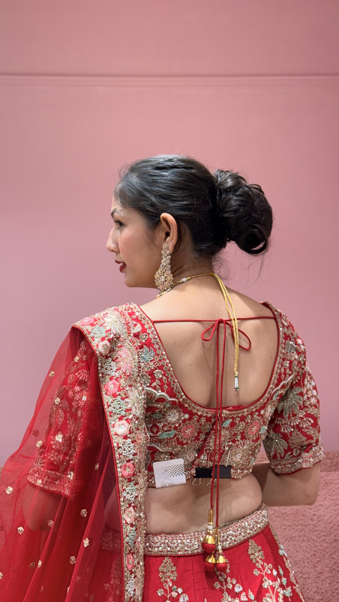 This red lehenga features neat embroidery and a graceful flare that gives it a traditional yet simple charm. The matching blouse and dupatta complete the look without being heavy, making it comfortable and elegant. Ideal for weddings, festive functions, and special occasions where you want to keep it classy and effortless.