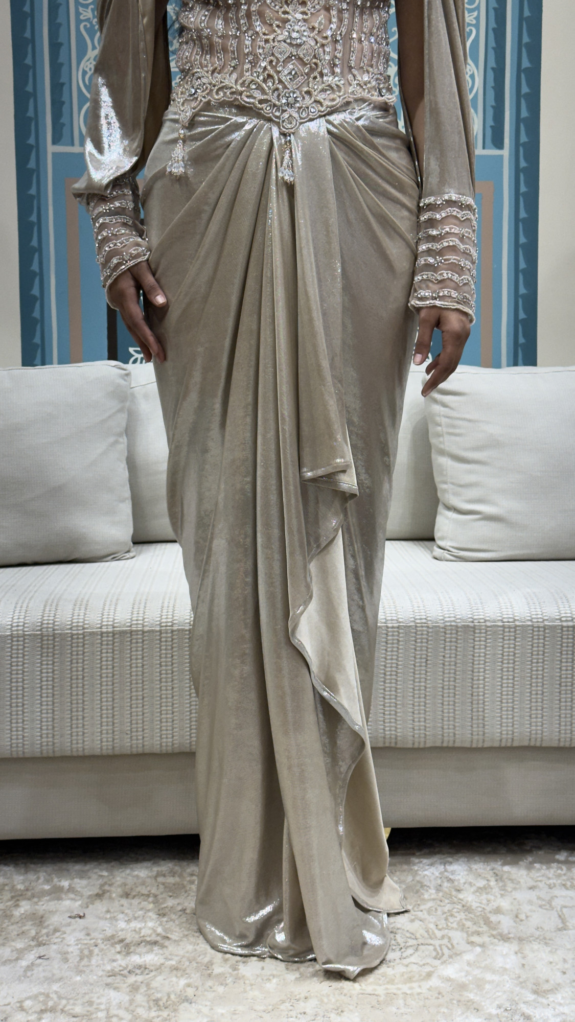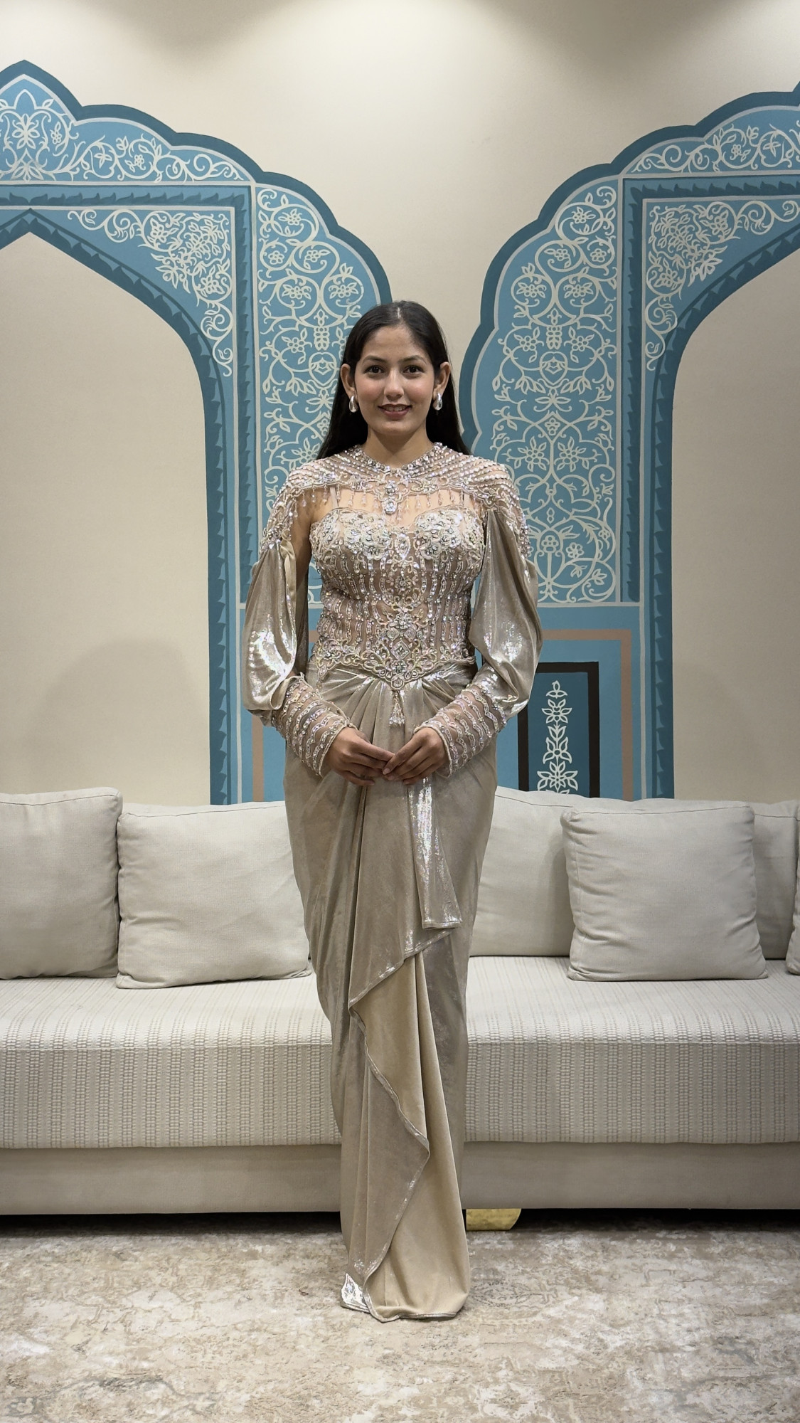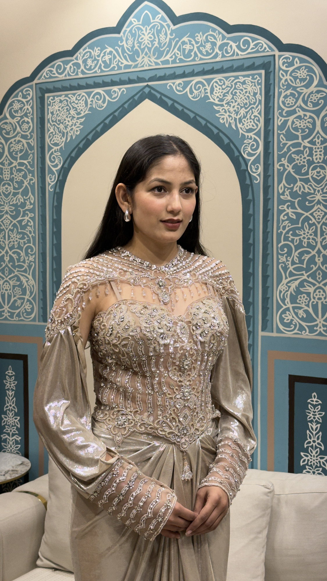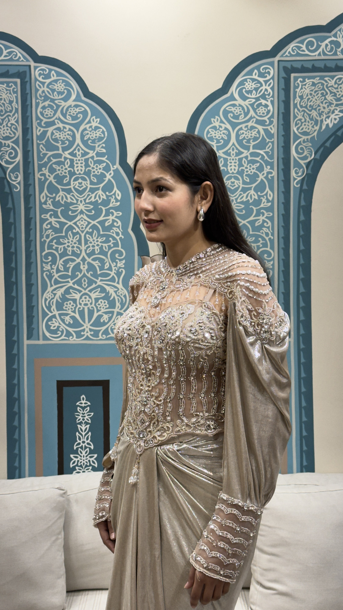 This elegant Indo-western ensemble features a beautifully crafted corset-style top adorned with intricate hand embroidery, sequins, pearls, and crystal detailing, enhanced with a sheer illusion neckline and delicately embellished sleeves for a couture finish. The look is paired with a fluid, skirt in a soft, lustrous fabric that creates graceful folds and effortless movement. Designed to blend modern structure with timeless elegance, this set is perfect for receptions, engagement ceremonies, cocktail evenings, and upscale festive celebrations.