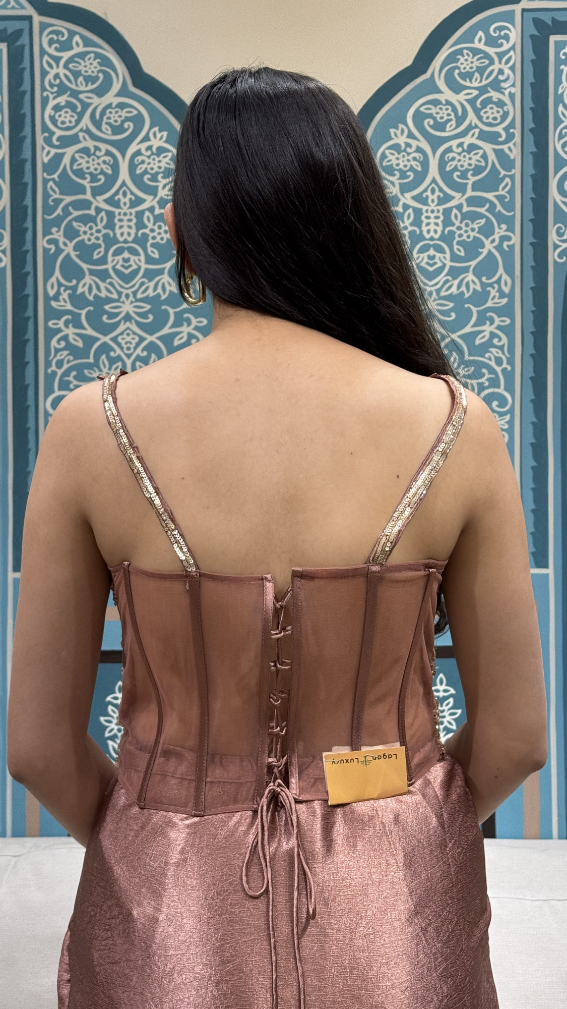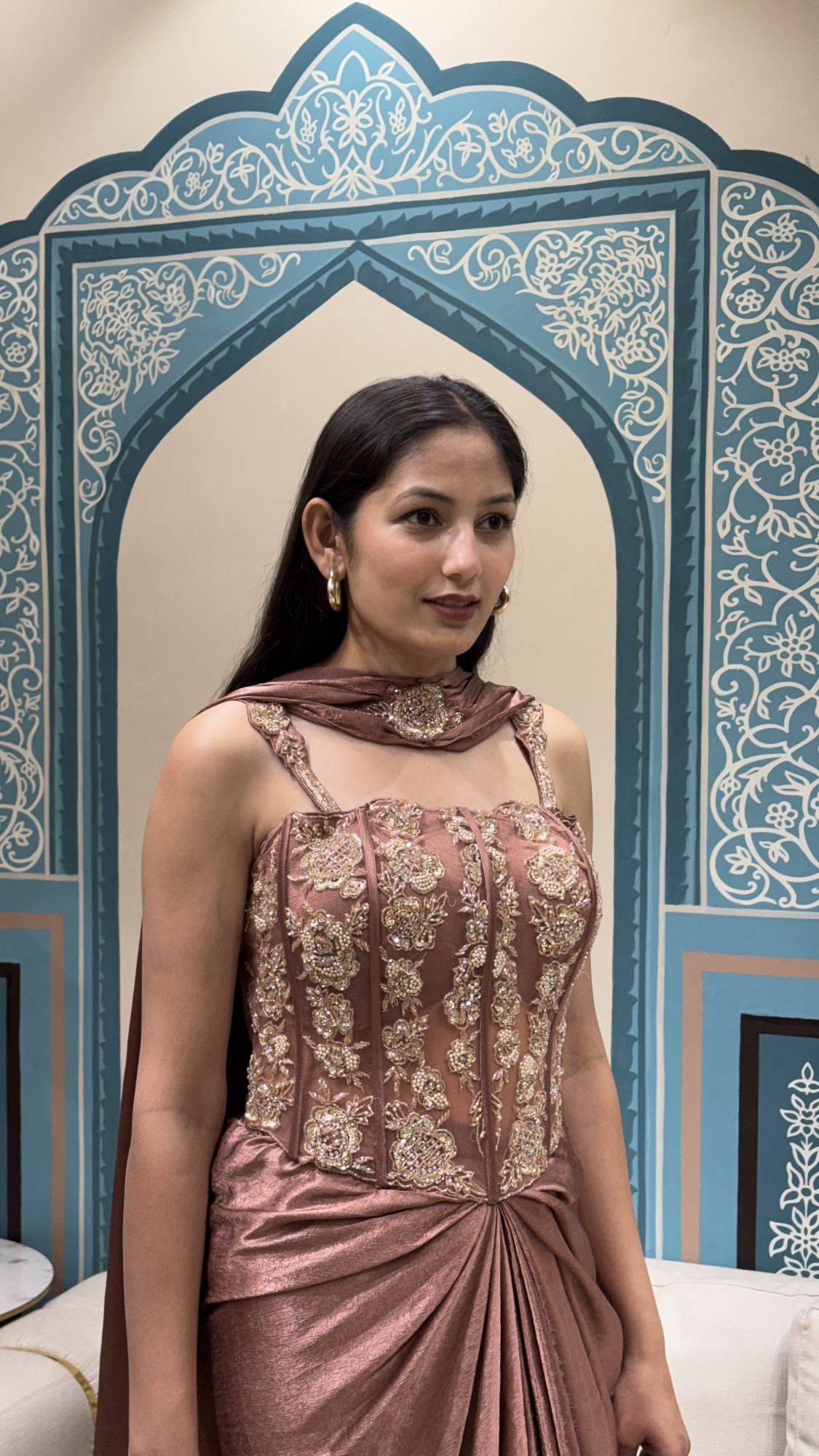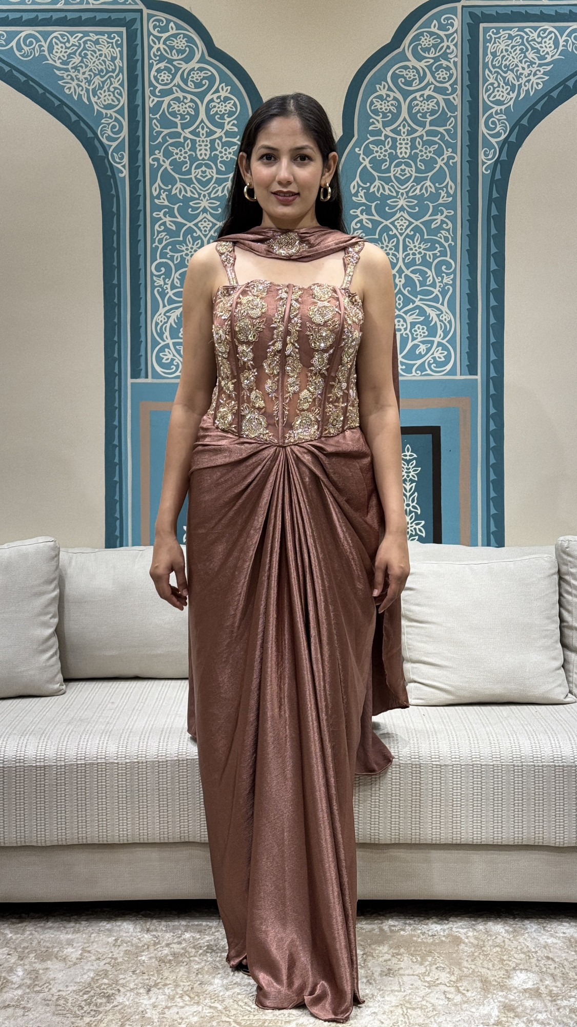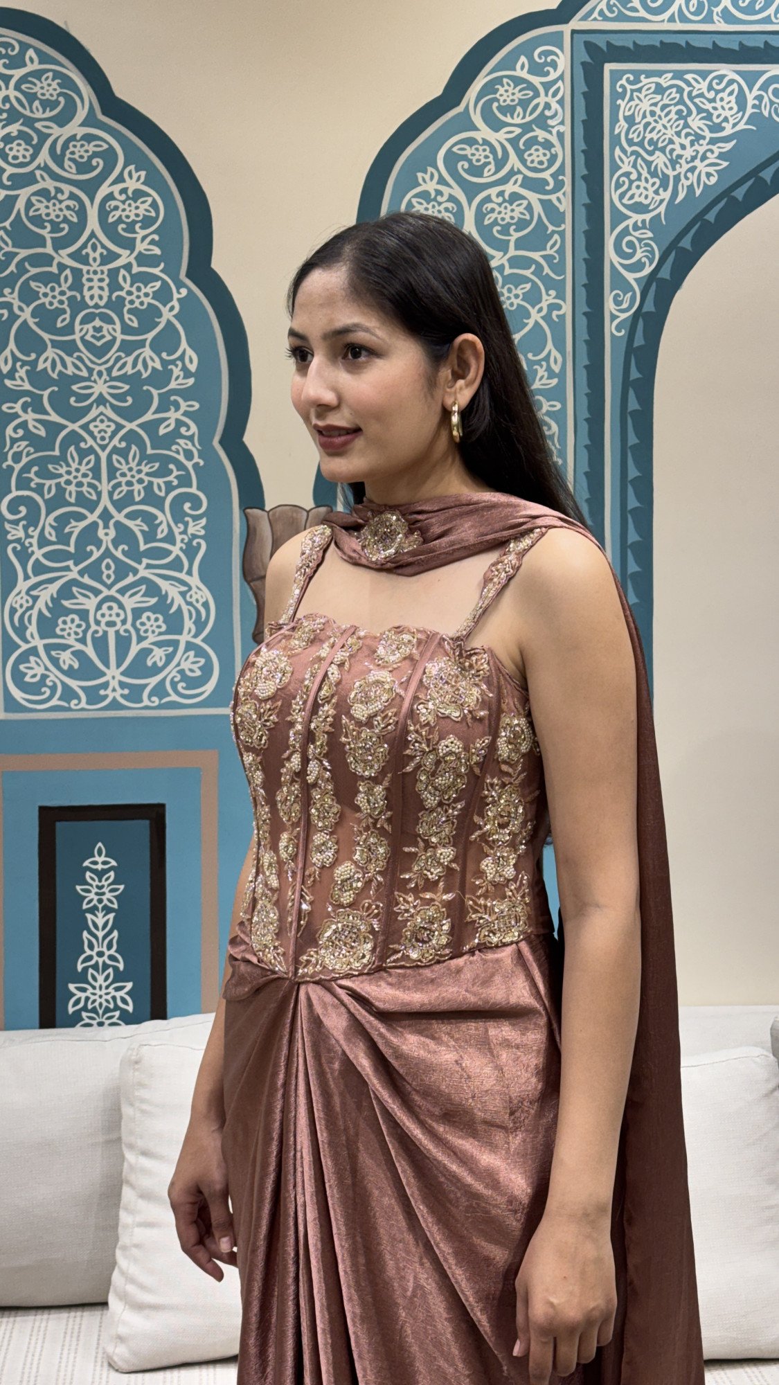 This elegant ensemble features a structured corset-style top detailed with intricate gold floral embroidery, delicate beadwork, and embellished straps, finished with a lace-up back for an adjustable fit. It is paired with a fluid skirt in a soft, lustrous fabric, designed with a gathered front for graceful movement, and complemented by a coordinated attached neck scarf detail that adds a refined finish. A perfect choice for cocktail evenings, receptions, and festive celebrations.