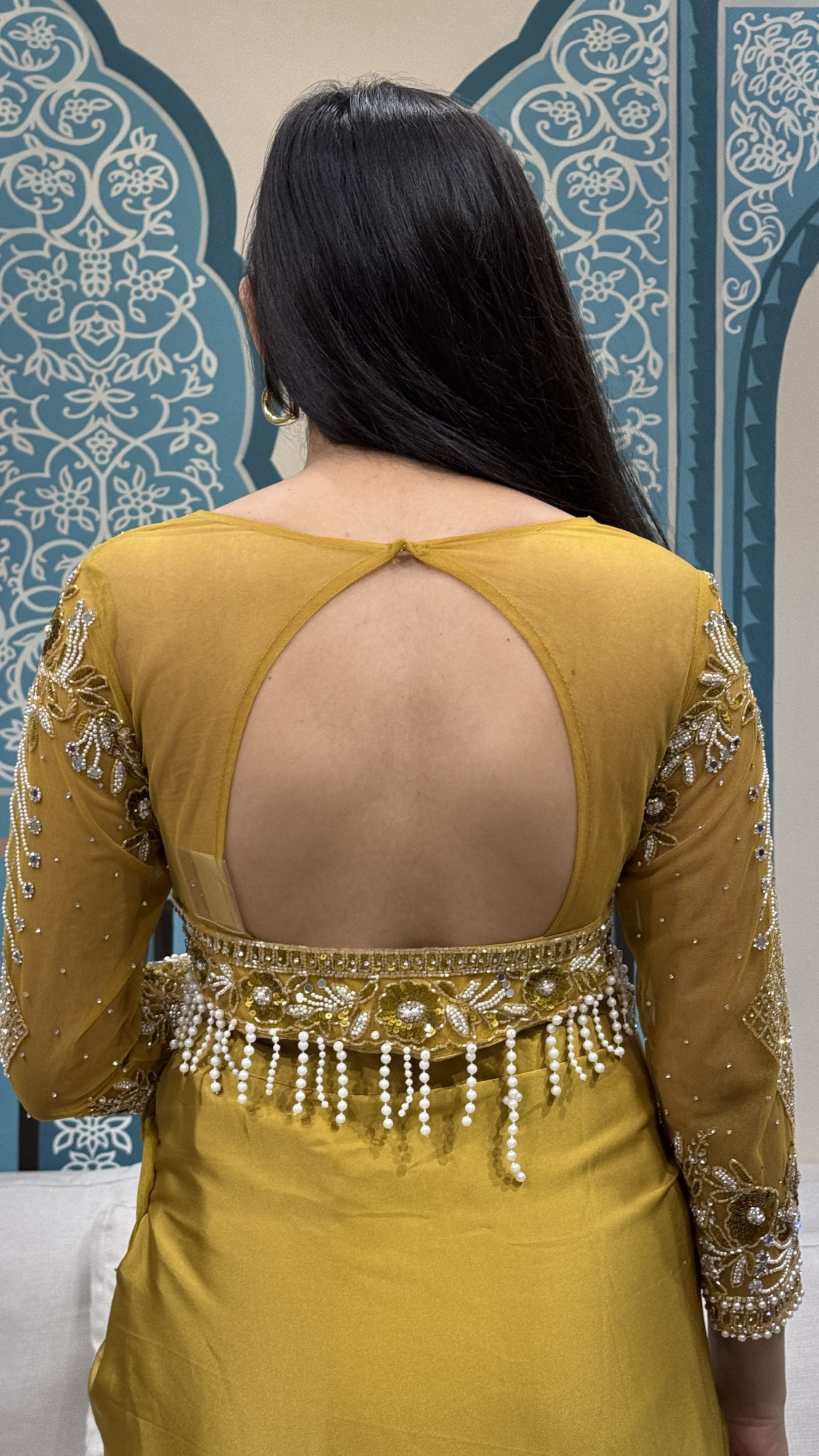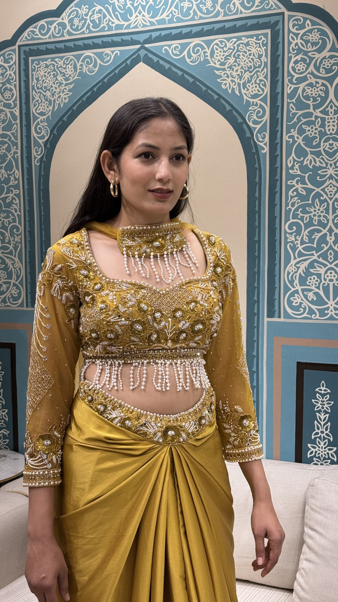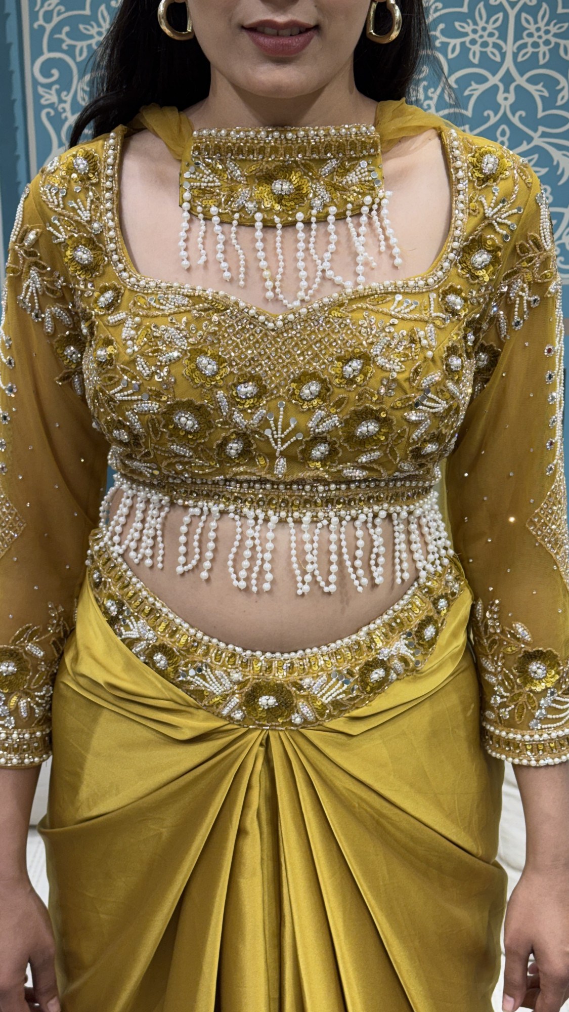 This mustard crop top and skirt set features a richly embroidered blouse with intricate floral work, pearl embellishments, and delicate hanging details that add movement and charm. Paired with a softly draped skirt with a structured waistband, the outfit blends traditional craftsmanship with a modern silhouette, making it ideal for weddings, festive celebrations, and special events.