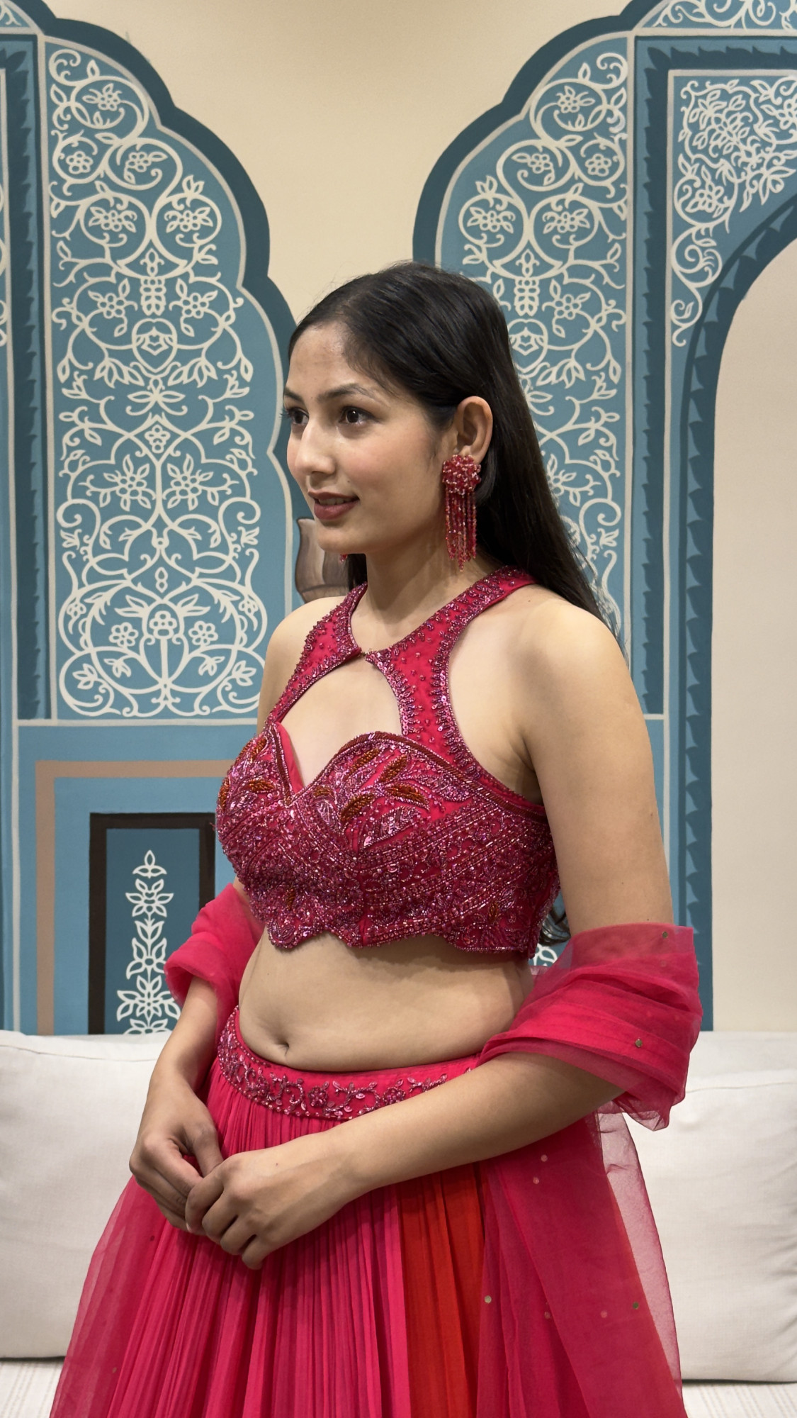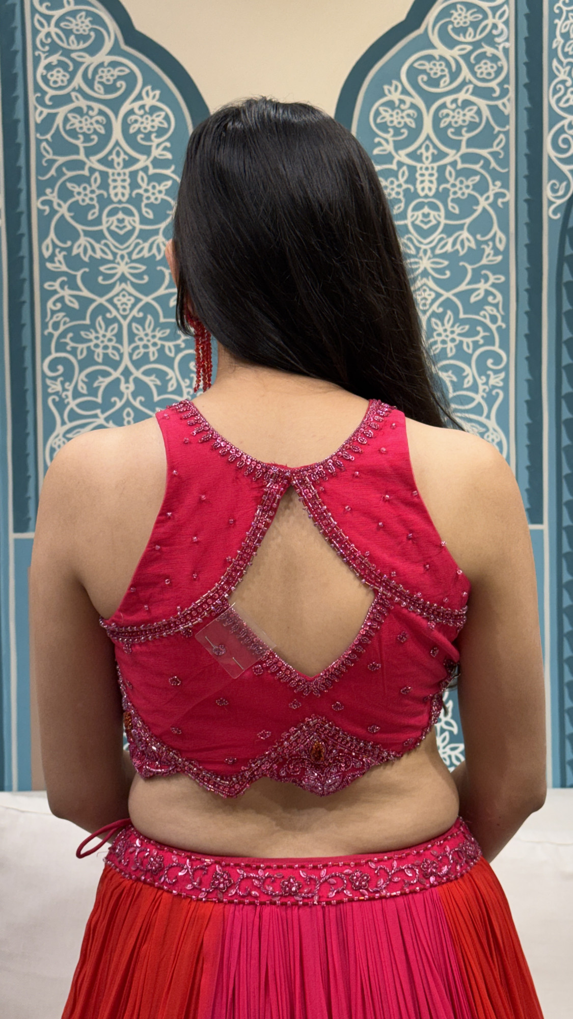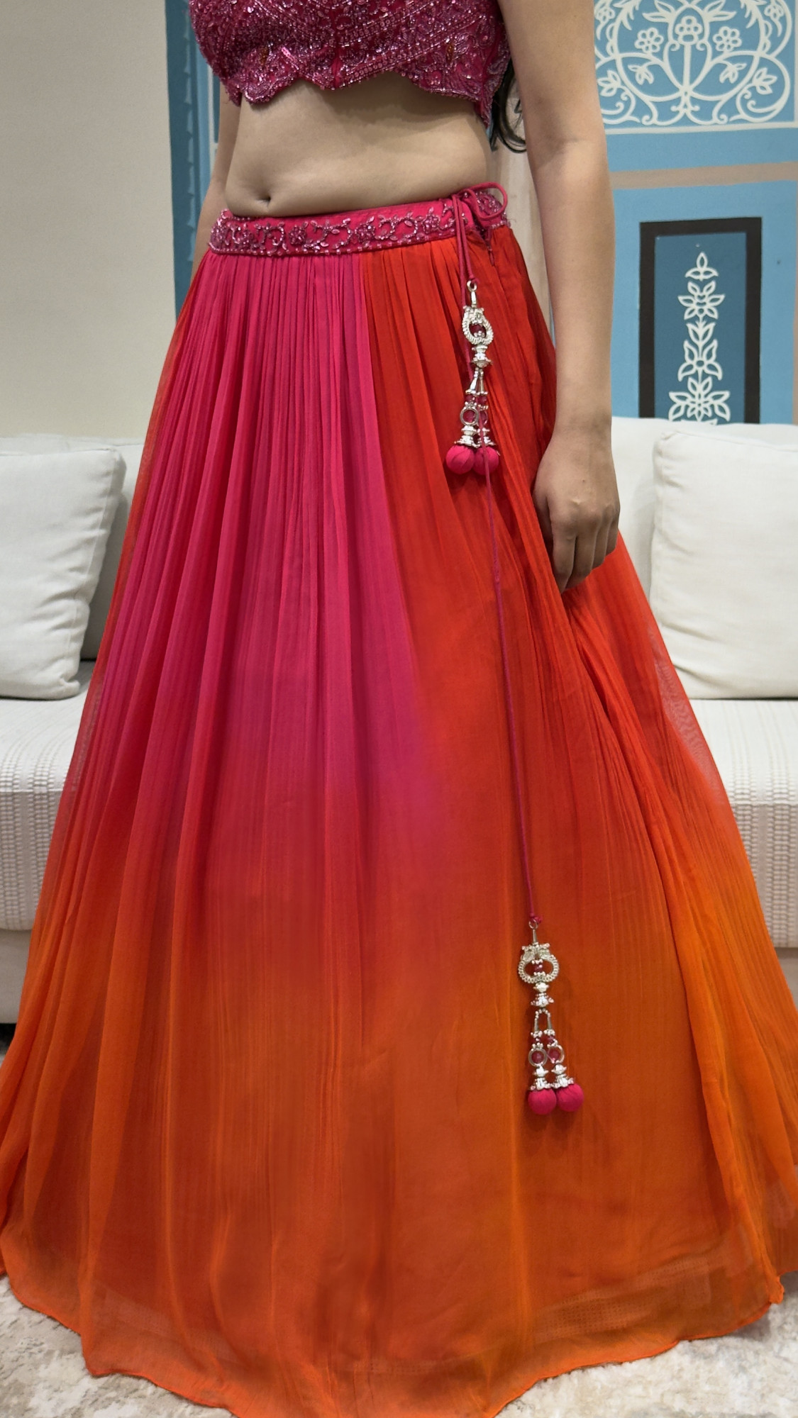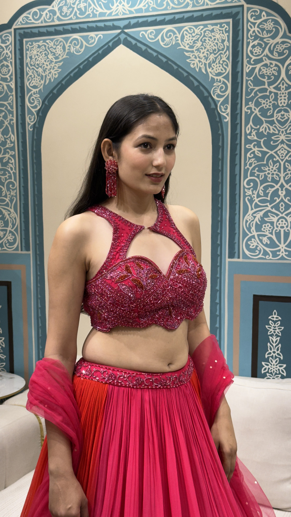 This striking crop top and skirt set showcases a heavily embellished halter-style crop top adorned with detailed beadwork, sequins, and floral embroidery, finished with a keyhole neckline and an elegant back cut-out. The flowing skirt is crafted in a soft net fabric with a beautiful pink-to-orange ombré effect, enhanced with a delicately embroidered waistband and tassel accents for added charm. Paired with a sheer dupatta, this ensemble is perfect for sangeet functions, festive celebrations, and statement wedding events.