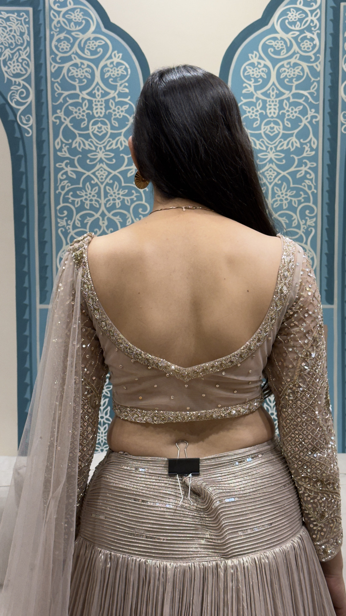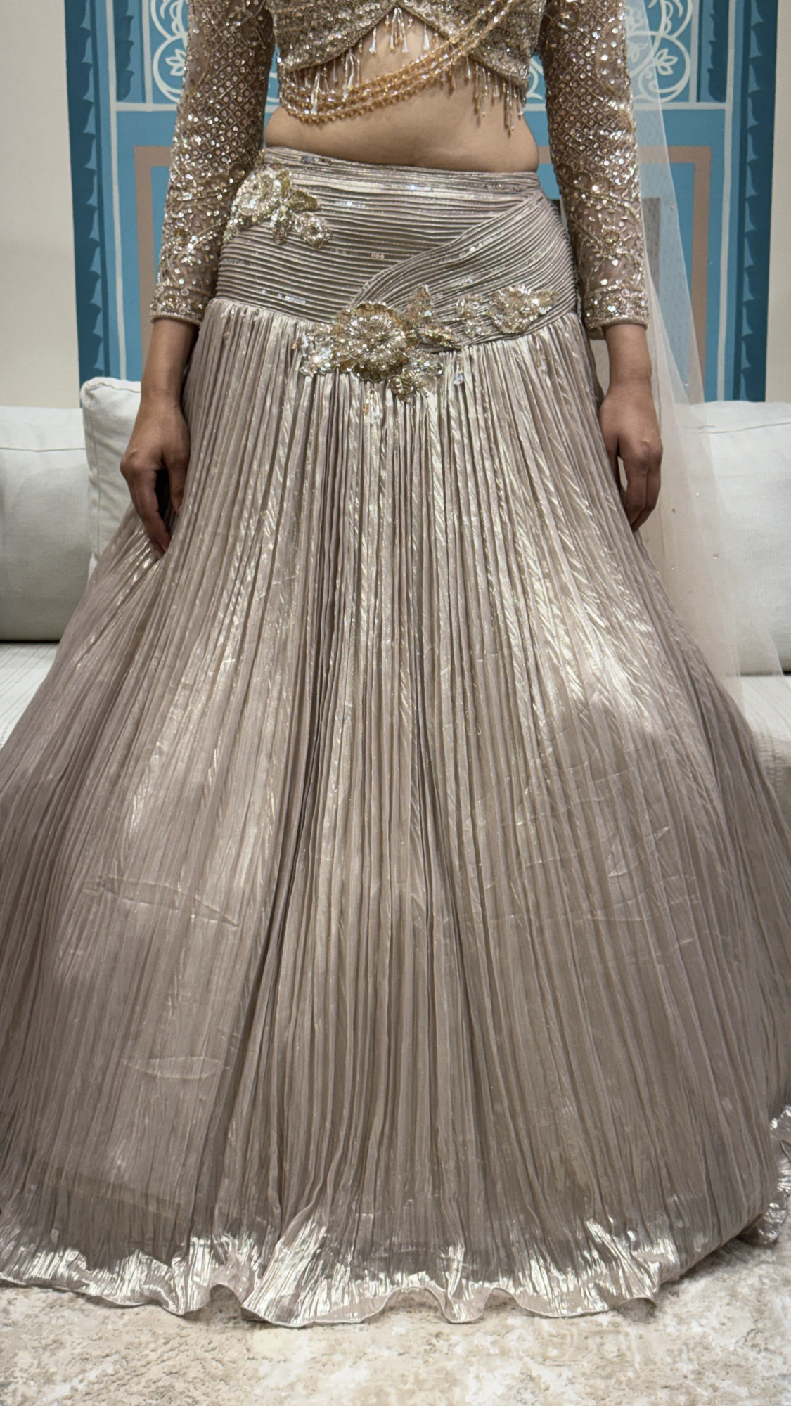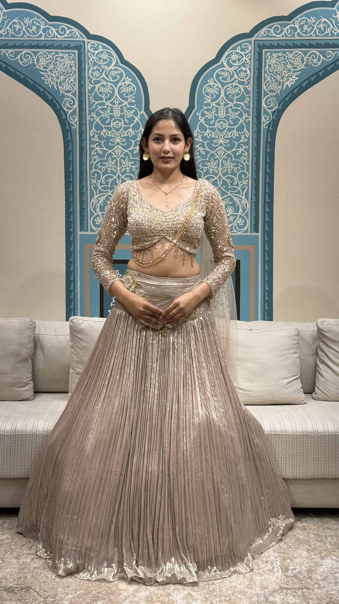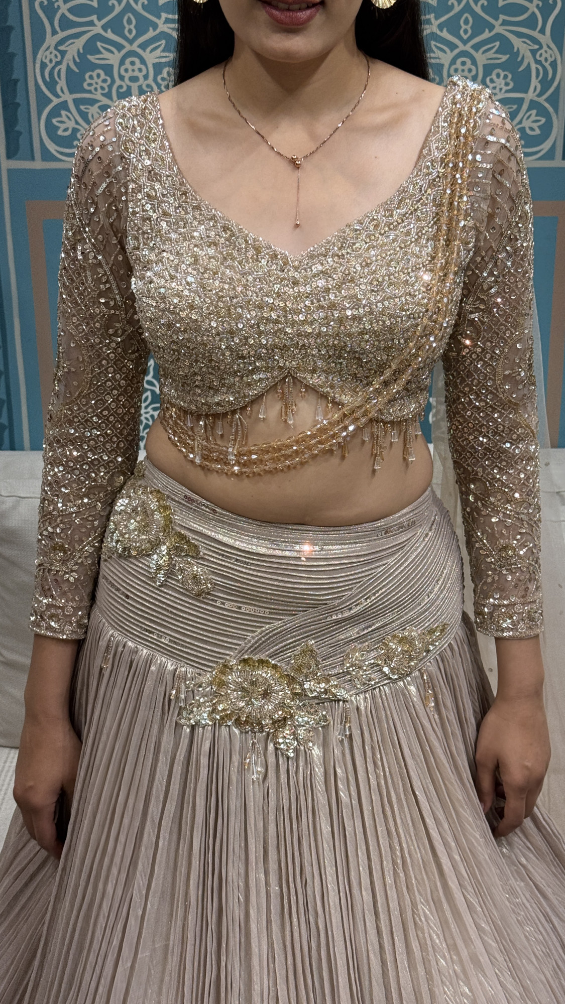 This elegant ensemble features a heavily embellished crop top with sheer sleeves and delicate tassel detailing, paired with a flowy pleated skirt highlighted by embroidered accents. Finished with a lightweight dupatta, it’s perfect for cocktail nights, receptions, and festive celebrations.