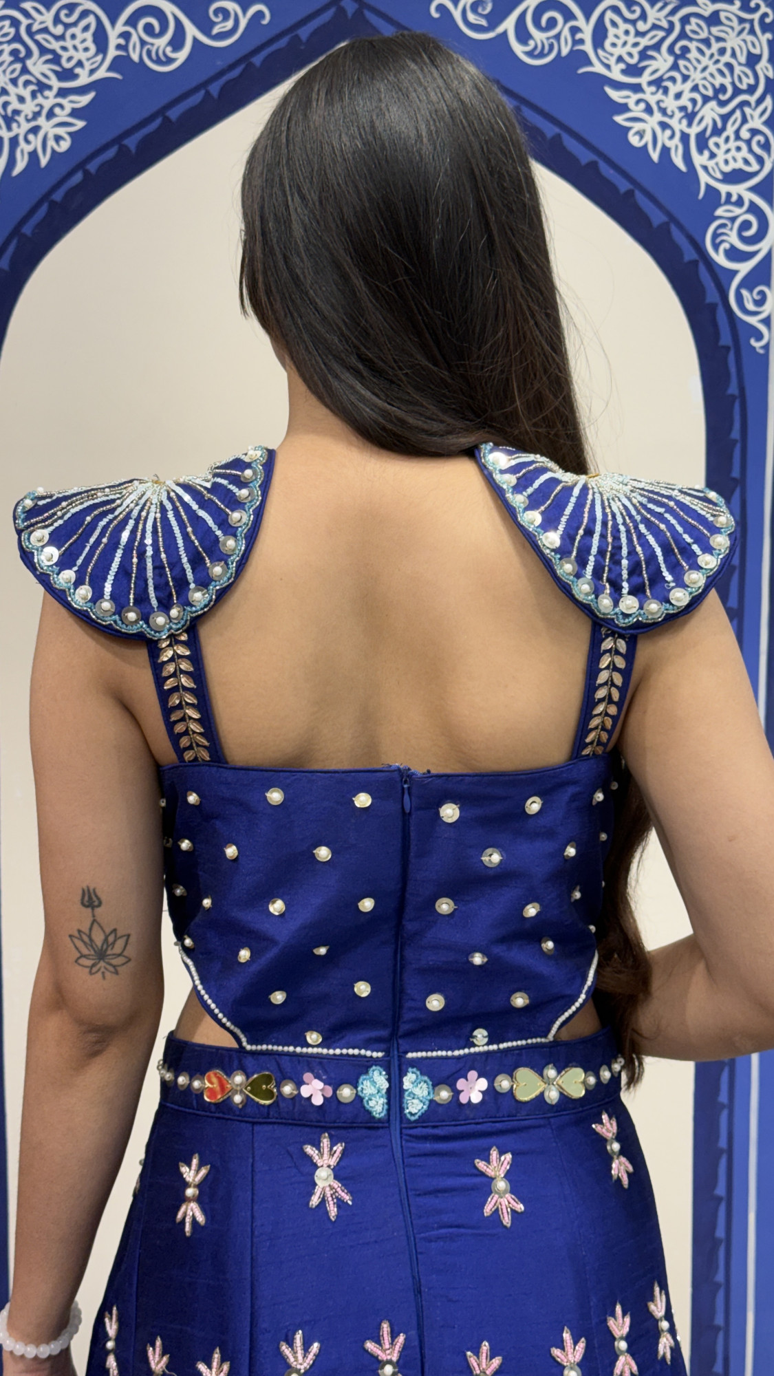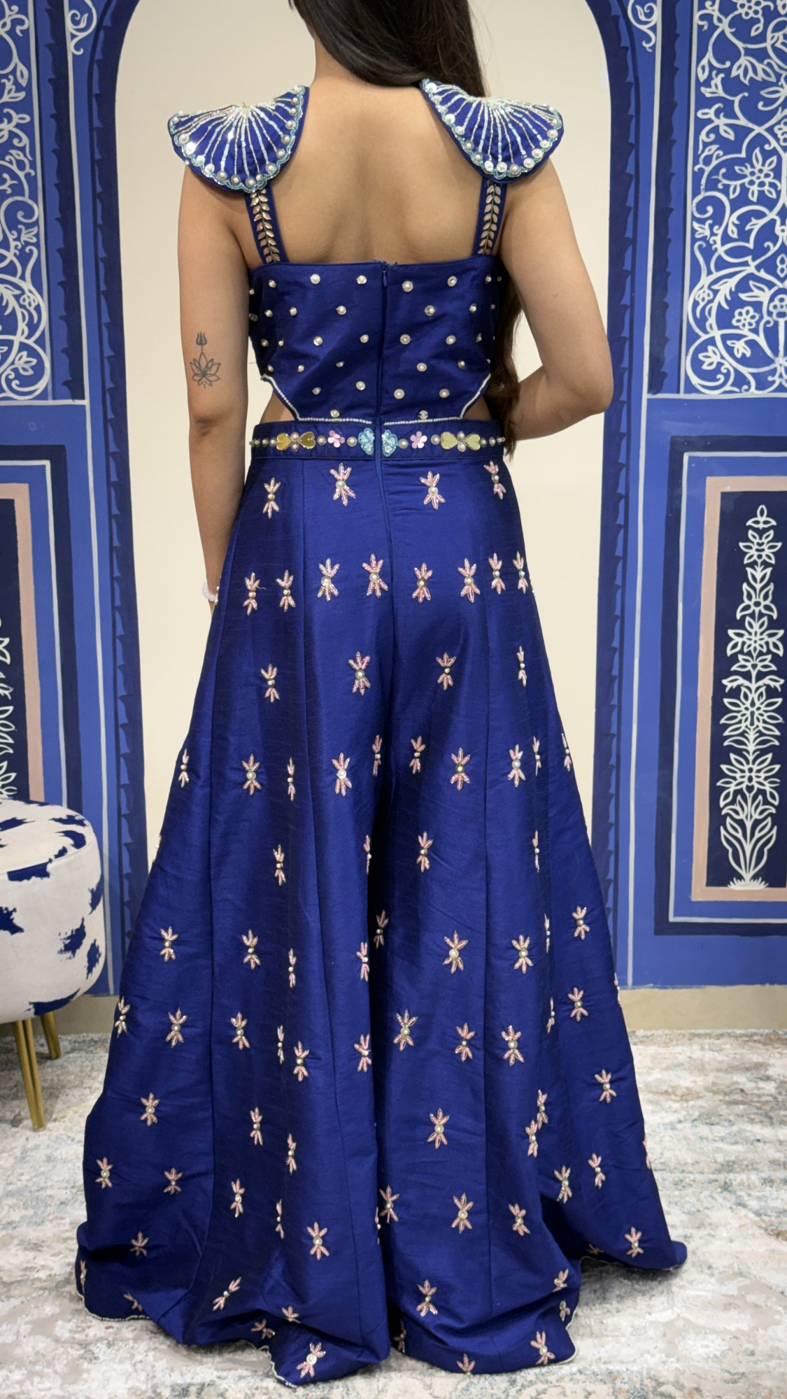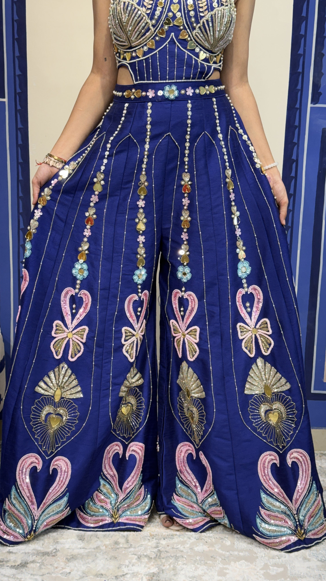 This stunning navy blue palazzo set features a beautifully embellished attached top adorned with pearls, mirrors, and intricate thread embroidery. The structured bodice with unique shoulder detailing adds a bold and contemporary touch. The wide-leg palazzo pants are decorated with delicate vertical beadwork and vibrant embroidered motifs, creating graceful movement and a regal silhouette. Perfect for weddings, festive celebrations, and cocktail events, this outfit blends modern design with rich traditional craftsmanship. ✨