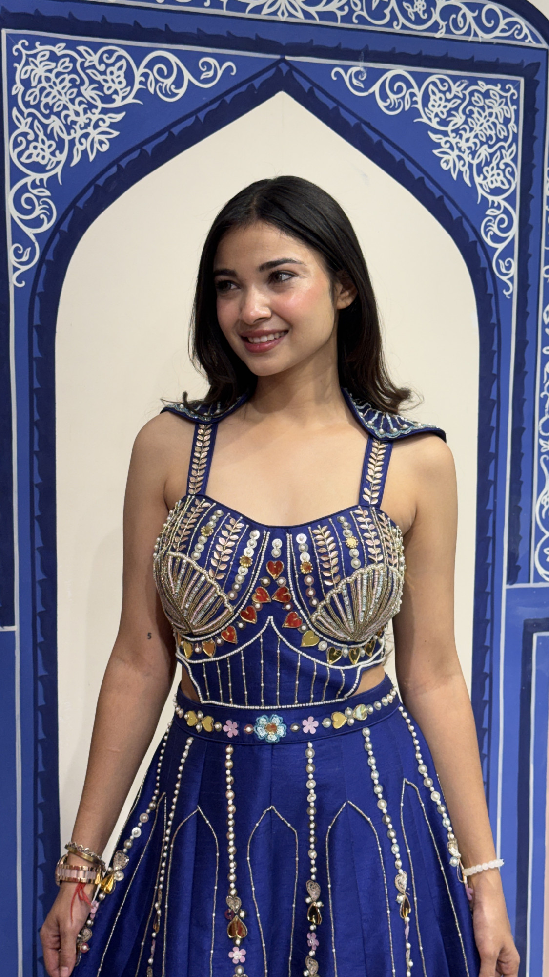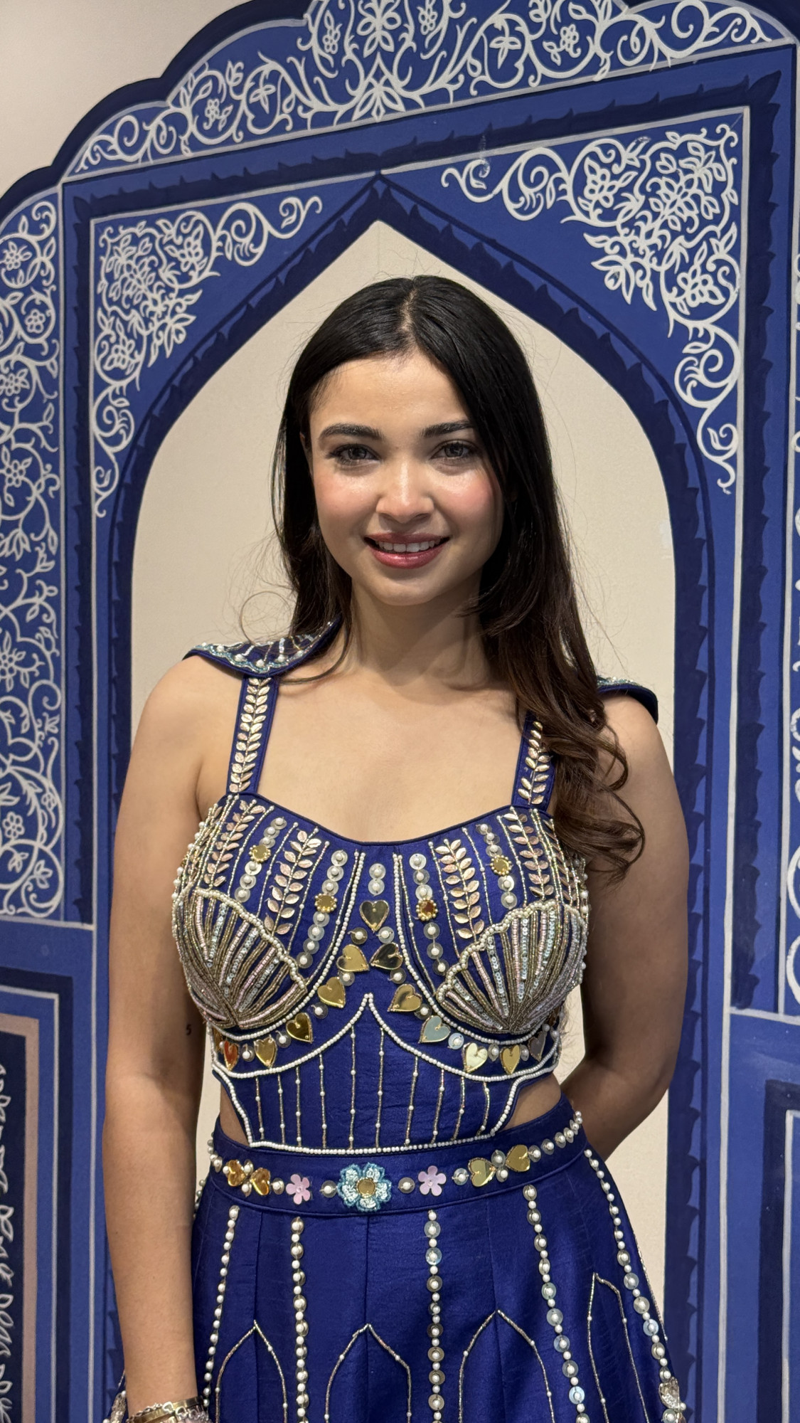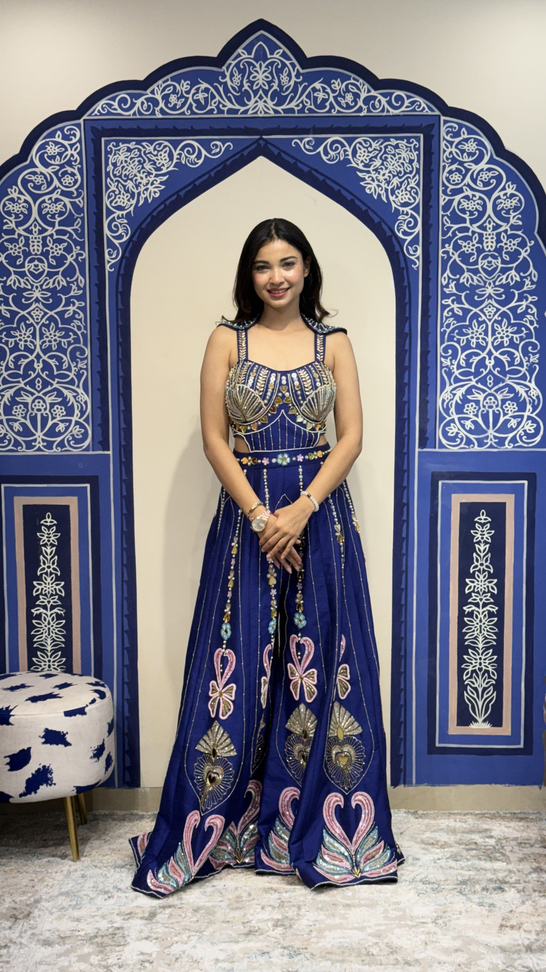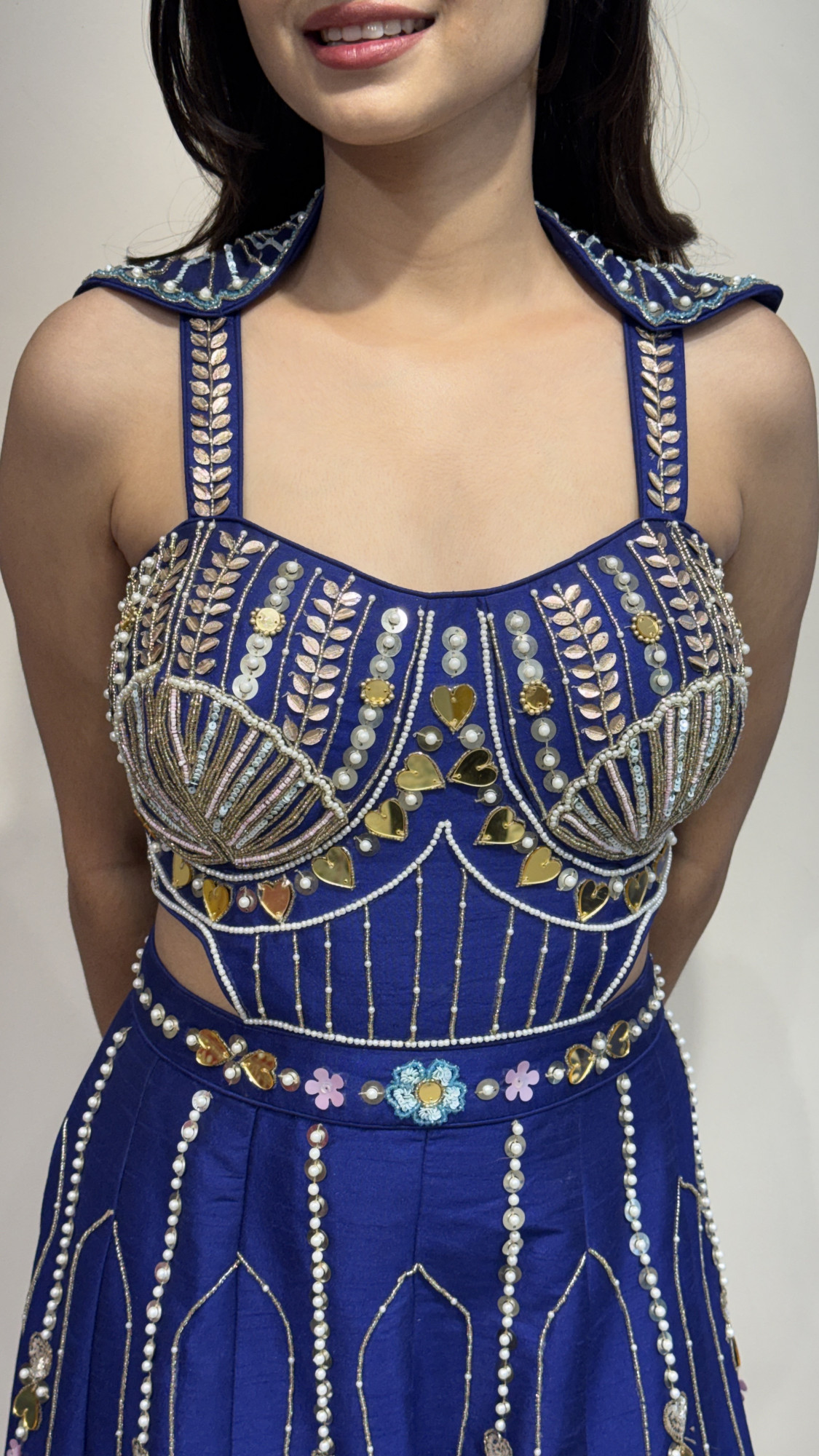 This stunning navy blue palazzo set features a beautifully embellished attached top adorned with pearls, mirrors, and intricate thread embroidery. The structured bodice with unique shoulder detailing adds a bold and contemporary touch. The wide-leg palazzo pants are decorated with delicate vertical beadwork and vibrant embroidered motifs, creating graceful movement and a regal silhouette. Perfect for weddings, festive celebrations, and cocktail events, this outfit blends modern design with rich traditional craftsmanship. ✨