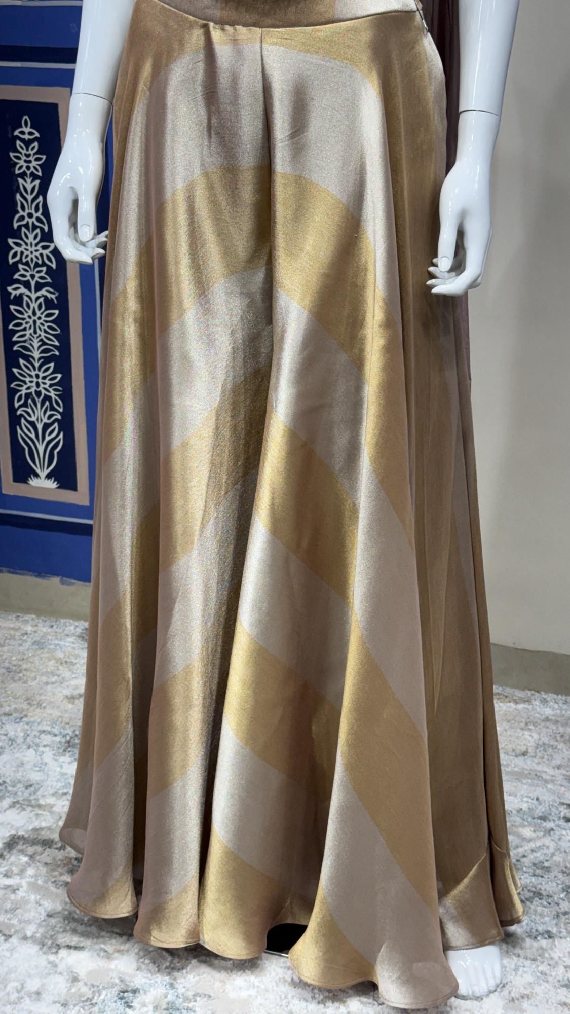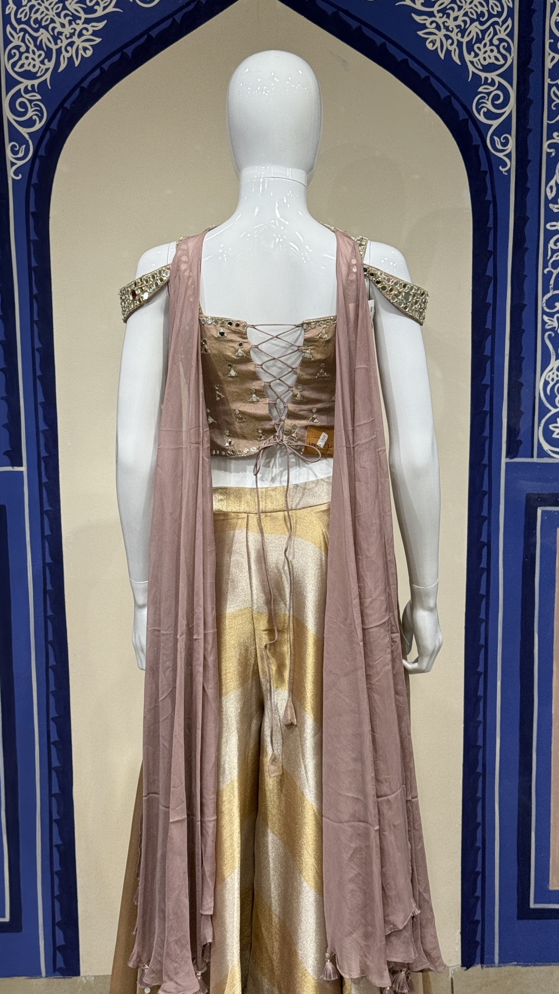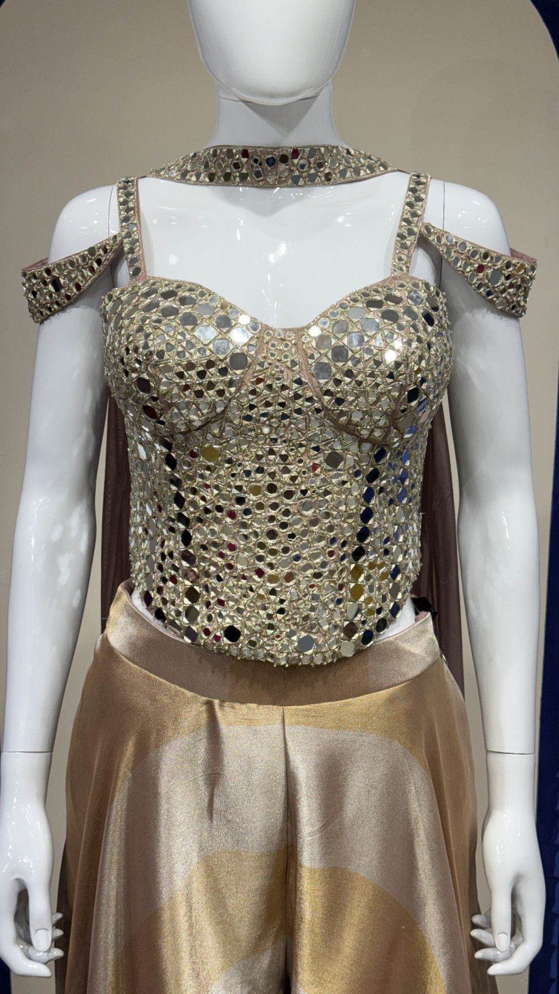 This stunning champagne-gold lehenga set is designed to make a statement at any special occasion. The outfit features a heavily embellished mirror-work blouse with elegant cold-shoulder straps that add a modern touch. Paired with a beautifully flowing lehenga skirt in rich gold tones, the ensemble creates a graceful and flattering silhouette. The soft draped dupatta adds elegance and movement, completing the look with subtle sophistication. Perfect for weddings, receptions, and festive celebrations, this outfit blends traditional craftsmanship with contemporary style.