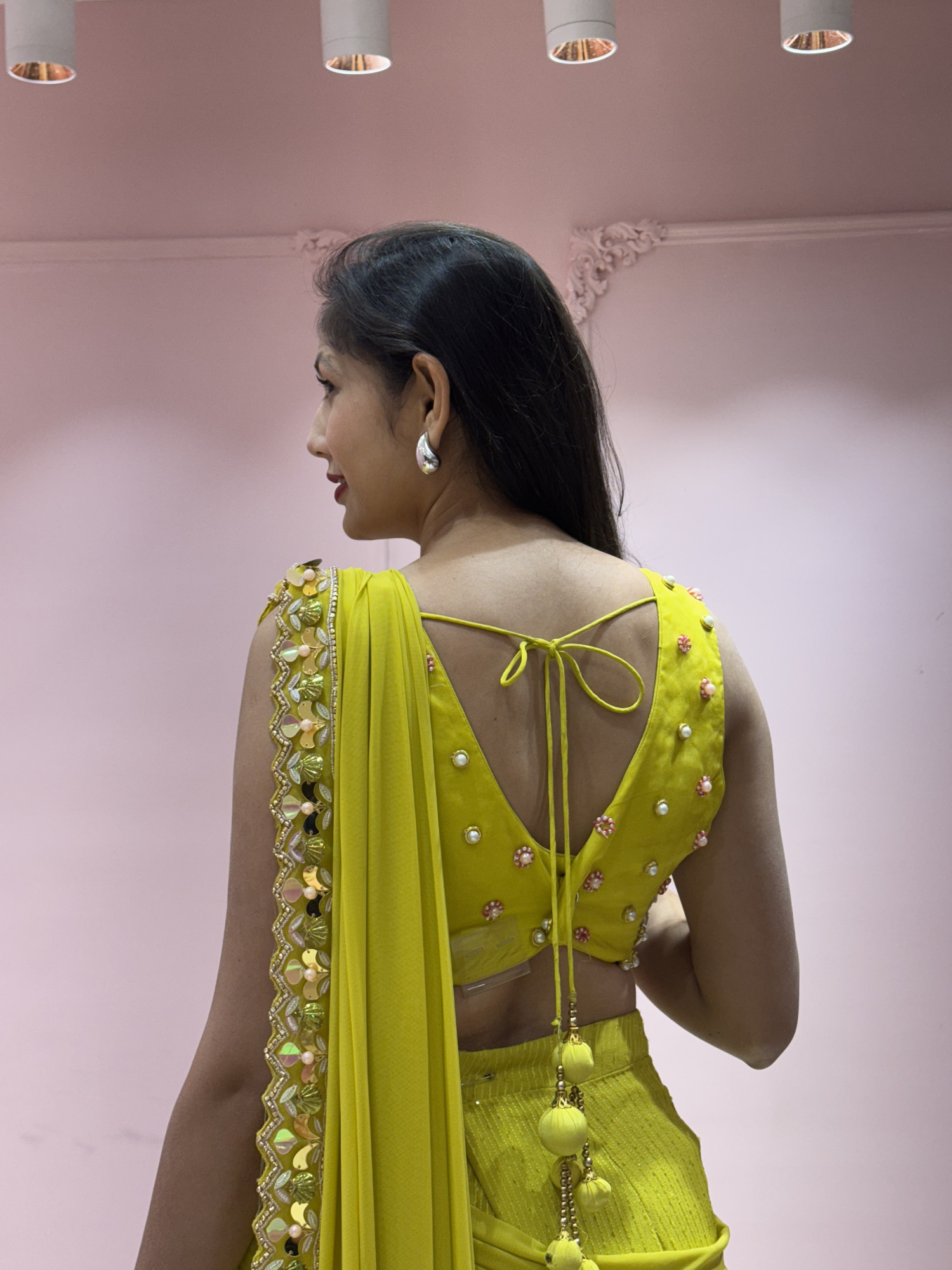 This lime-toned saree features a lightweight, fluid silhouette that falls with ease and movement. It is styled with a finely embellished blouse accented with delicate floral details and a clean, structured finish. The look is balanced by subtle borders and a graceful pallu, creating a refined yet lively ensemble suited for daytime celebrations, festive gatherings, and intimate occasions.