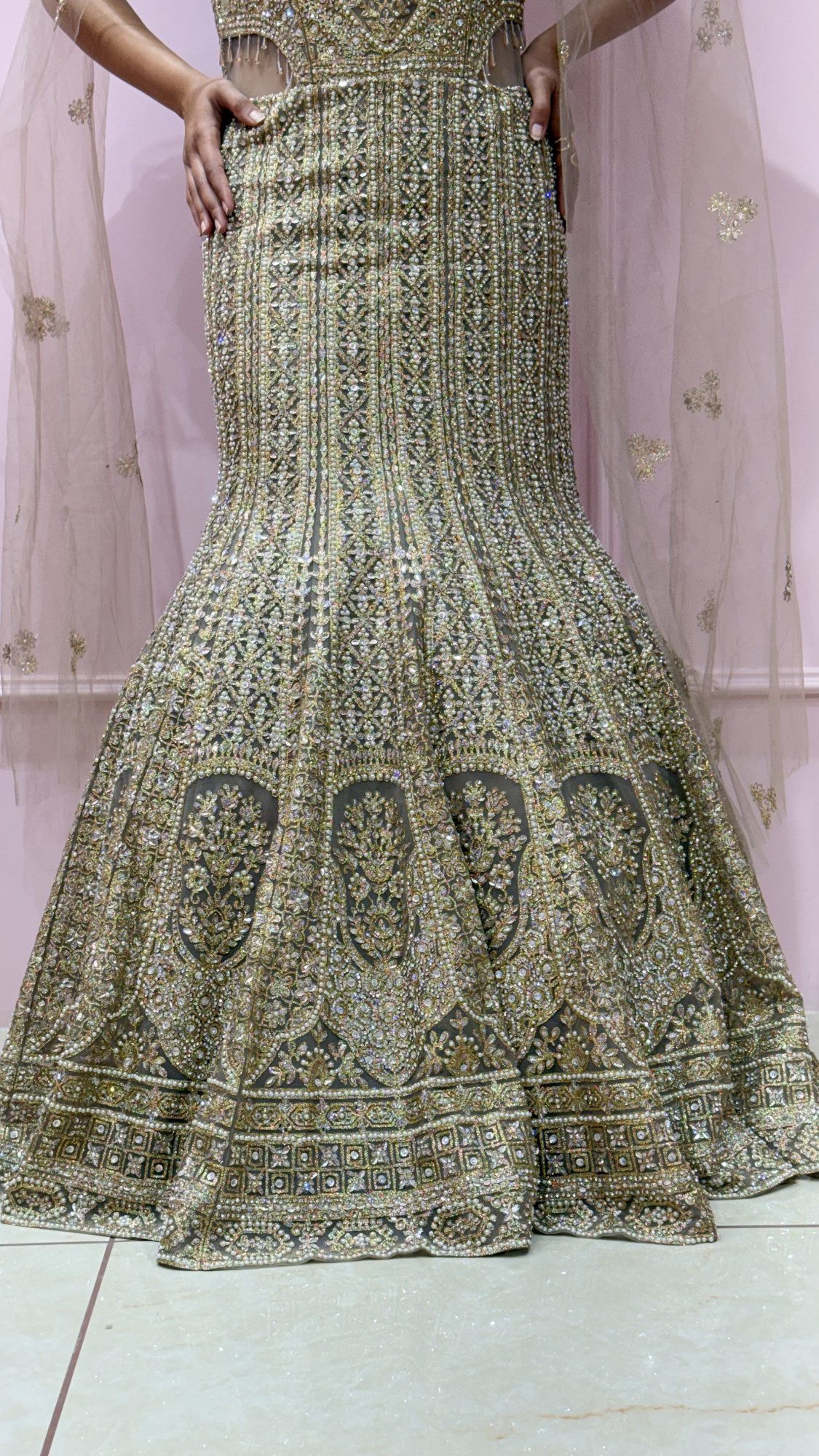 This gown showcases exquisite hand embroidery with shimmering sequins and beadwork throughout. The fitted bodice with a subtle cut-out enhances the silhouette, while sheer tulle sleeves with soft ruffles add a romantic touch. The skirt flows into a beautifully structured flare, adorned with ornate patterns and a statement hem, making it perfect for weddings, receptions, and grand evening occasions.