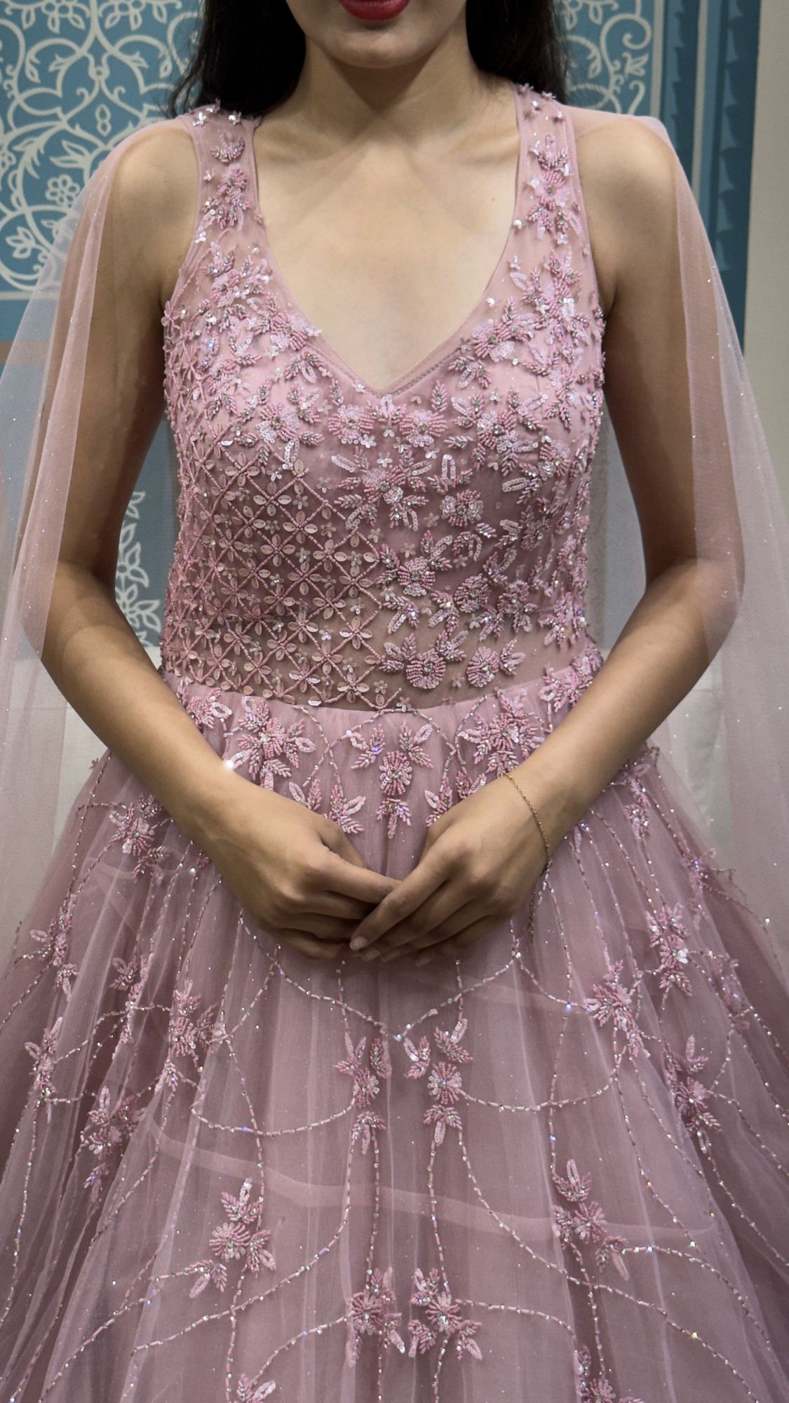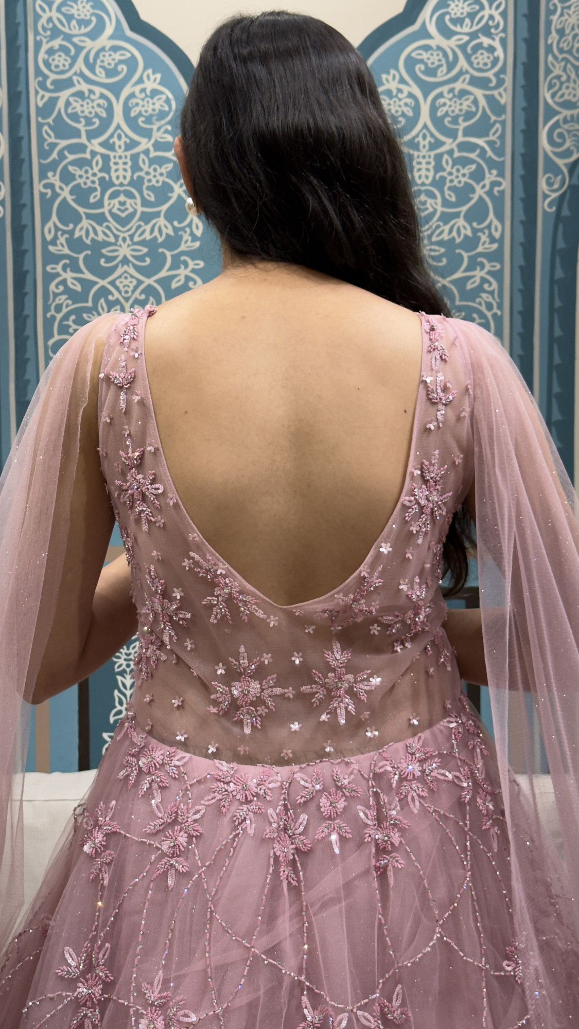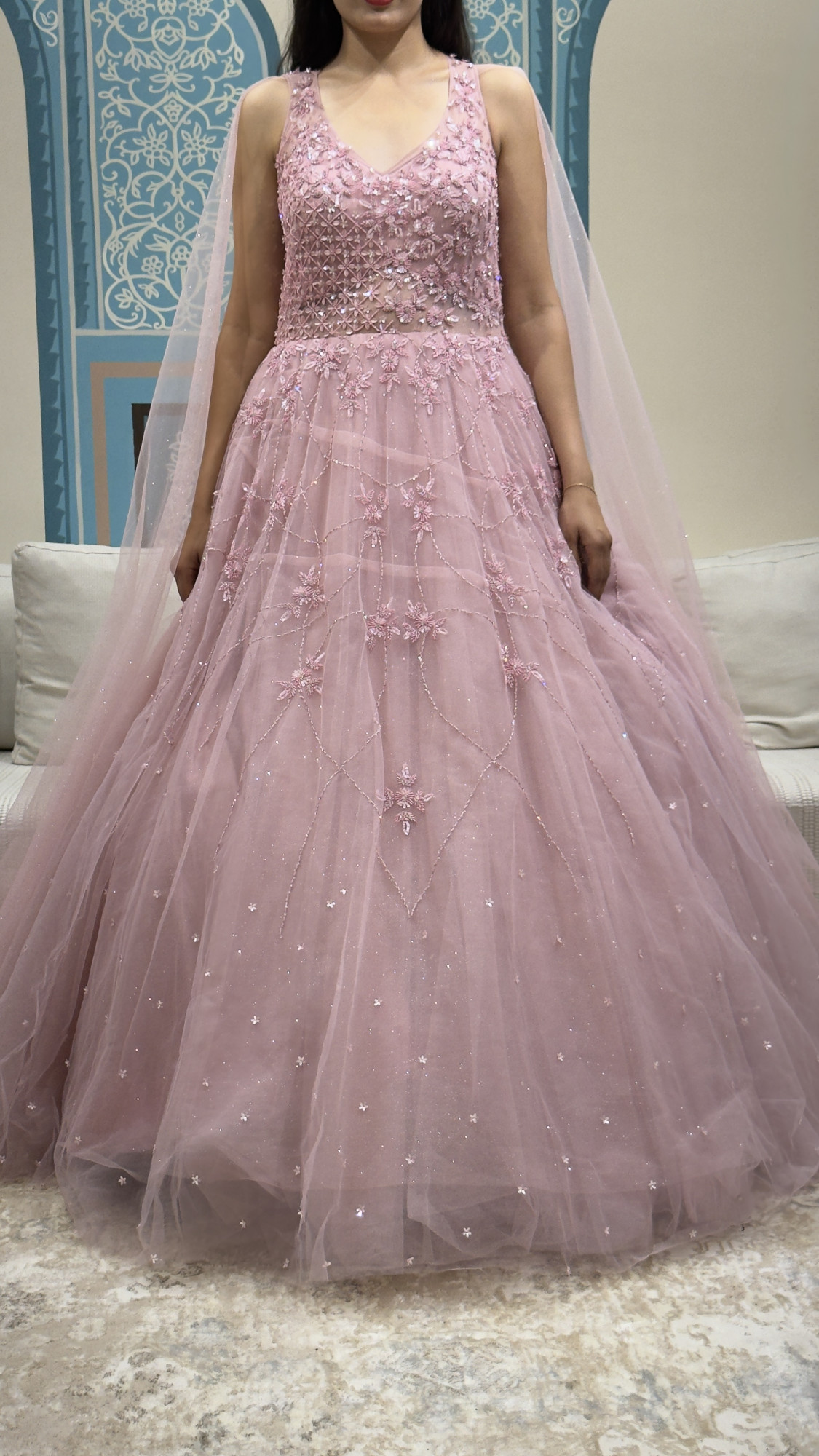 This blush pink gown features intricate floral embroidery on a sheer embellished bodice, paired with a voluminous net skirt that moves beautifully with every step. Finished with soft cape-style drapes and subtle sparkle, it’s perfect for engagements, receptions, cocktail evenings, and romantic celebrations.