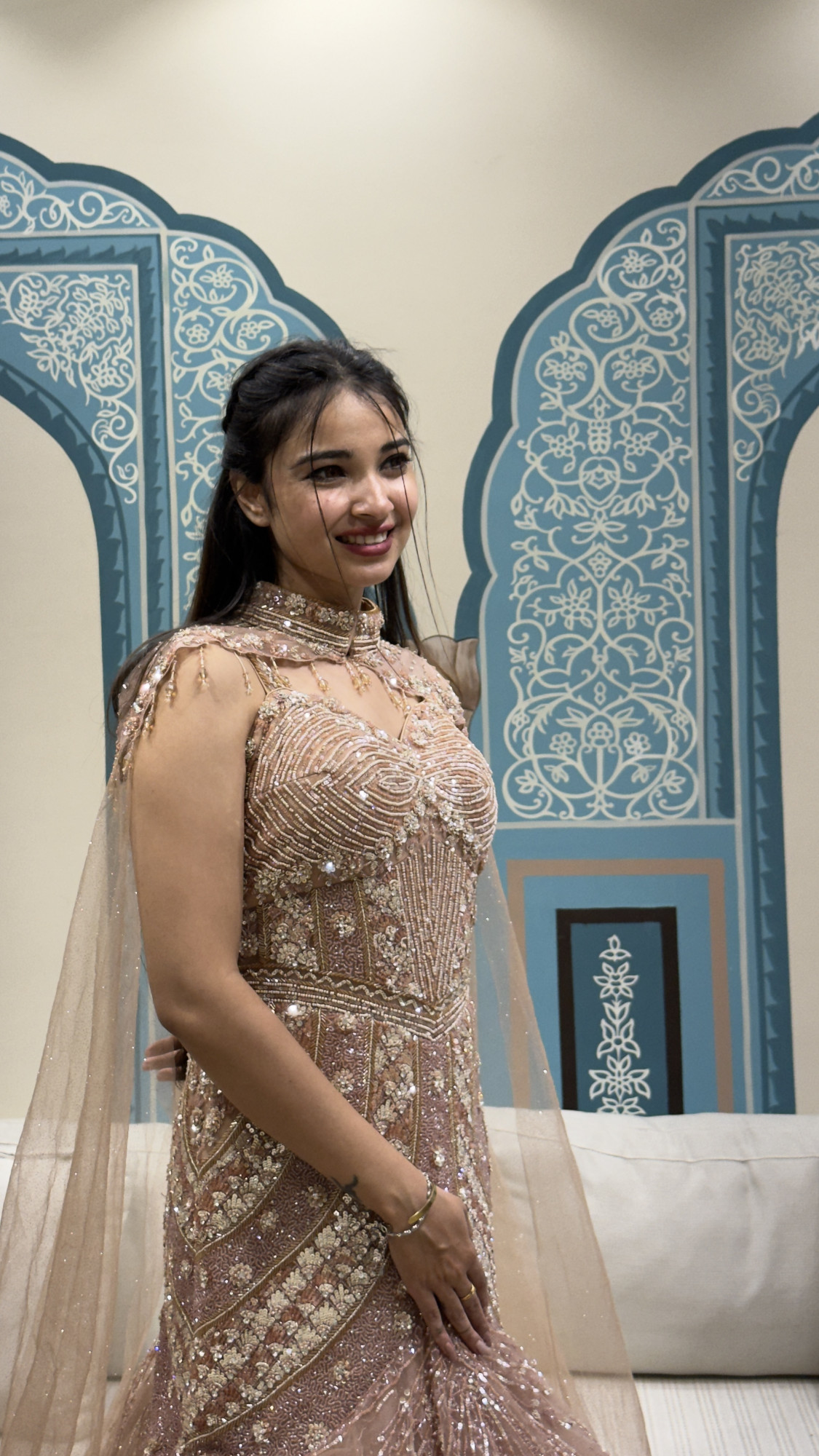 This breathtaking gown is designed in a soft blush/rose-gold tone, fully embellished with luxurious sequins, pearls, and intricate floral beadwork that catches the light beautifully. The fitted corset-style bodice is crafted with structured detailing and a flattering sweetheart silhouette, giving a perfectly snatched shape. Adding a unique touch, the gown features a delicate sheer high-neck cape overlay with floral embroidery and dangling bead accents that create a regal, modern statement. The silhouette flows into a stunning mermaid flare, finished with shimmering net layers for an elegant, dramatic finish. Perfect for receptions, engagement nights, cocktail parties, sangeet glamour looks, and bridal entry moments.