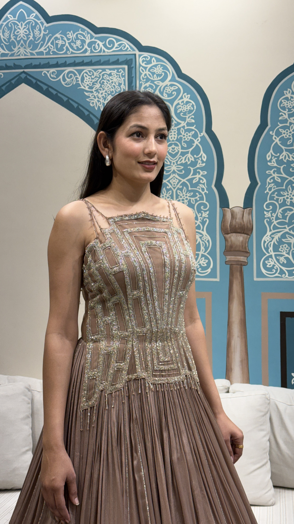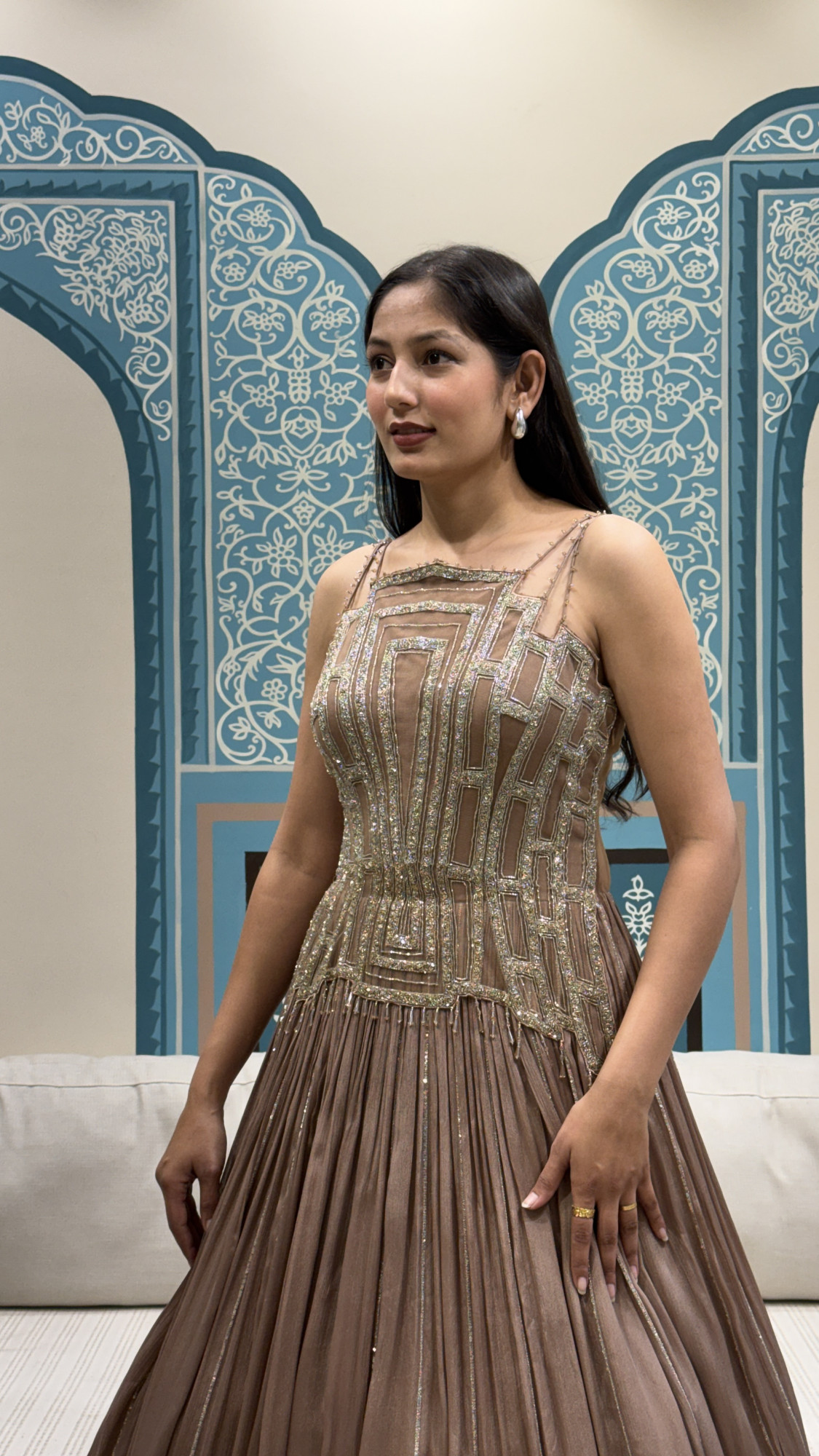 This elegant champagne-brown gown is a perfect blend of modern glam and timeless grace. The fitted corset-style bodice is designed with intricate geometric beadwork and sequin detailing, creating a bold, structured look with a luxe shine. The neckline is kept sleek with delicate thin straps, adding a soft and feminine touch. Flowing from the waist, the gown features a beautifully pleated skirt that moves effortlessly, highlighted with subtle shimmer lines and a minimal geometric border at the hem for a refined finish. With its clean back and flattering silhouette, this gown is ideal for cocktail parties, receptions, engagement nights, and evening celebrations where you want a statement yet sophisticated look.