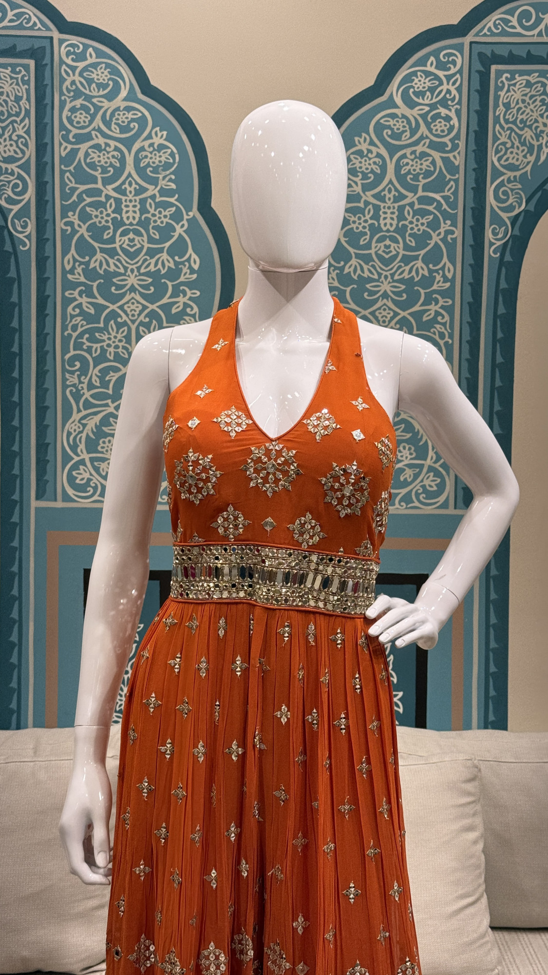 This statement orange jumpsuit is designed with a flattering halter neck and a fitted bodice adorned with intricate mirror embellishments, highlighted by a reflective waistband that adds structure and shine. The wide-leg silhouette flows beautifully with scattered mirror motifs and a heavily embellished hem, making it perfect for festive occasions, cocktail events, and modern ethnic celebrations.