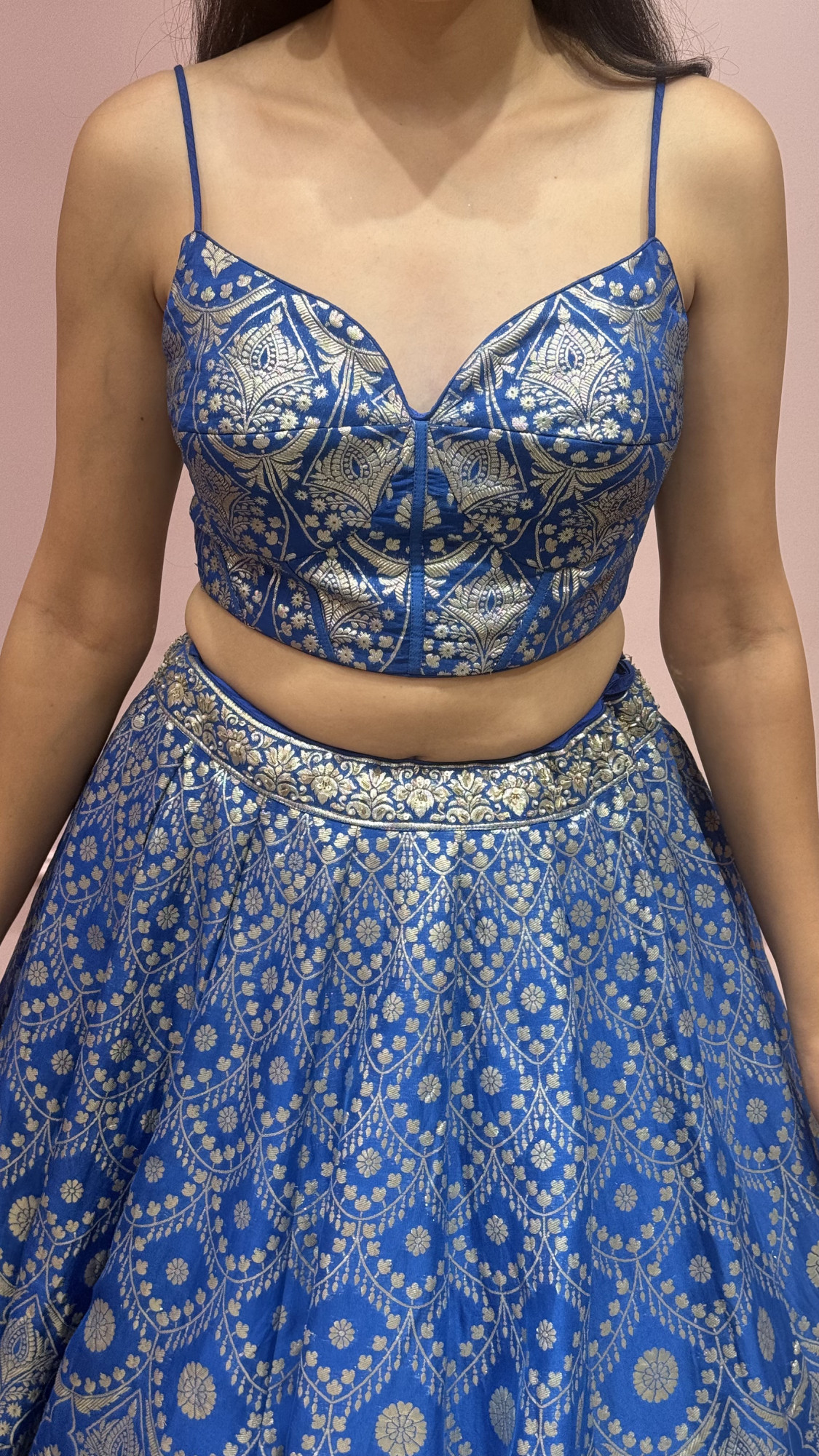 This royal blue lehenga features refined silver motifs that give it a rich and graceful appeal. The fitted blouse is paired with a matching embroidered jacket, adding a stylish layered touch to the outfit. Balanced and elegant, this lehenga set is perfect for weddings, receptions, and festive occasions where you want a classic yet modern look.