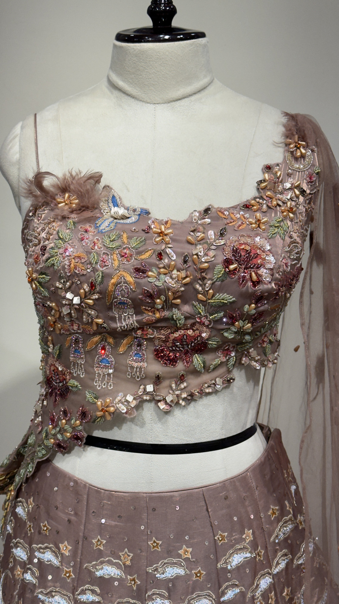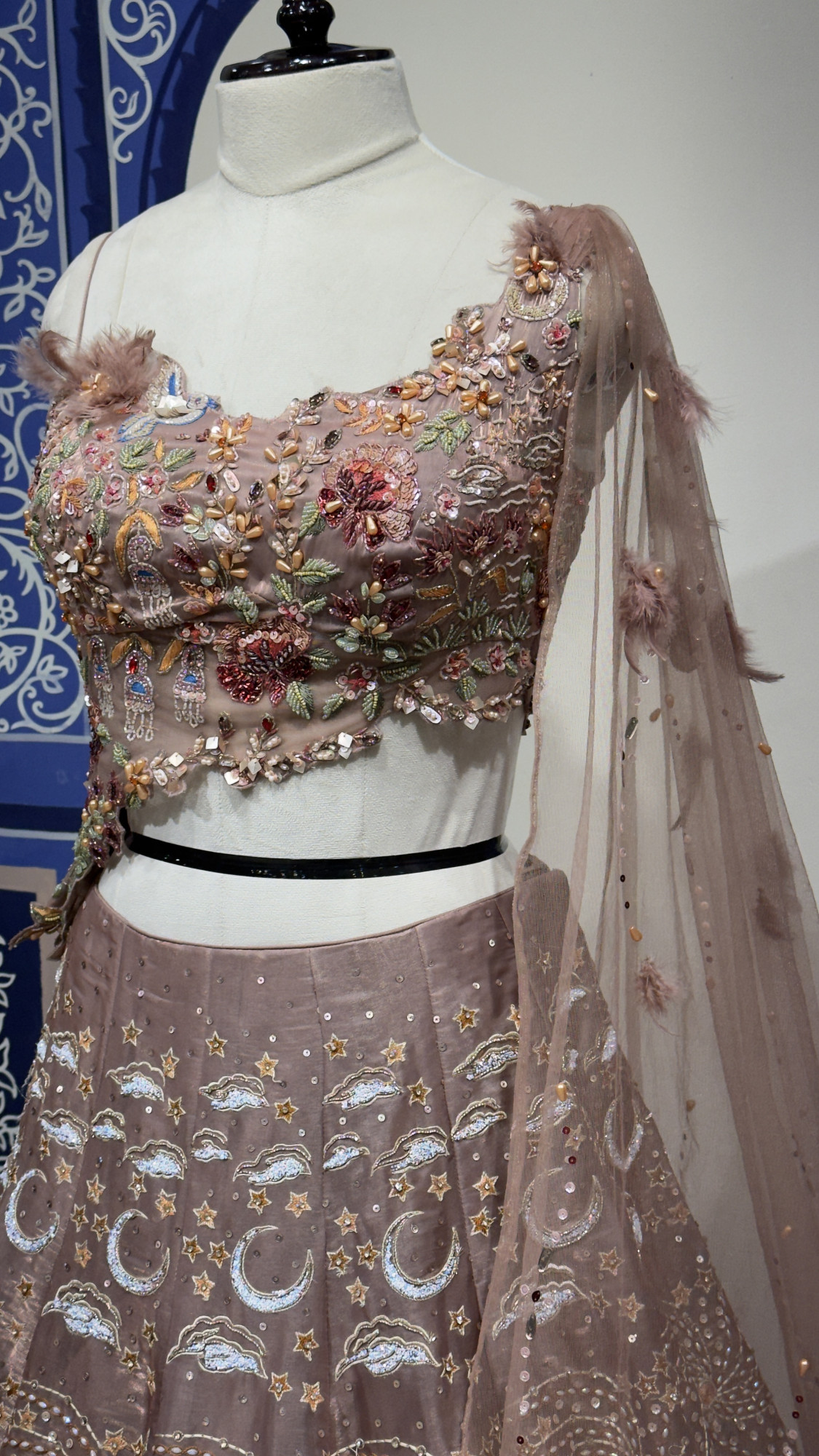 This mauve lehenga features a heavily embroidered blouse adorned with floral and bird-inspired detailing, highlighted with beads, sequins, and fine handwork. The flared skirt showcases artistic motifs of moons, stars, florals, and ornate patterns, creating a rich yet graceful appeal. Paired with a soft net dupatta with subtle embellishments, this ensemble is perfect for festive celebrations and special occasions.