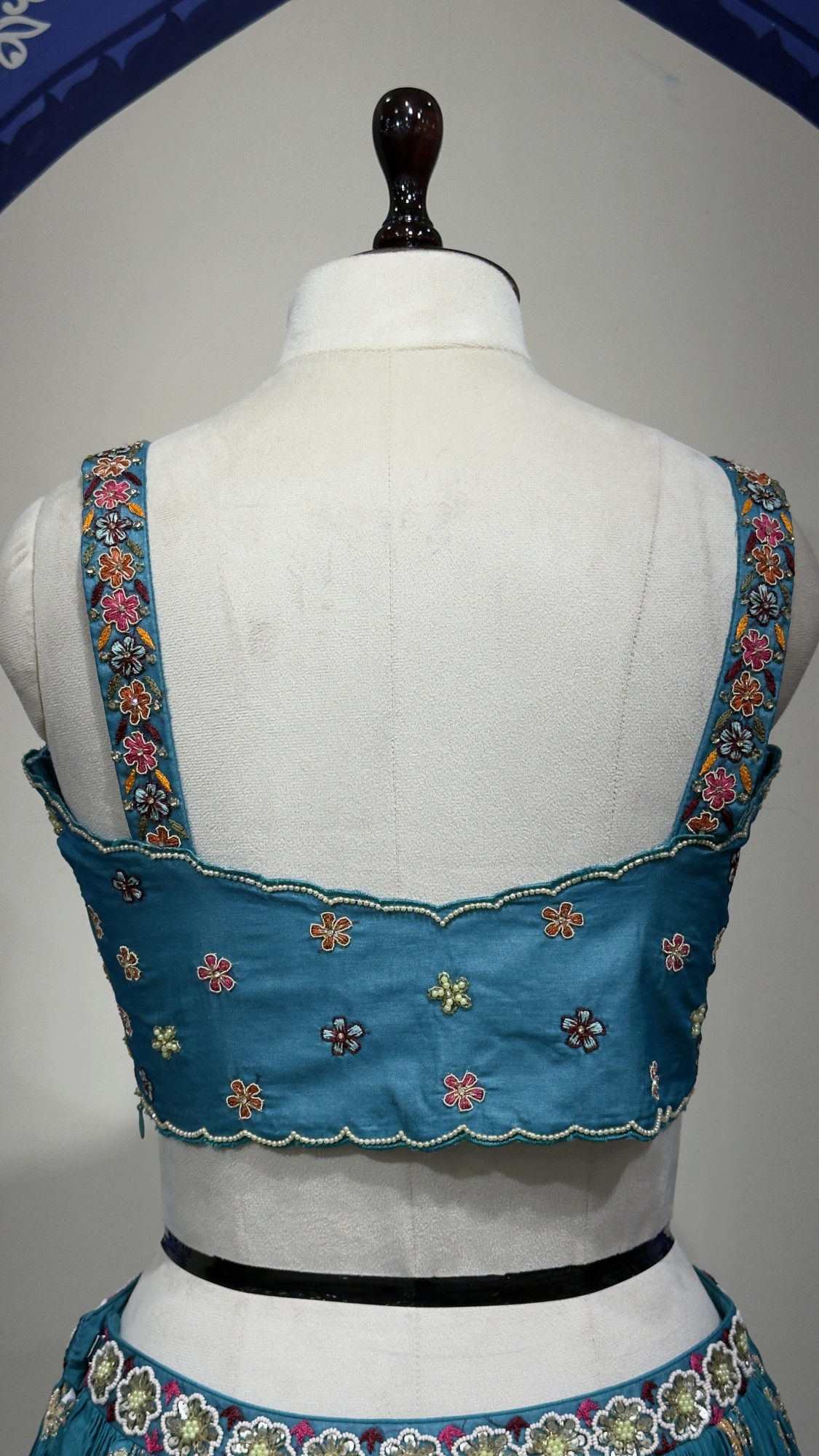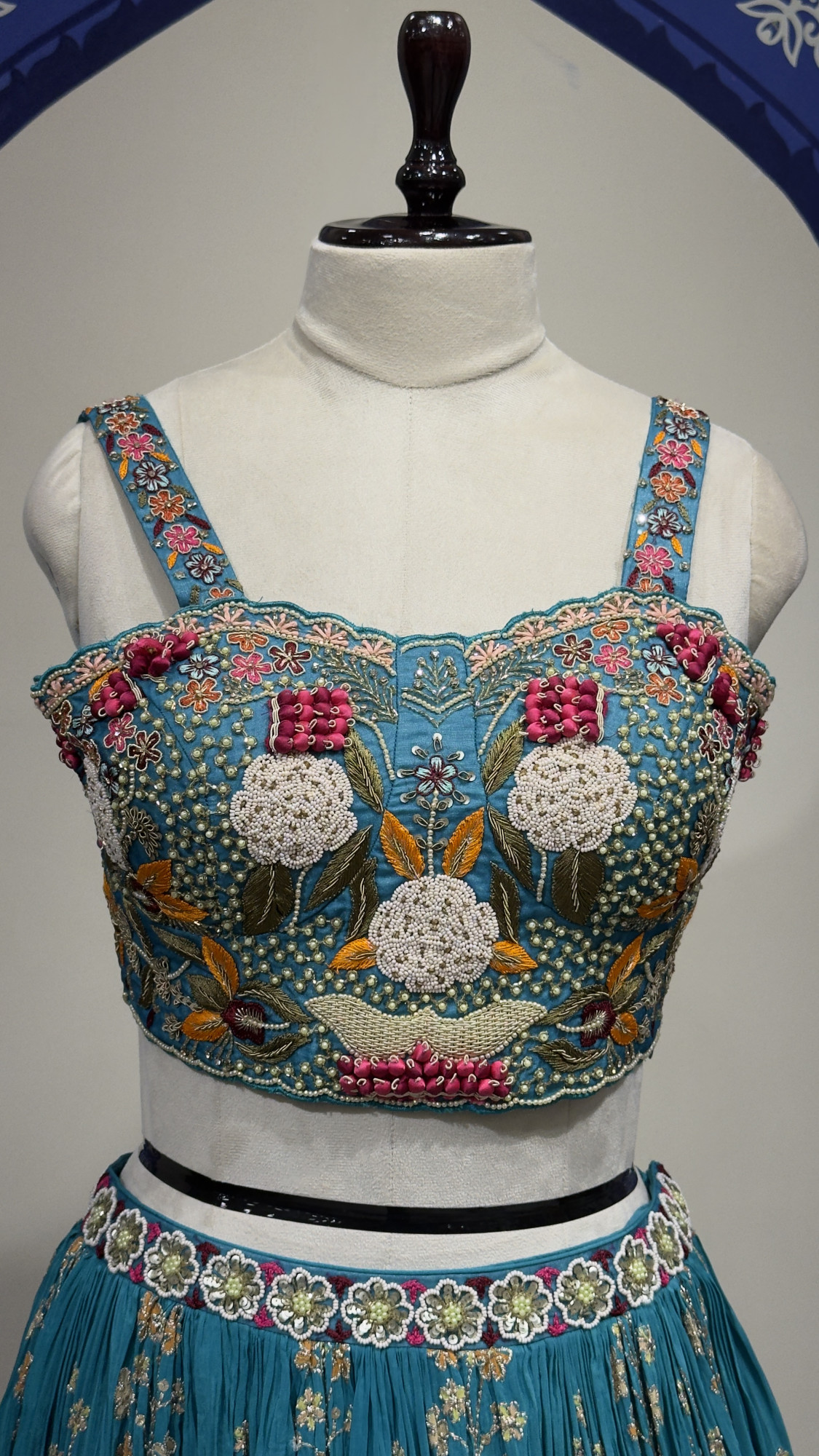 This dress includes a beautifully embroidered teal crop top with intricate floral and bead detailing, paired with a flowing skirt adorned with delicate embroidery throughout. The look is completed with a sheer net dupatta highlighted with floral accents, making it perfect for weddings, festive celebrations, and special occasions.
