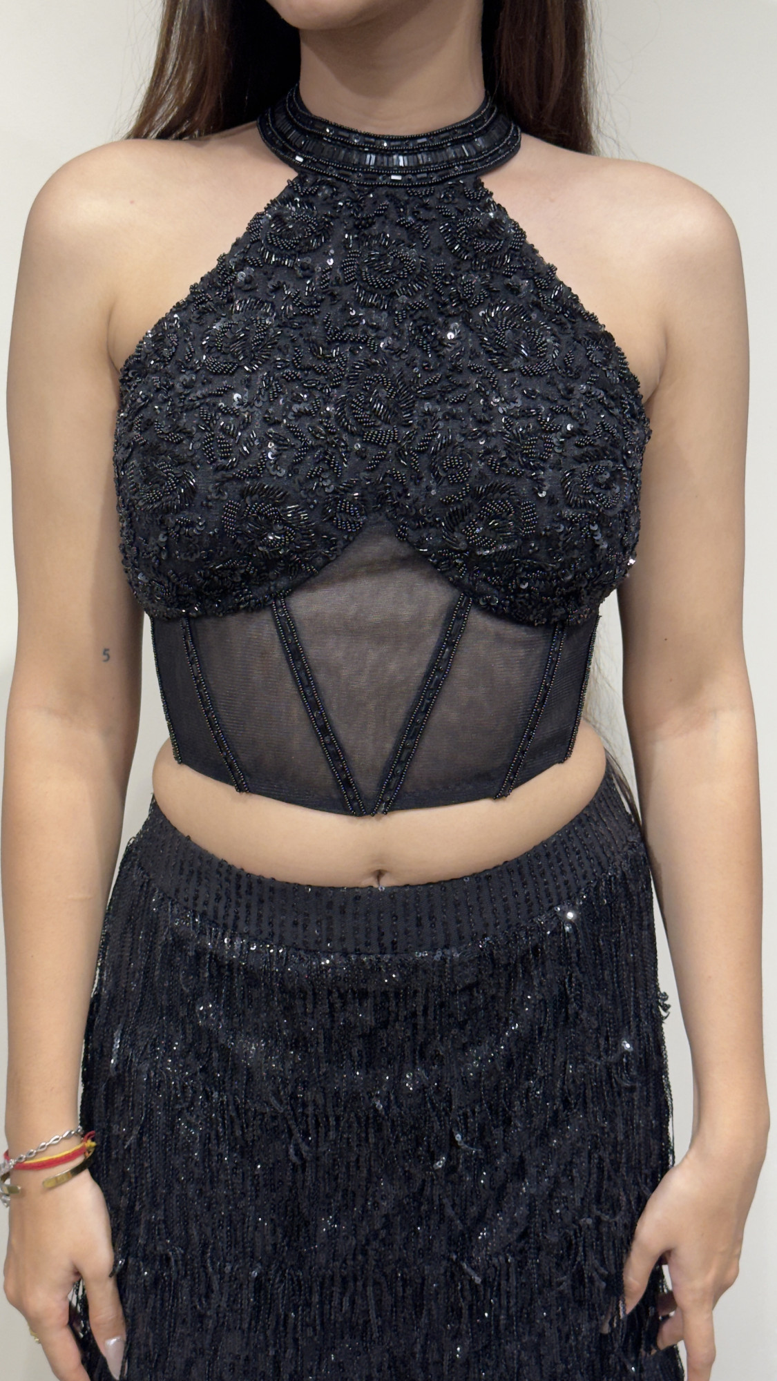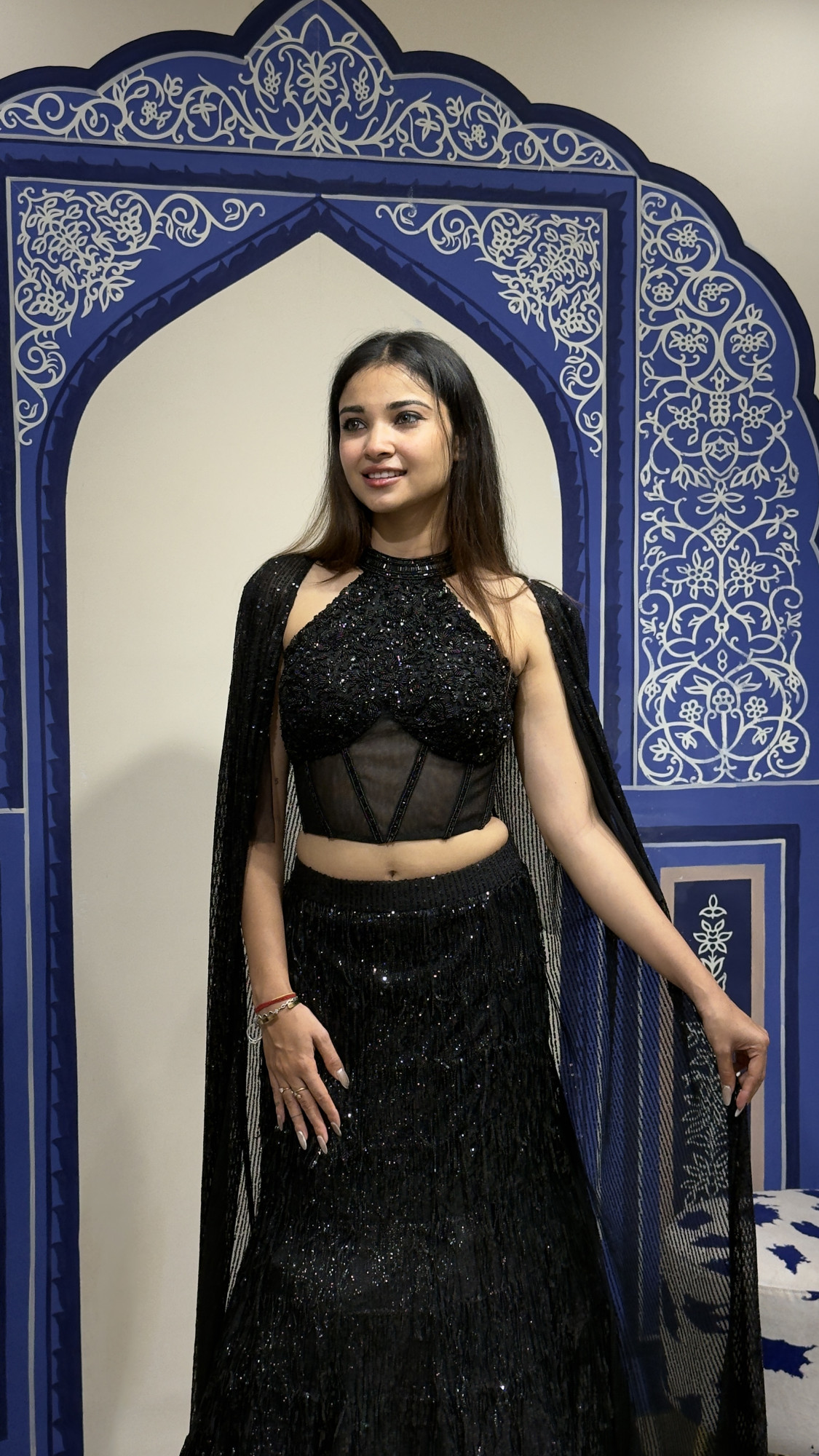 This black lehenga set showcases a heavily embellished halter-neck crop top with a sheer corset-style bodice, paired with a flared sequined lehenga skirt that adds subtle sparkle. The look is completed with an elegant cape-style dupatta, making it perfect for cocktail nights, receptions, and evening celebrations. A chic blend of glamour and contemporary elegance.