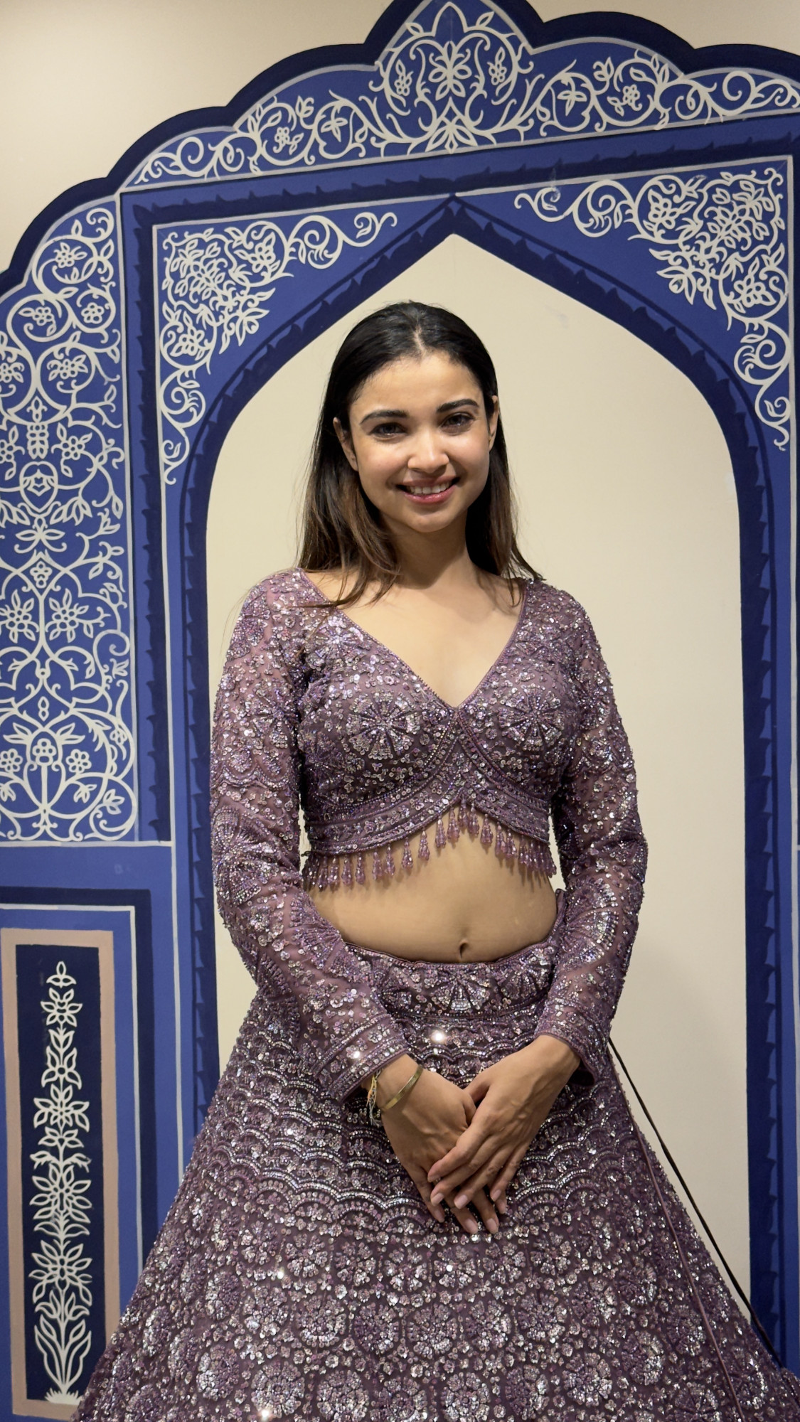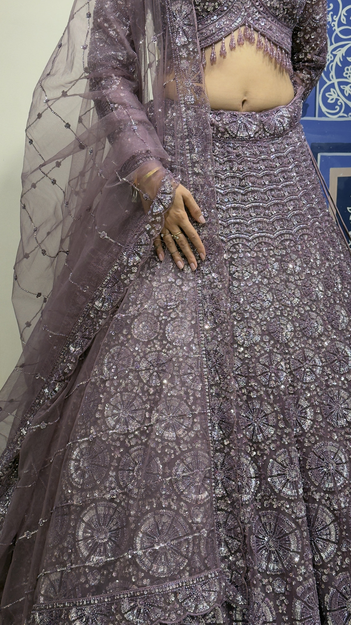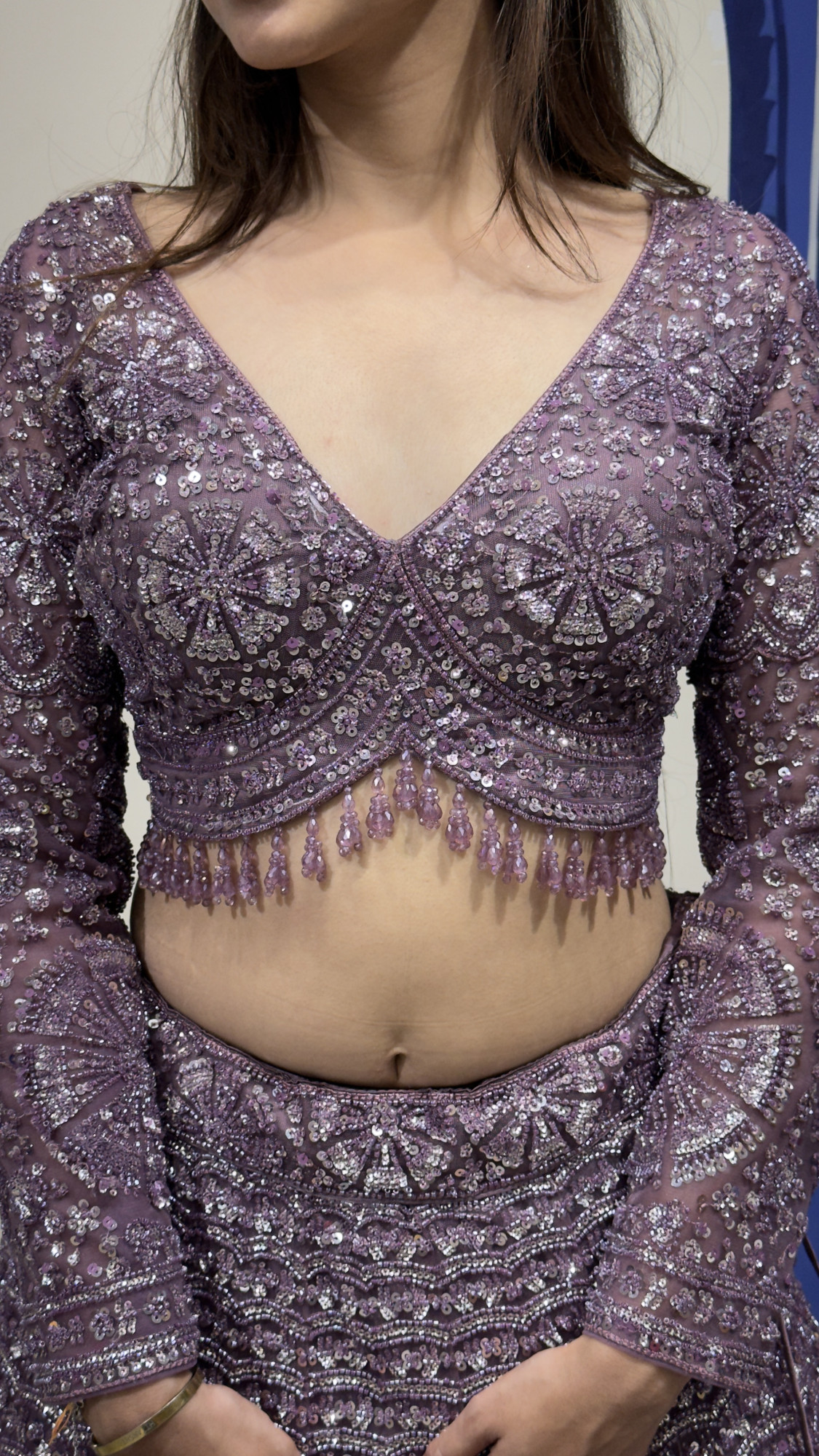 This lehenga features a richly embellished mauve blouse with full sleeves, delicate bead fringes, and a deep V neckline. The flared skirt is adorned with detailed circular sequin motifs, paired with a soft net dupatta that adds a graceful finish. Perfect for evening weddings, receptions, or festive celebrations where subtle glamour stands out.