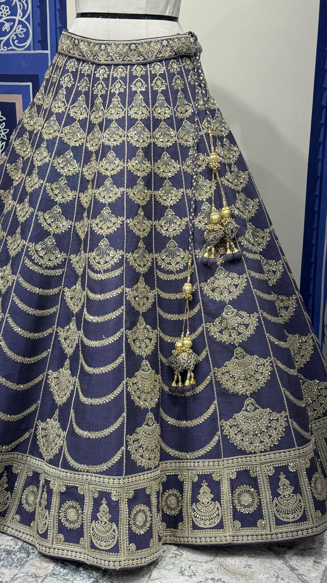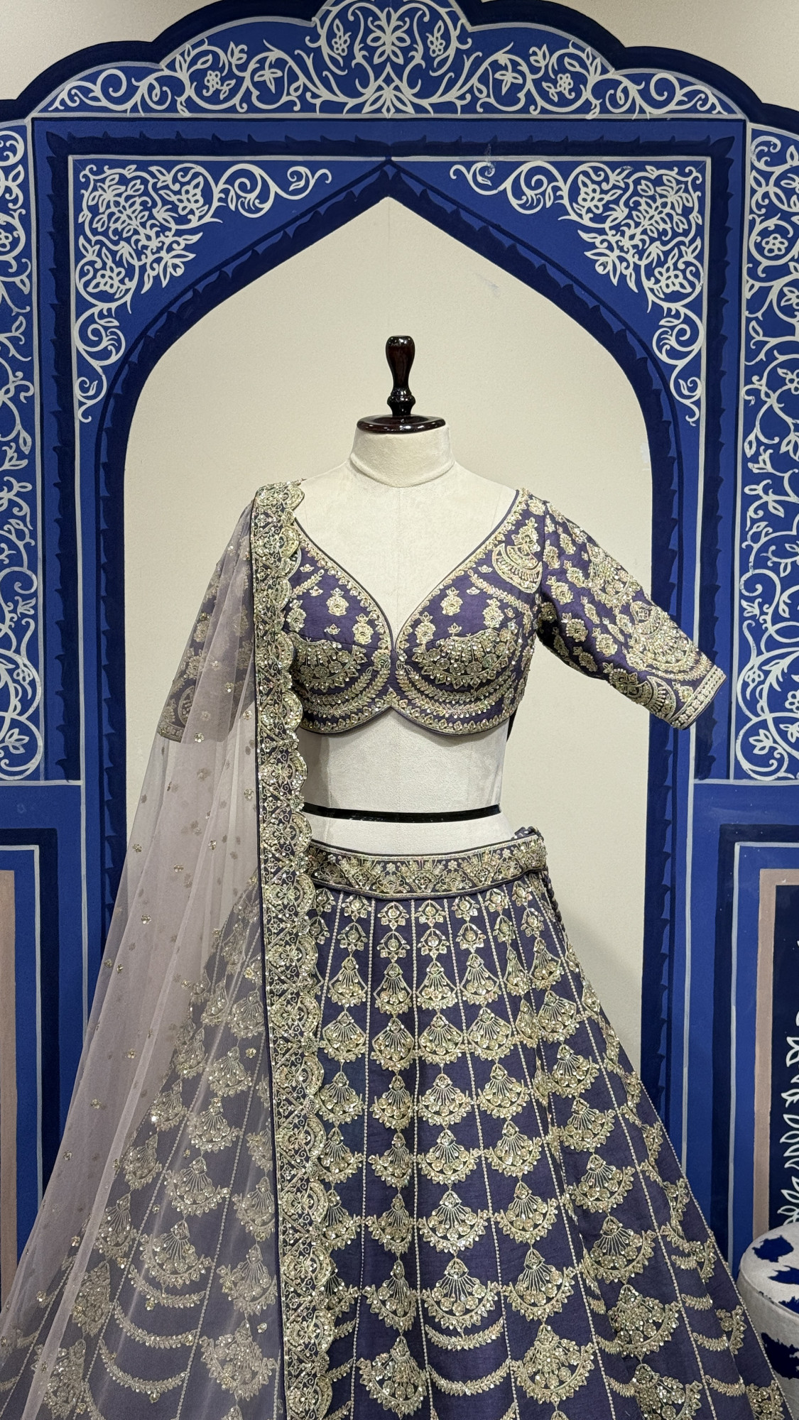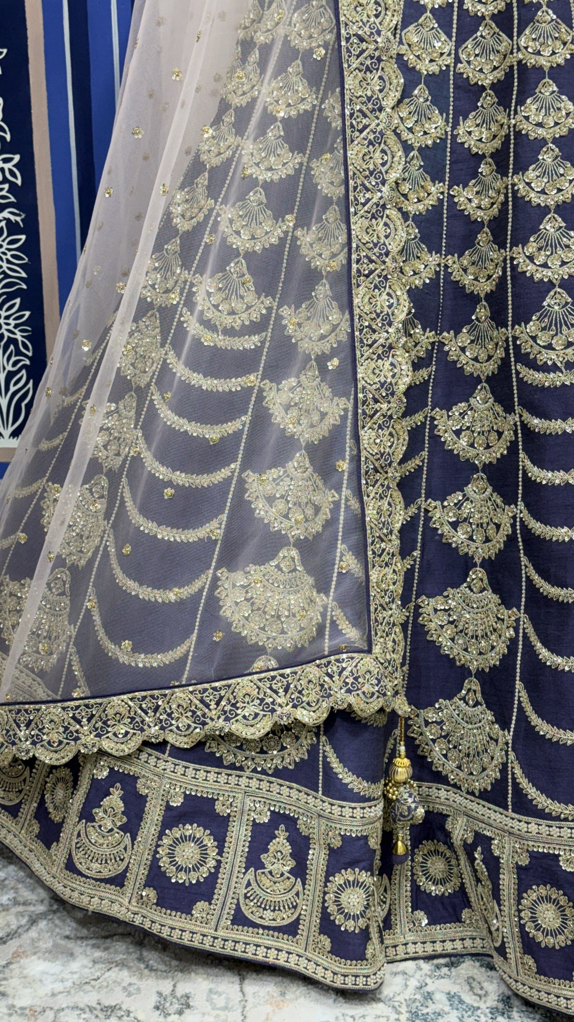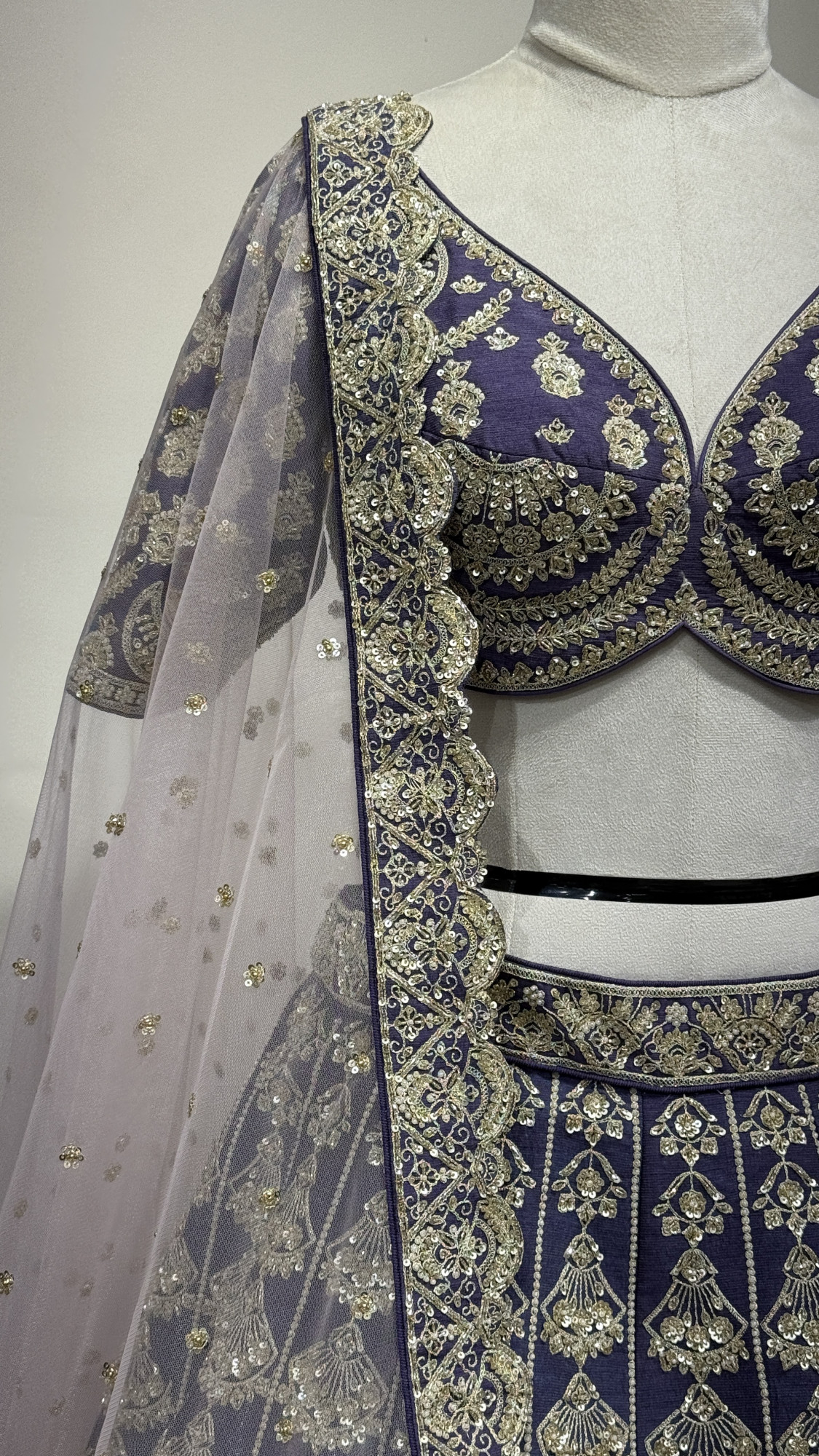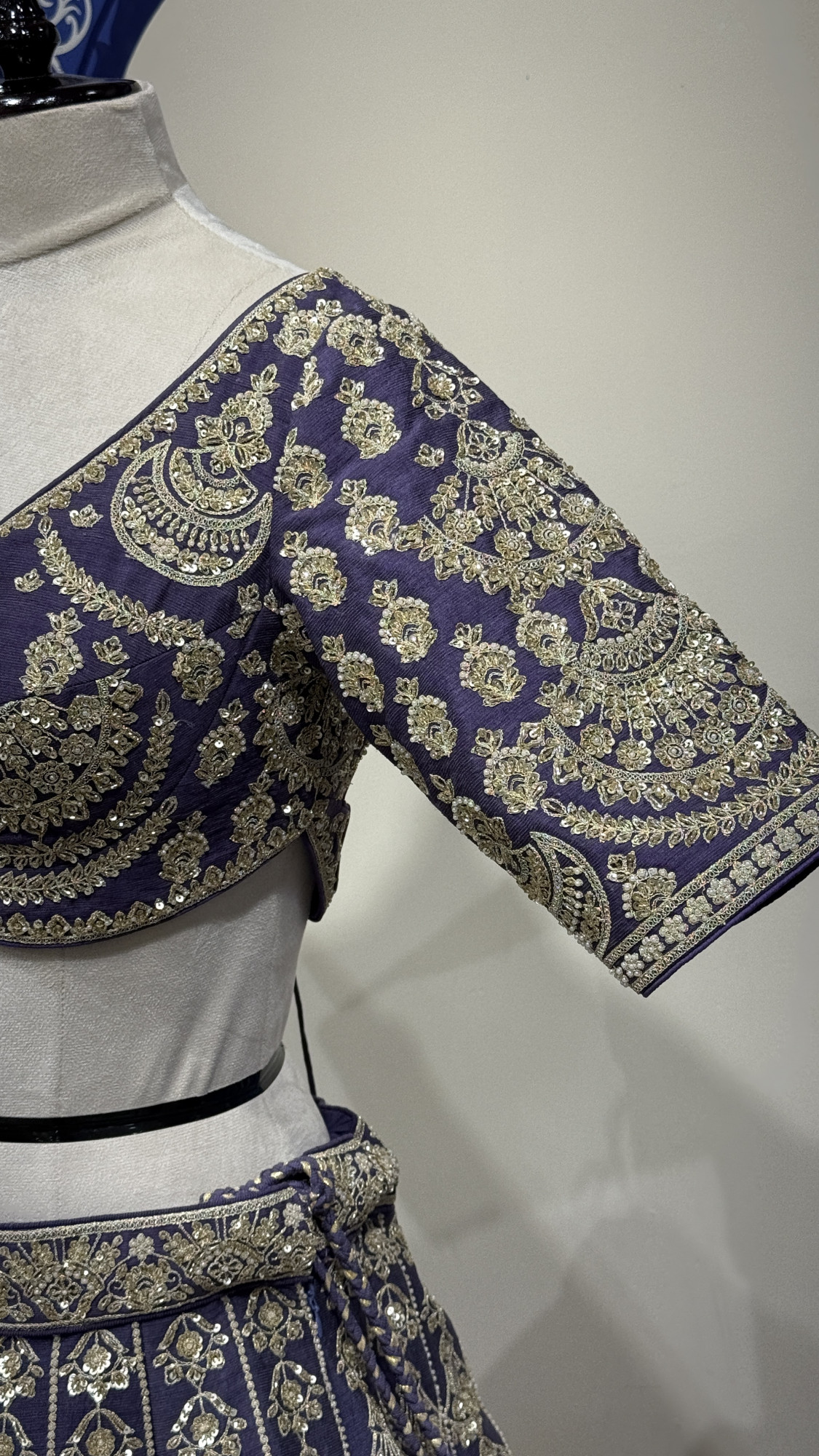 This elegant bridal lehenga features a rich purple base beautifully embellished with detailed gold zari and sequin work in traditional motifs. The blouse showcases heavy embroidery with a flattering neckline and structured sleeves, while the matching lehenga skirt flows gracefully with evenly spaced ornate patterns and a detailed border. Finished with a delicate net dupatta highlighted by embroidered accents, this ensemble is perfect for brides seeking a royal yet timeless look.