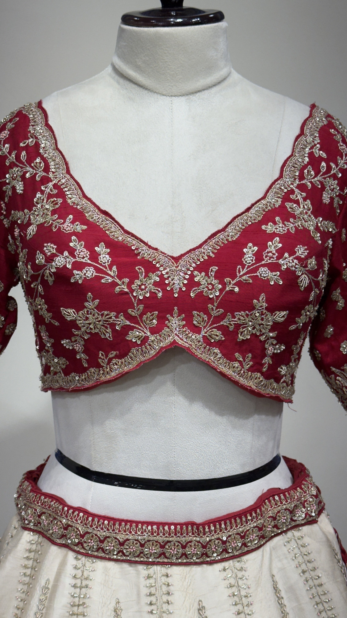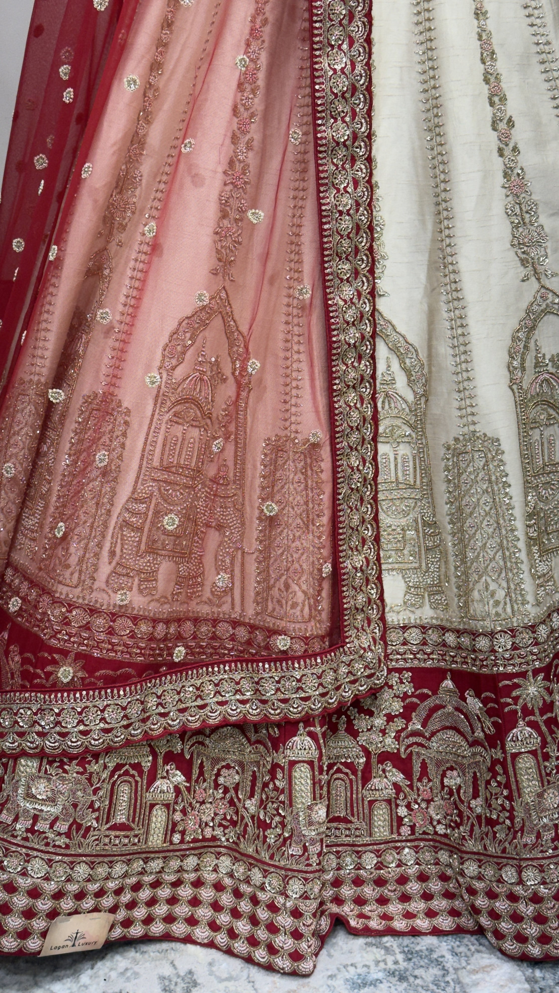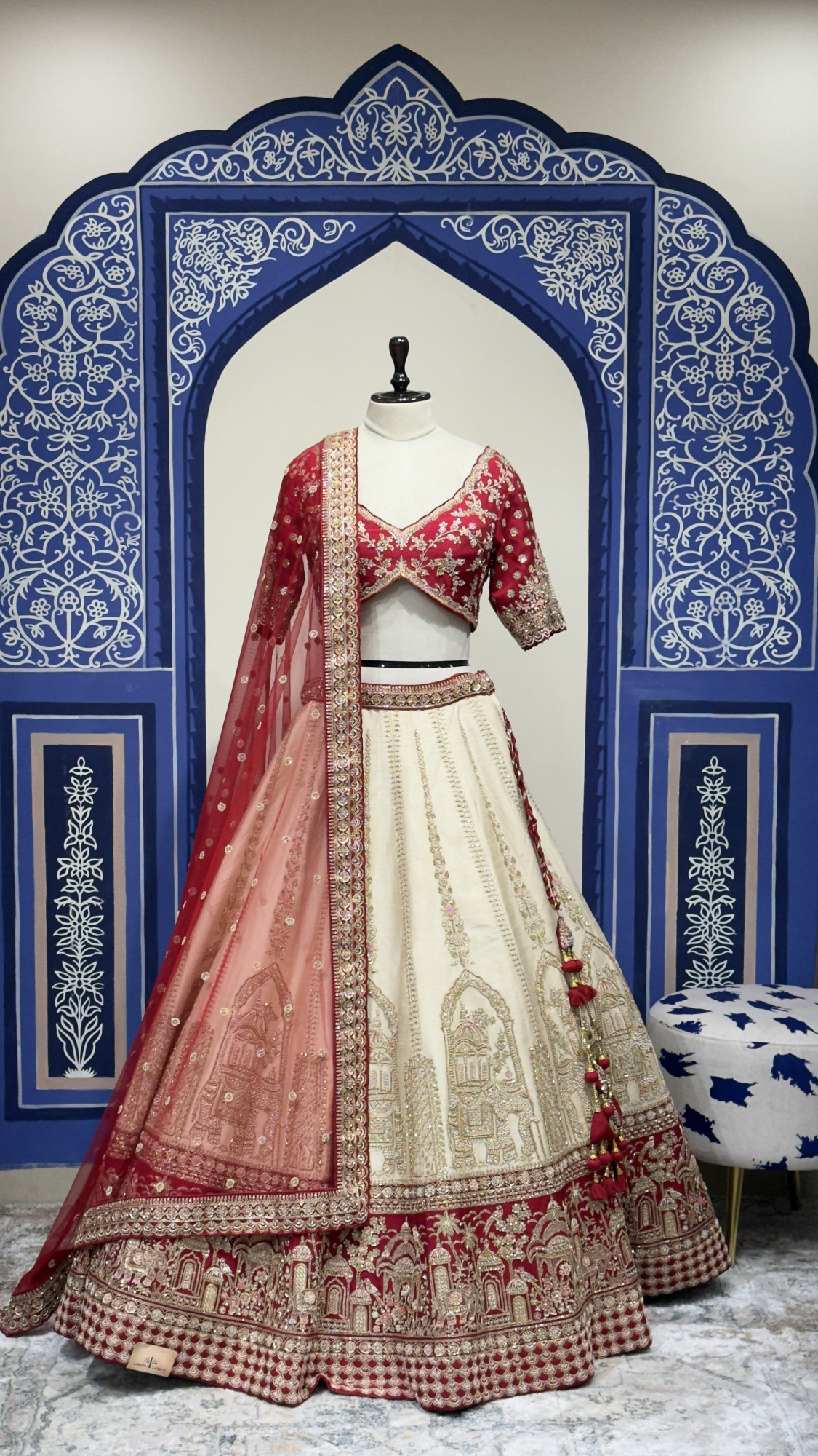 This elegant bridal lehenga features a rich red embroidered blouse paired with an ivory lehenga skirt adorned with fine zari, sequin, and architectural motif embroidery. The detailed borders and panel work add depth and grandeur, while the contrasting red dupatta with ornate edging completes the ensemble. Designed to balance tradition and sophistication, this outfit is perfect for brides who want a classic yet striking wedding look.