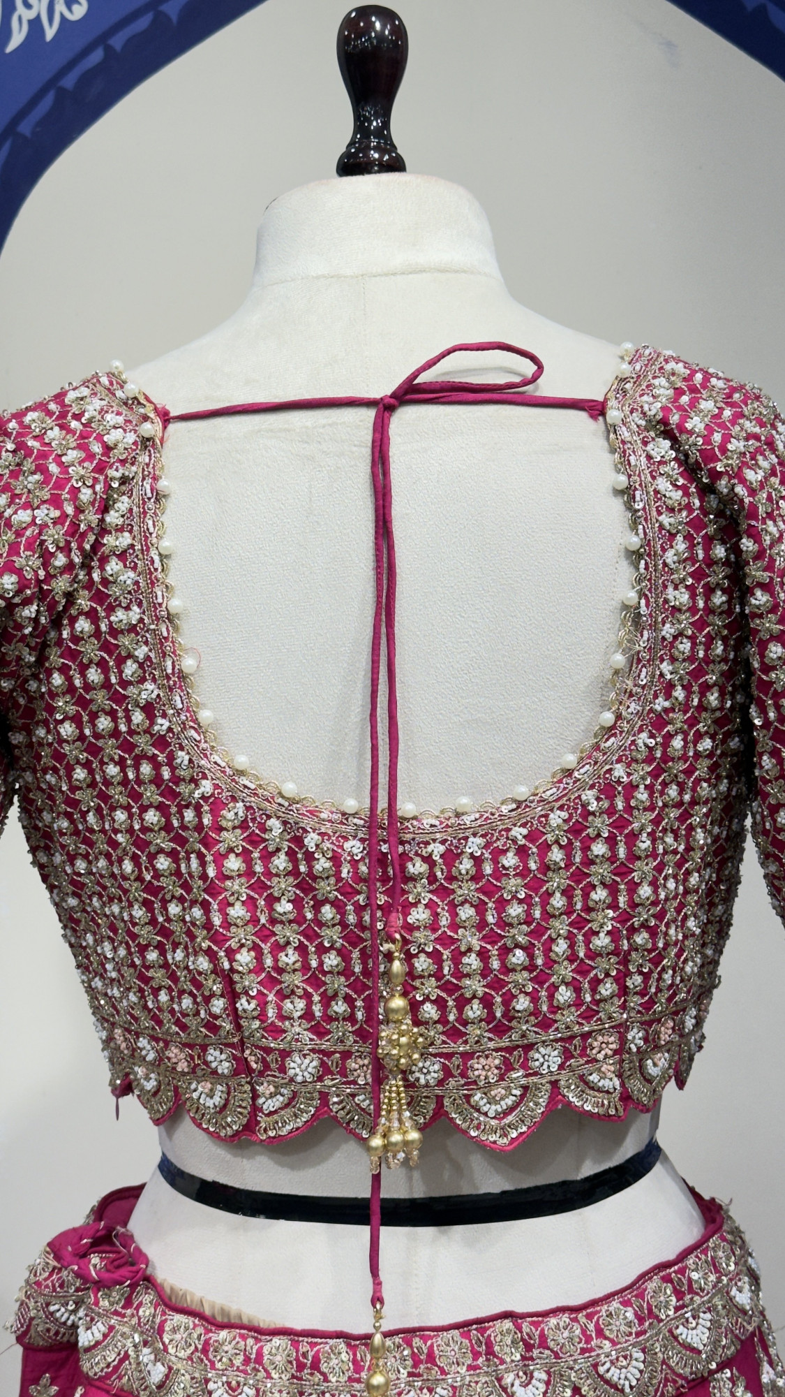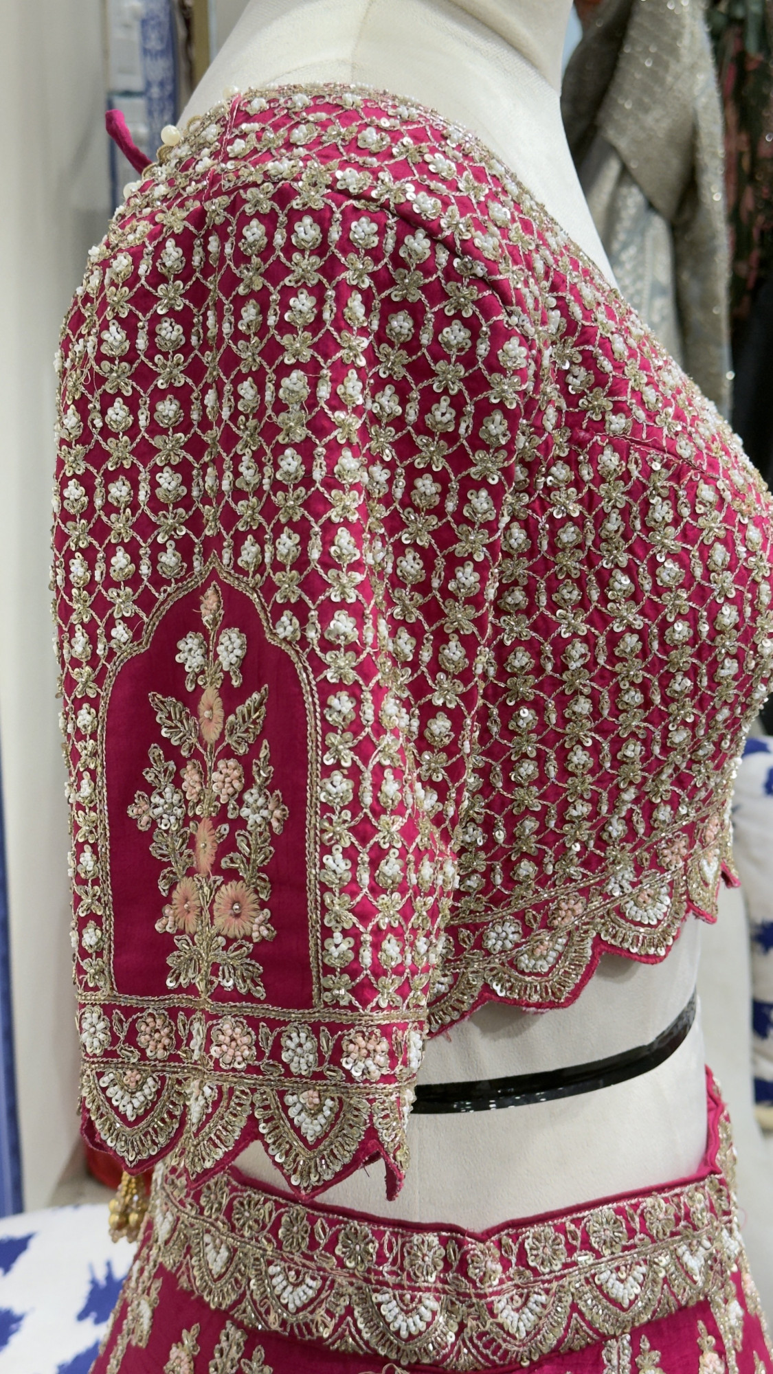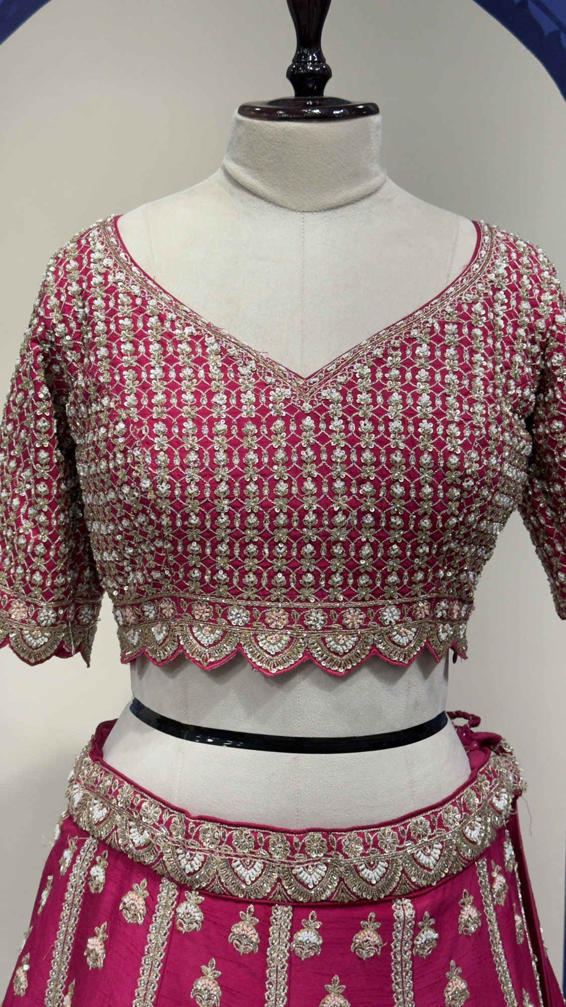 This stunning bridal lehenga set features a deep magenta base highlighted with exquisite zari, sequins, and floral hand embroidery throughout. The V-neck blouse showcases detailed jaal work with a scalloped embroidered hem and an elegant tie-up back finished with delicate latkans. The lehenga skirt is richly embellished with vertical motifs and grand architectural panels, finished with a heavy ornate border for a royal look. Paired with a sheer embroidered dupatta with a scalloped border, this ensemble is perfect for brides who want a classic yet luxurious statement on their big day.