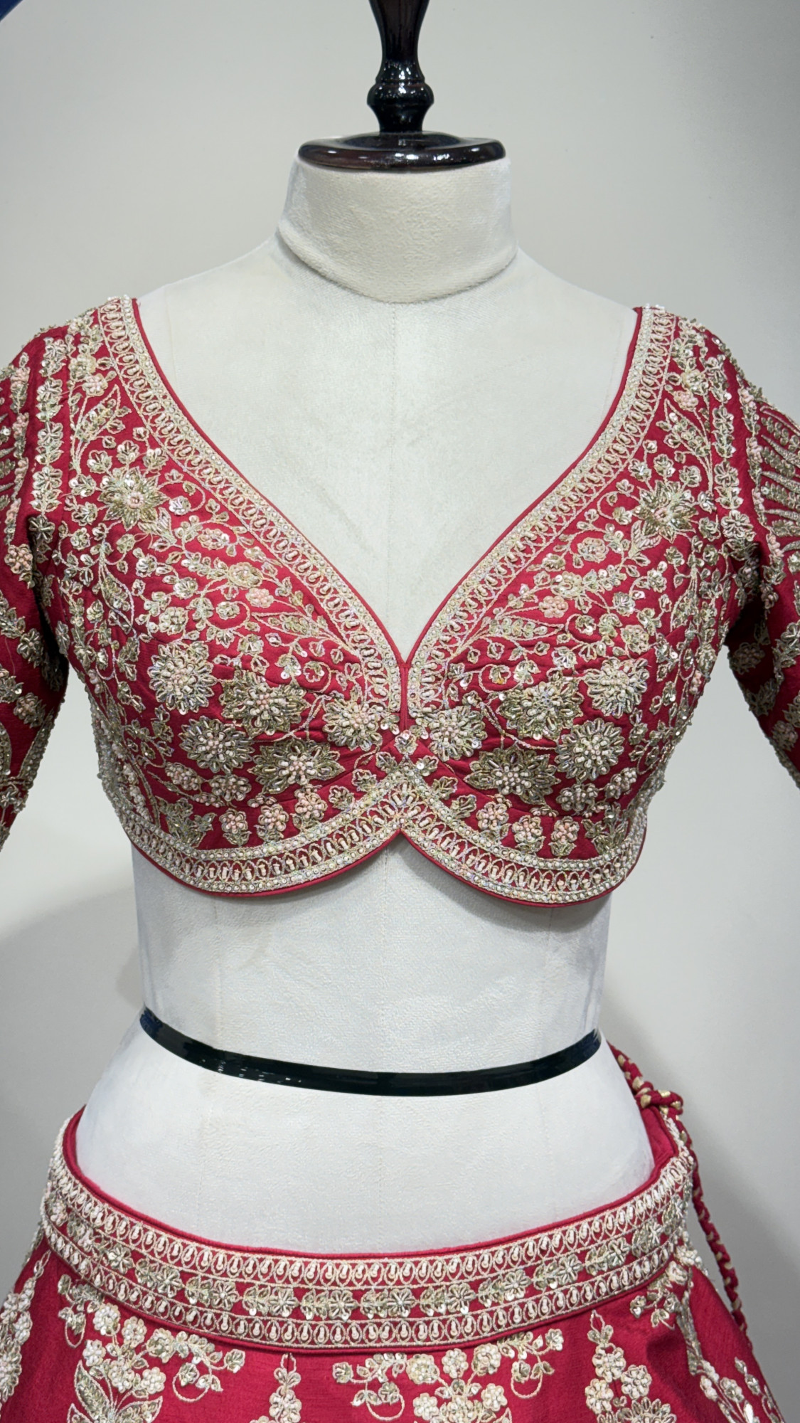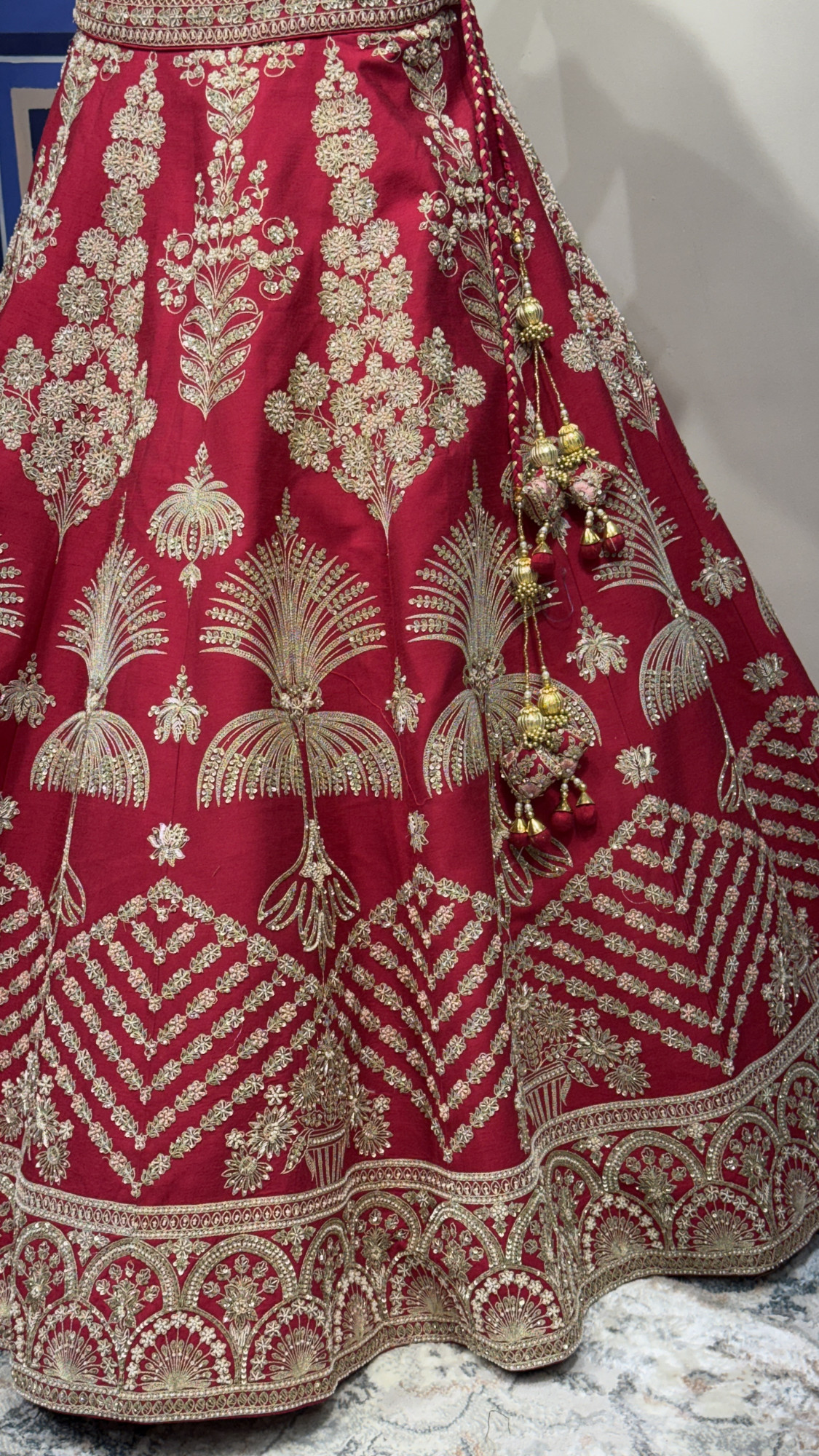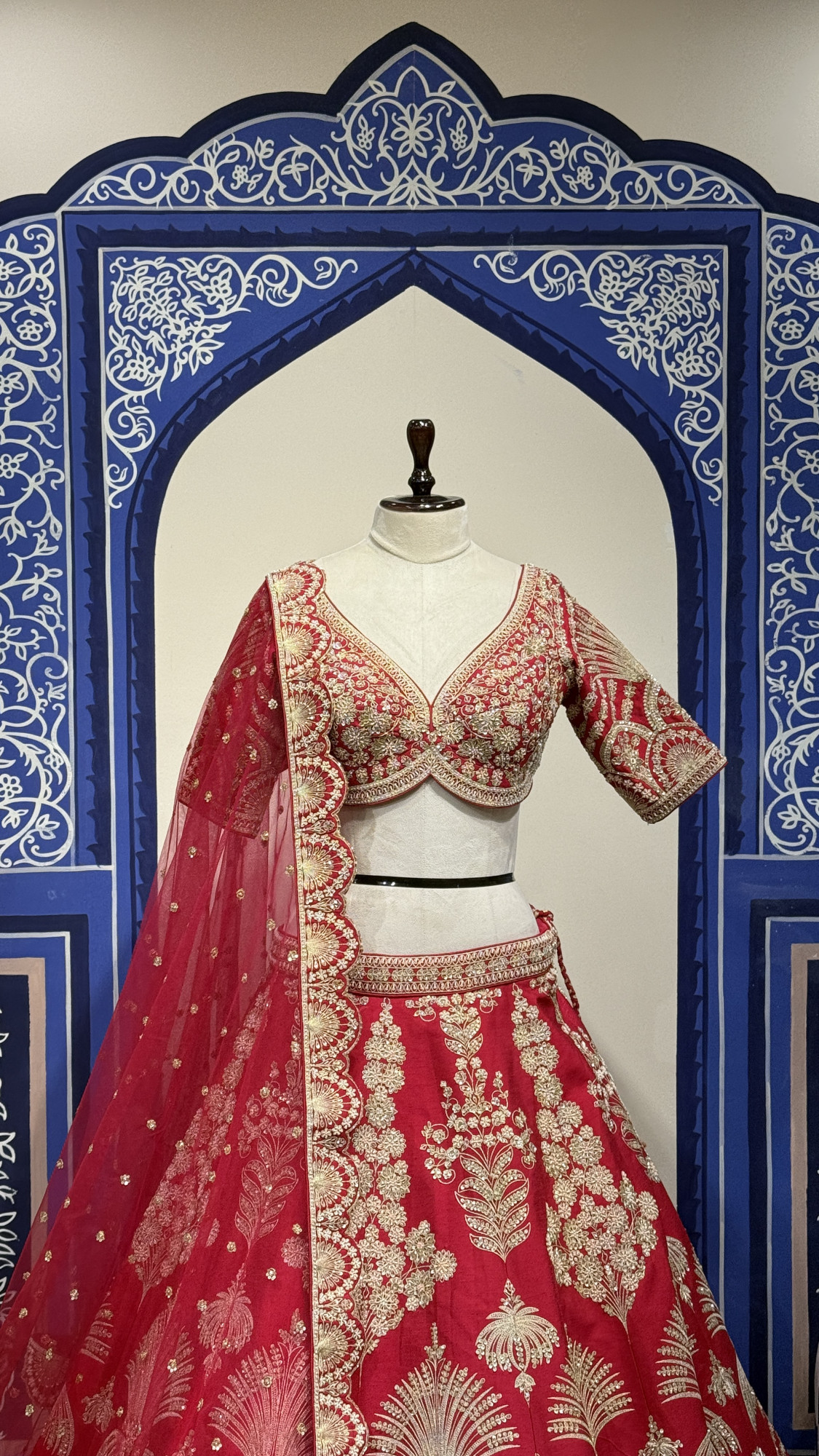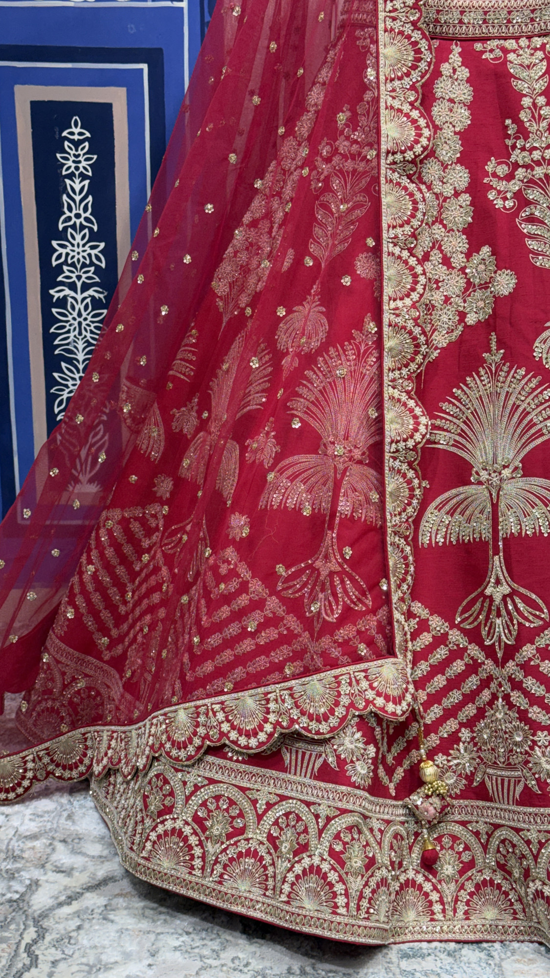 This classic bridal lehenga is crafted in a rich red hue and adorned with detailed zari and sequin embroidery throughout. The embroidered blouse with a deep neckline and tie-up back pairs beautifully with the heavily worked lehenga skirt, while the sheer dupatta with an ornate scalloped border completes the look with graceful elegance.