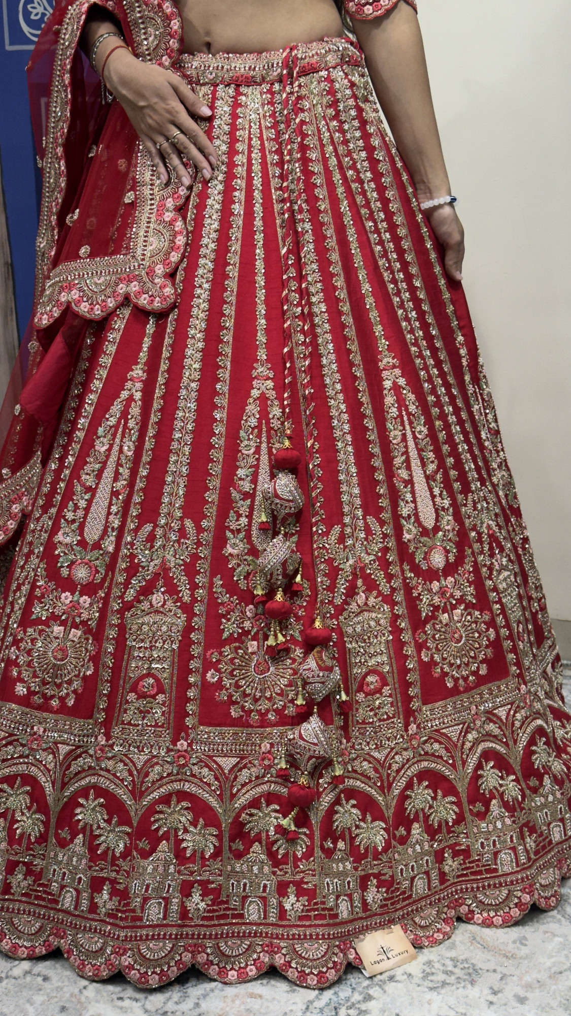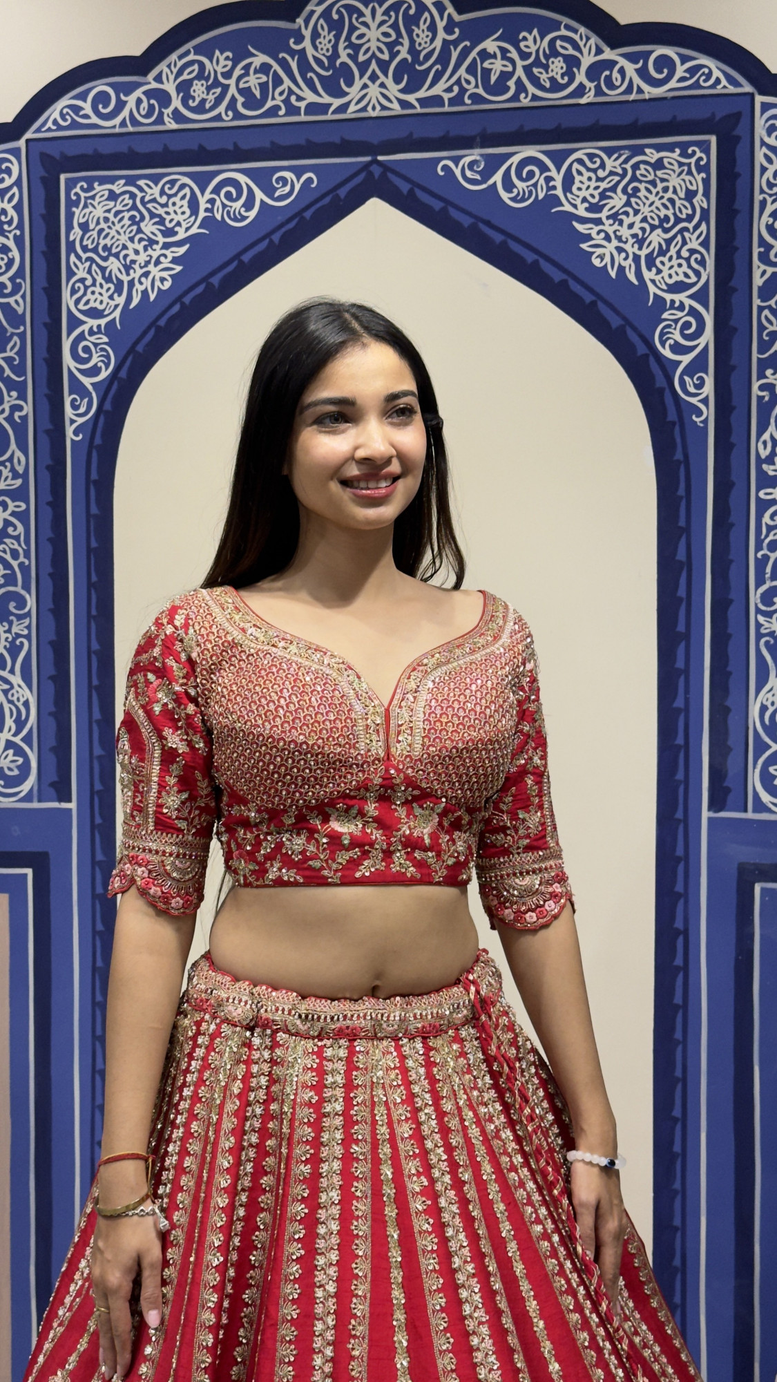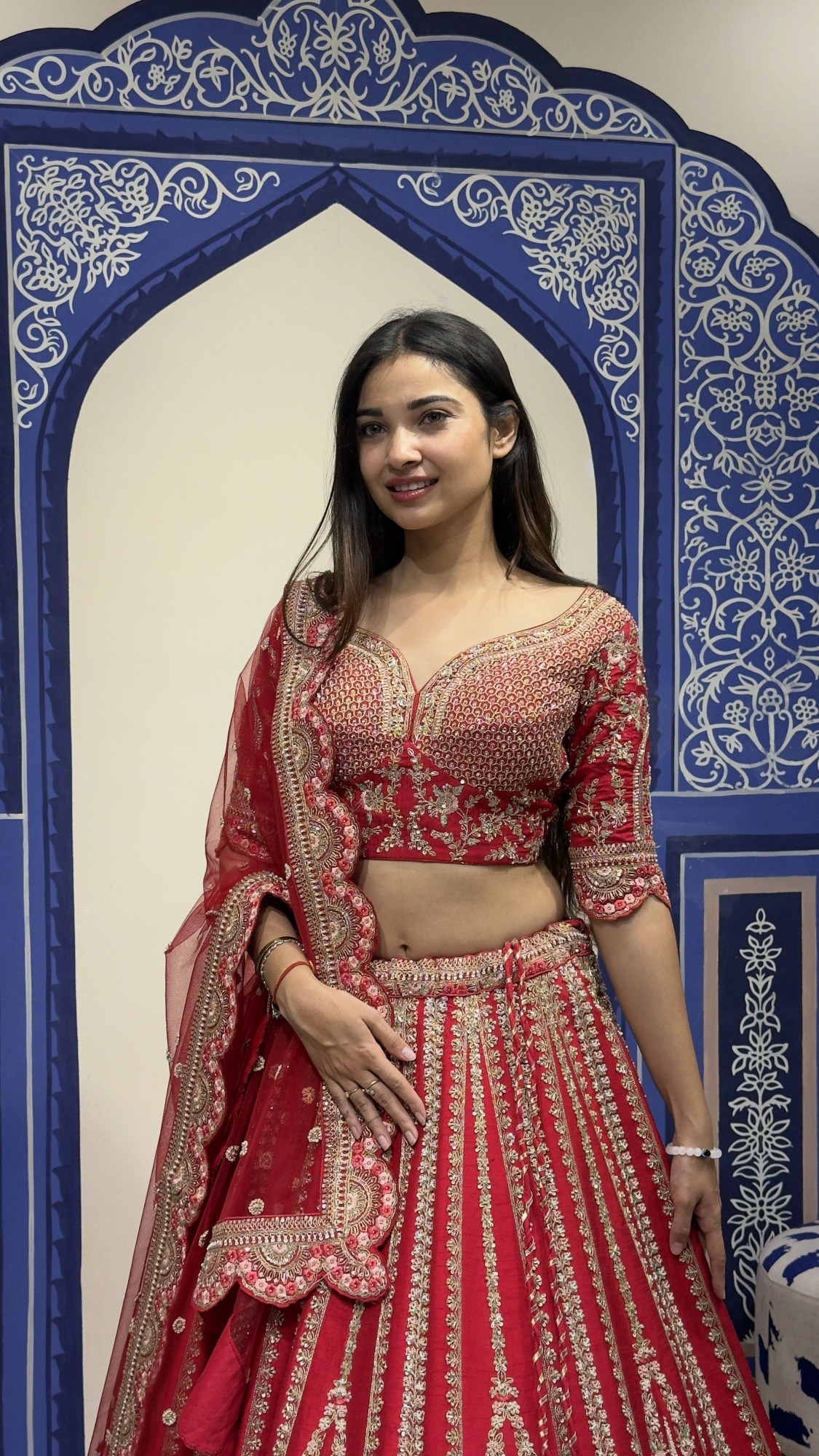 This elegant bridal lehenga is crafted in a rich red hue and adorned with detailed zari and sequin embroidery throughout. The beautifully embroidered blouse with a deep neckline and tie-up back adds charm, while the flared lehenga skirt showcases vertical motifs and a heavily embellished border. Paired with a sheer dupatta finished with a scalloped embroidered edge, this ensemble perfectly captures traditional bridal grace and royal elegance.