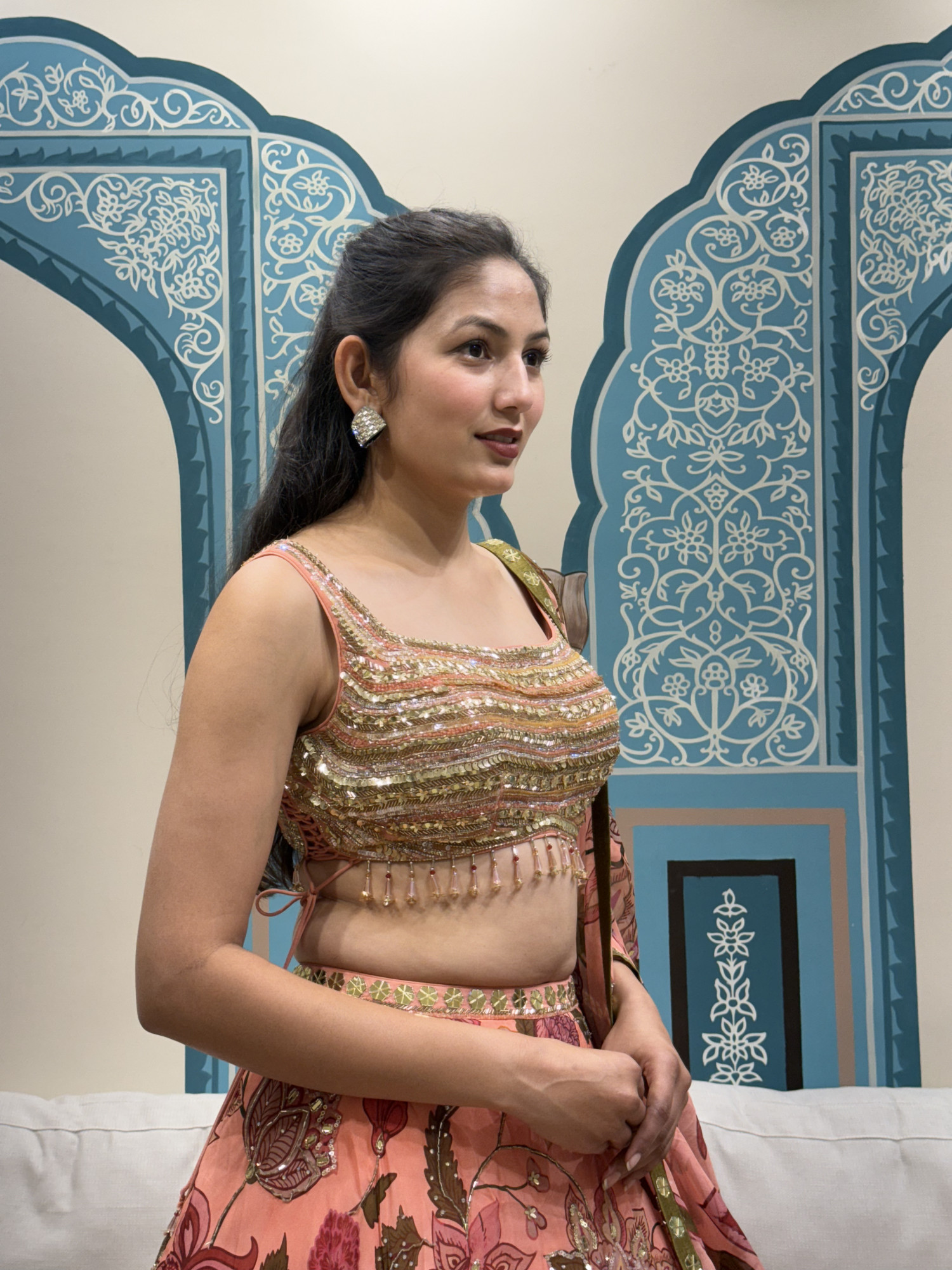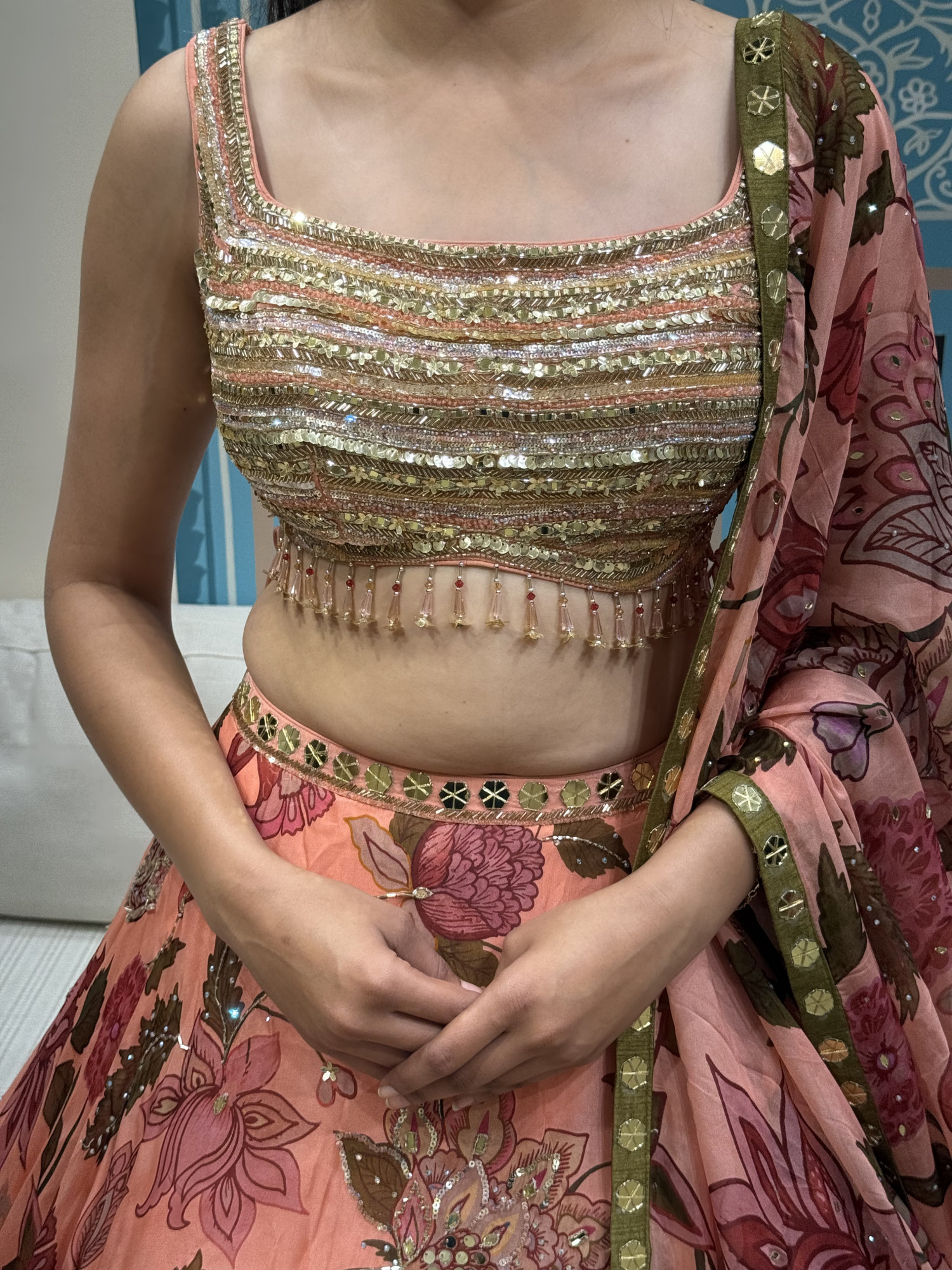 This peach lehenga features beautiful floral patterns with light sequin work that adds a gentle shine. The blouse is embellished with fine detailing and delicate tassels, while the printed dupatta completes the look with elegance. A perfect choice for festive gatherings and daytime celebrations.