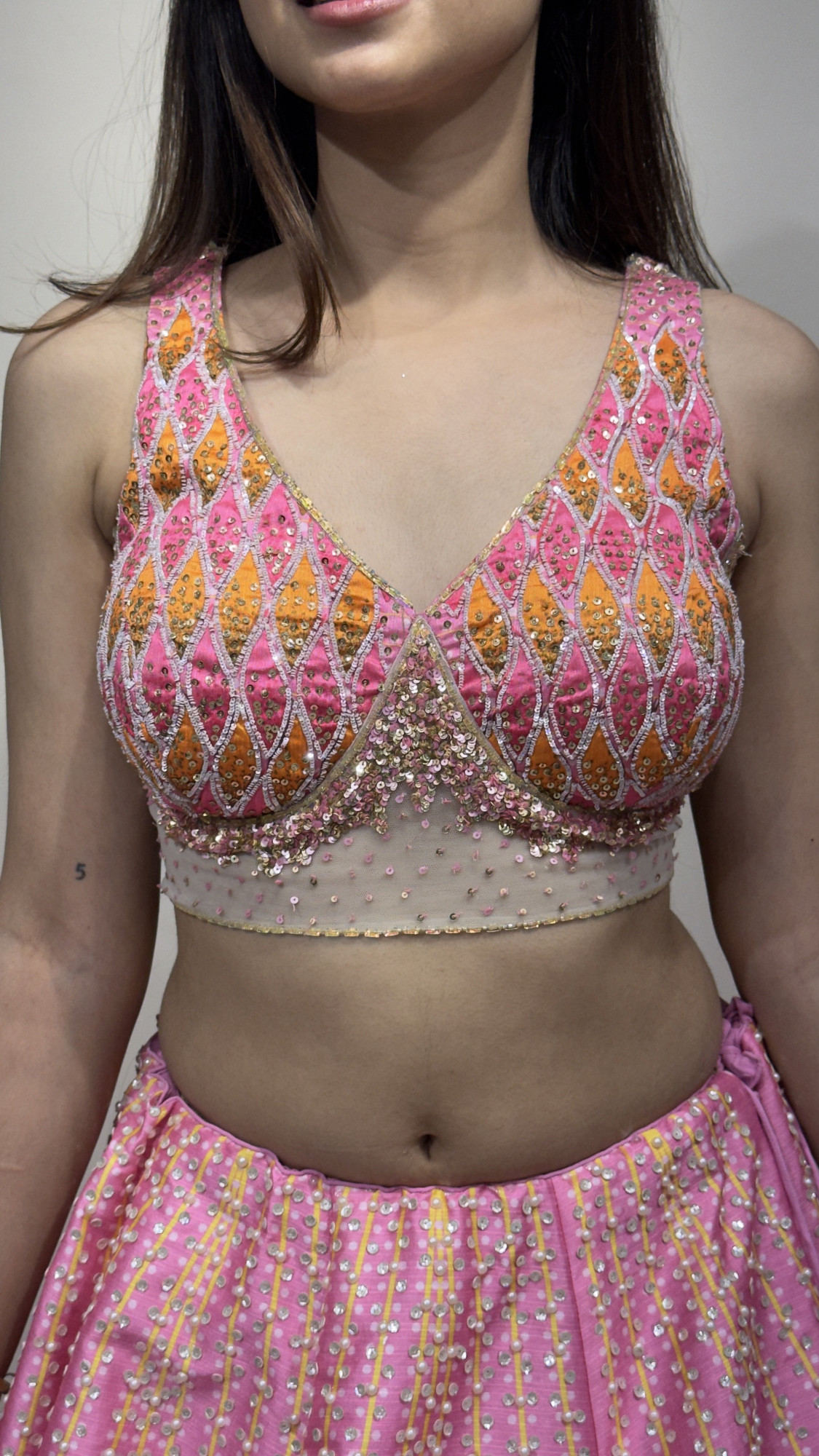 This lively lehenga features a bright pink base highlighted with delicate sequin lines and striking hand-painted mandala designs along the hem. The embroidered blouse stands out with geometric patterns, mirror and sequin detailing, and a sheer embellished waistband for a modern touch. Paired with a printed and embellished dupatta, this ensemble feels fresh, colorful, and ideal for mehendi, haldi, or daytime wedding festivities.