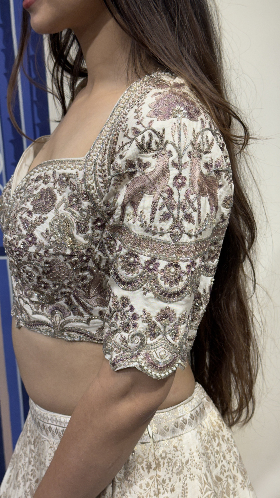 This exquisite lehenga set is crafted in an elegant ivory base adorned with delicate gold zari and mauve thread embroidery. The blouse stands out with fine floral and peacock-inspired motifs, beautifully detailed on the sleeves and back, adding a touch of artistry. The lehenga skirt flows into a subtle blush ombré at the hem, enhanced with intricate woven patterns for a luxurious finish. Paired with a lightweight embroidered dupatta, this ensemble is perfect for brides, receptions, and refined wedding celebrations.