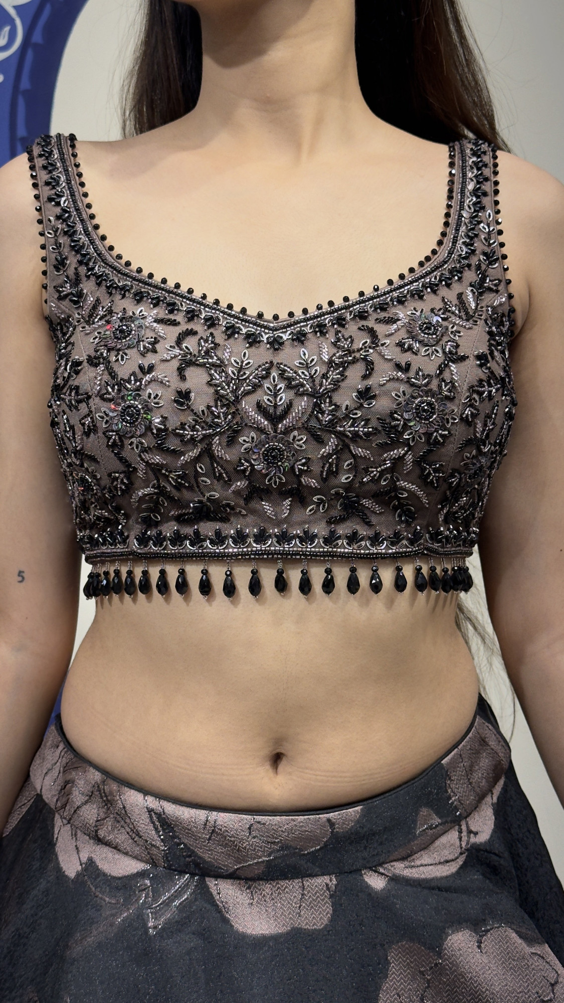 This striking lehenga showcases a sleeveless blouse adorned with intricate black and bronze-toned embroidery, highlighted with delicate beadwork and a fringe detail along the hem for added movement. The deep scoop neckline enhances its modern appeal, while the finely crafted back maintains a clean, elegant finish. Paired with it is a flowing black lehenga skirt detailed with oversized floral motifs in subtle metallic hues, creating a beautiful contrast and depth. Perfect for cocktail functions, receptions, or festive celebrations, this ensemble blends modern glamour with artisanal craftsmanship effortlessly.