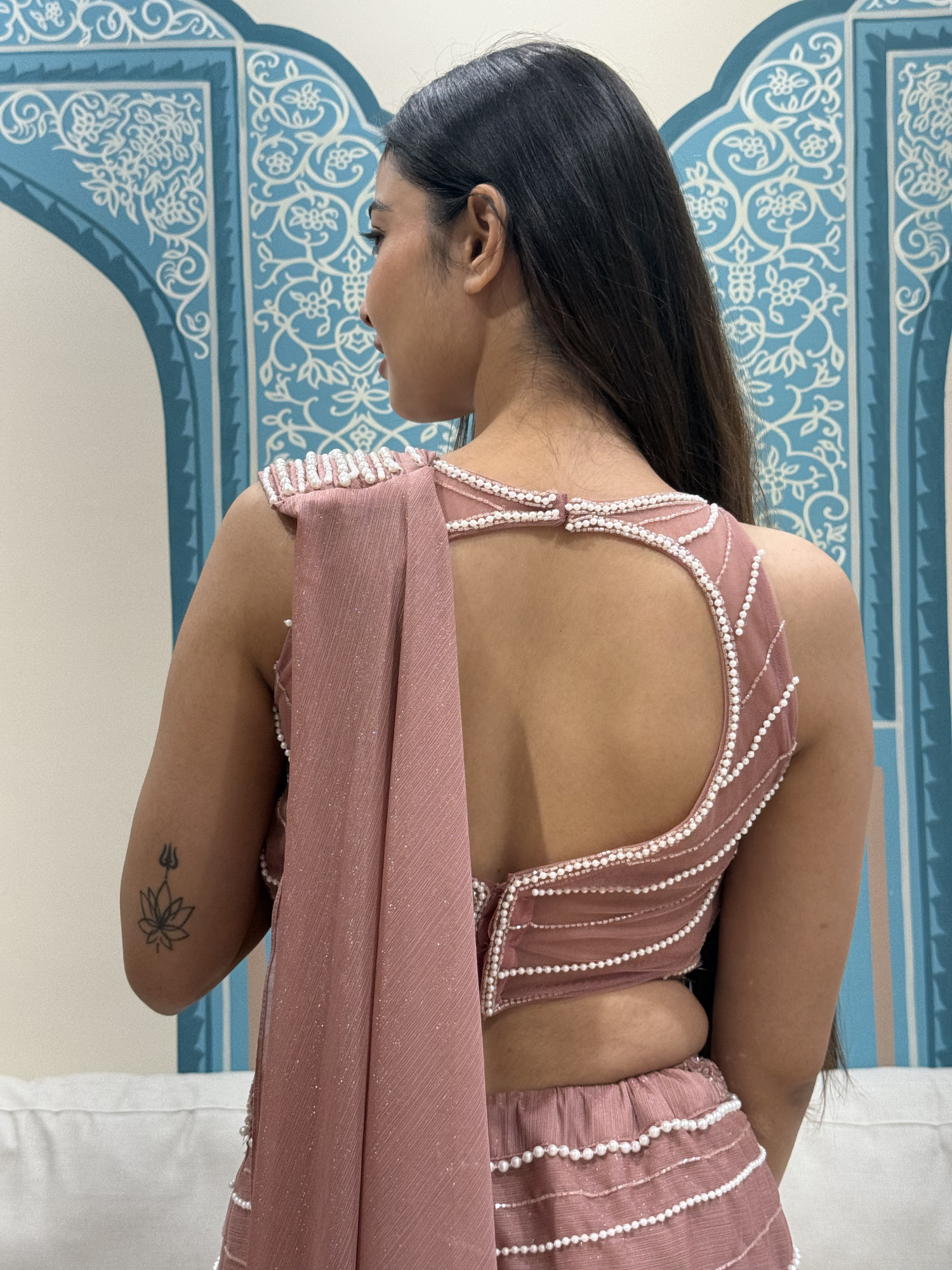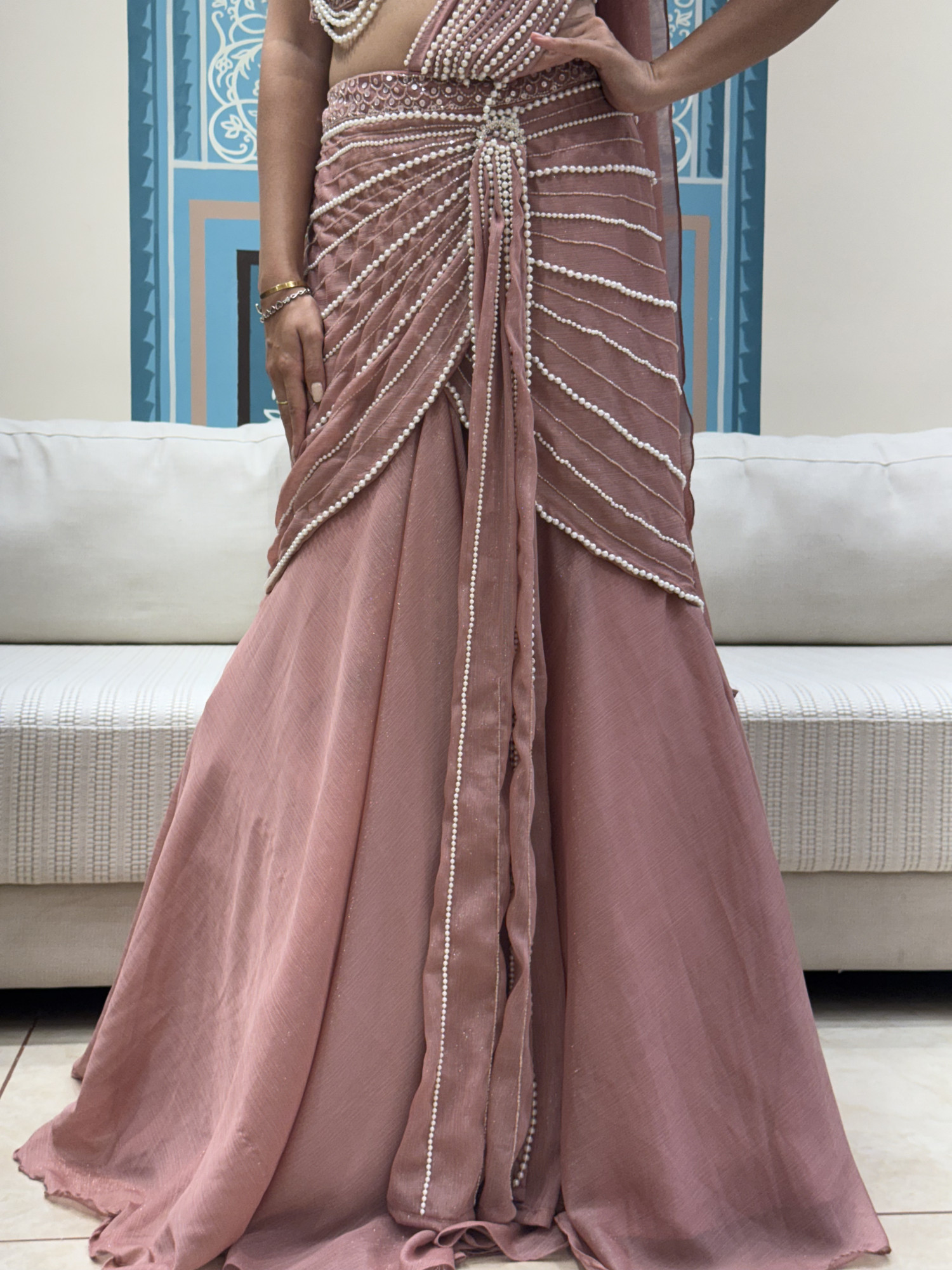 This blush pink lehenga features a fluid draped skirt highlighted with delicate pearl lines. The blouse is styled with layered pearl work that adds a statement touch, paired with a matching drape for a graceful finish. Perfect for cocktail events, receptions, or modern wedding functions.