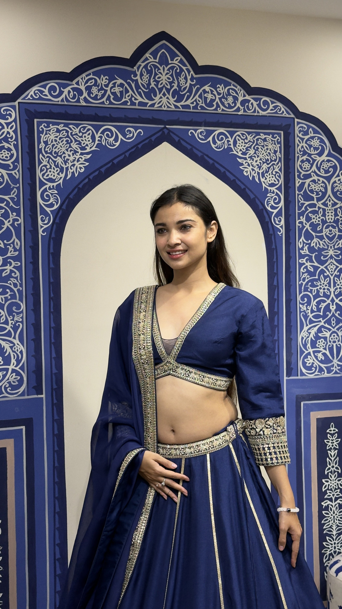This sophisticated navy blue lehenga ensemble exudes timeless elegance with its refined and minimal aesthetic. The blouse features a flattering V-neckline with delicate golden embroidery along the borders, complemented by intricately embellished sleeve cuffs for a touch of luxury. The flowing lehenga skirt is designed with subtle vertical detailing and finished with a richly embroidered border that adds depth and grandeur to the look. Paired with a lightweight sheer dupatta adorned with a beautifully embroidered border, the outfit creates a graceful and balanced silhouette. Perfect for weddings, festive gatherings, and evening celebrations, this lehenga blends understated charm with classic craftsmanship.