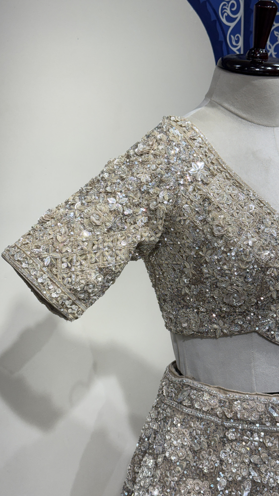 This exquisite champagne gold lehenga is richly adorned with dense floral embroidery, sequins, and shimmering beadwork that create a radiant, textured finish. The V- neck blouse features detailed hand embellishments and structured short sleeves, adding elegance and sophistication. The voluminous lehenga skirt showcases intricate all- over motifs that enhance its grandeur and graceful flare. Paired with a soft net dupatta delicately embroidered along the borders, this ensemble exudes timeless luxury— perfect for weddings, receptions, and grand festive occasions.