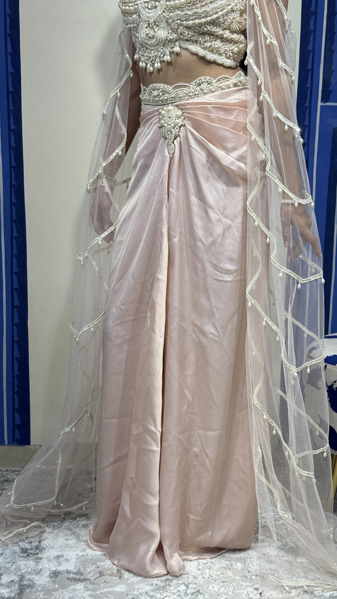 This elegant blush pink ensemble exudes grace and femininity with its delicate detailing and fluid silhouette. The blouse is richly adorned with pearls, beads, and intricate embroidery, featuring a scalloped neckline and statement straps for a royal touch. The draped skirt adds a modern twist with its soft pleats and a jeweled waist accent, enhancing the overall structure. Paired with a sheer net dupatta finished with subtle pearl accents, this outfit is perfect for engagements, receptions, or pastel-themed celebrations, offering a sophisticated and timeless charm.