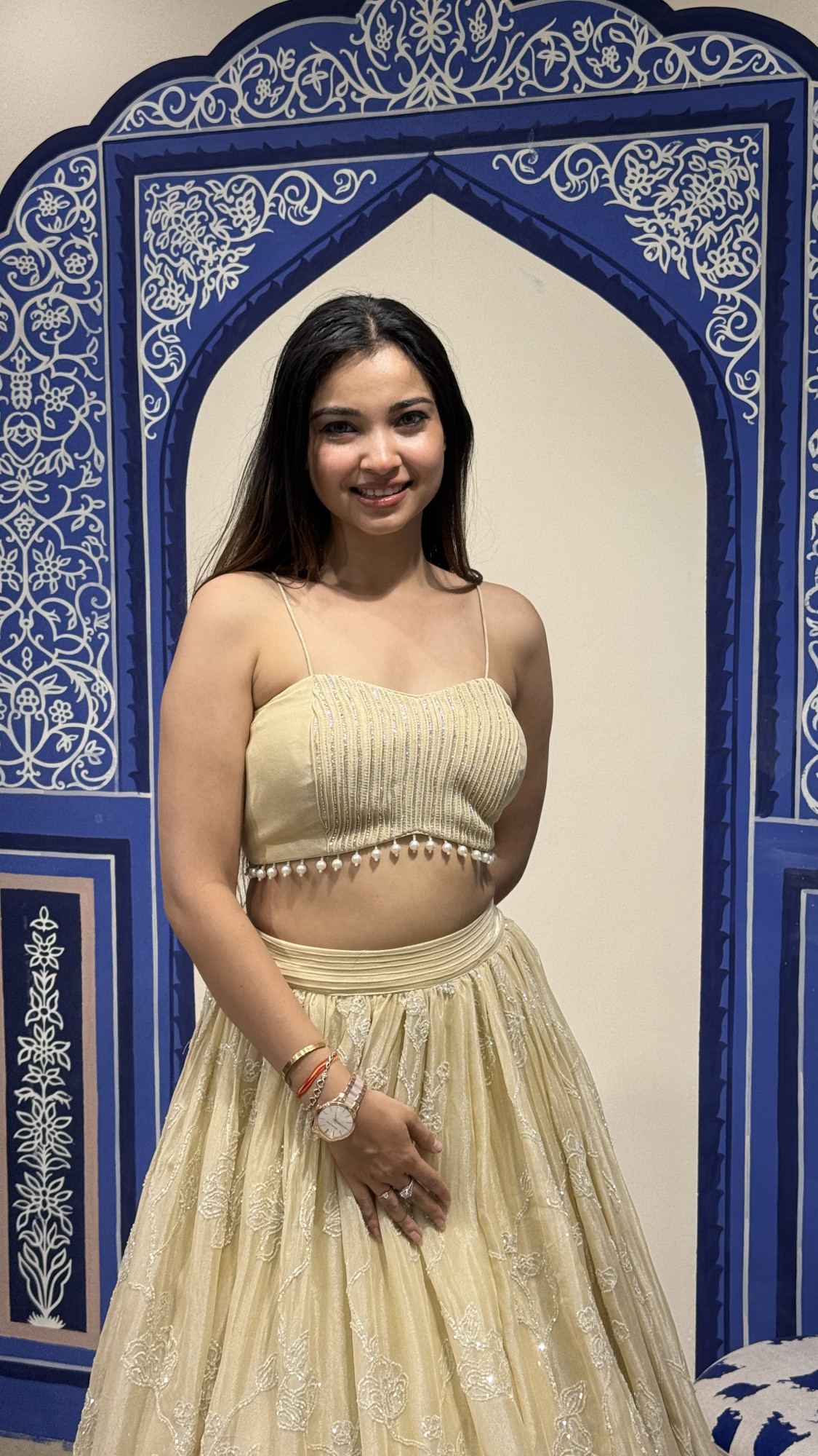 This sophisticated champagne gold ensemble radiates understated luxury with its soft shimmer and intricate detailing. The blouse features fine vertical embellishments with delicate pearl drops along the hem, paired with a voluminous skirt adorned with subtle floral embroidery that adds depth and texture. The highlight of the outfit is the sheer full-length jacket, beautifully embellished with intricate patterns, giving the look a regal and contemporary layered appeal. Perfect for festive occasions, receptions, or day weddings, this outfit blends elegance with modern charm effortlessly.