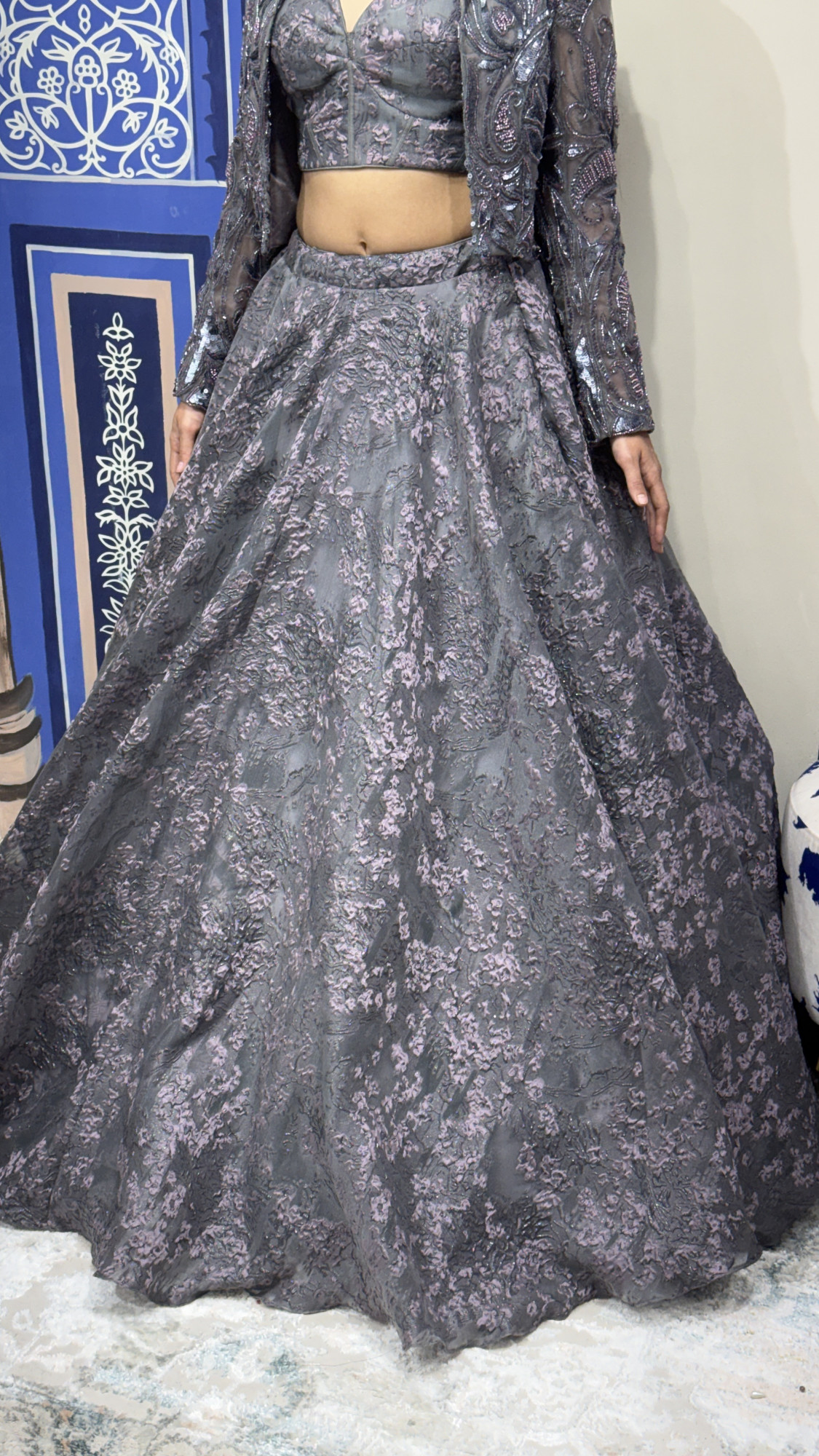 This elegant charcoal grey ensemble combines sophistication with a modern edge. The fitted blouse features a sleek silhouette with delicate textured detailing, paired with a voluminous skirt showcasing subtle floral patterns and a soft metallic sheen. The highlight is the sheer, heavily embellished jacket adorned with intricate beadwork and sequin patterns, adding depth and drama to the outfit. Perfect for cocktail events, receptions, or evening celebrations, this look offers a refined yet statement-making appeal with a chic, fashion-forward vibe.