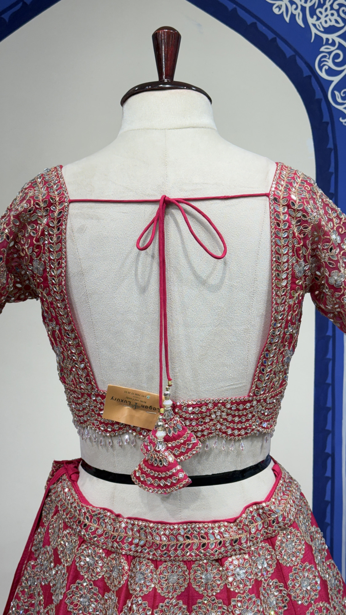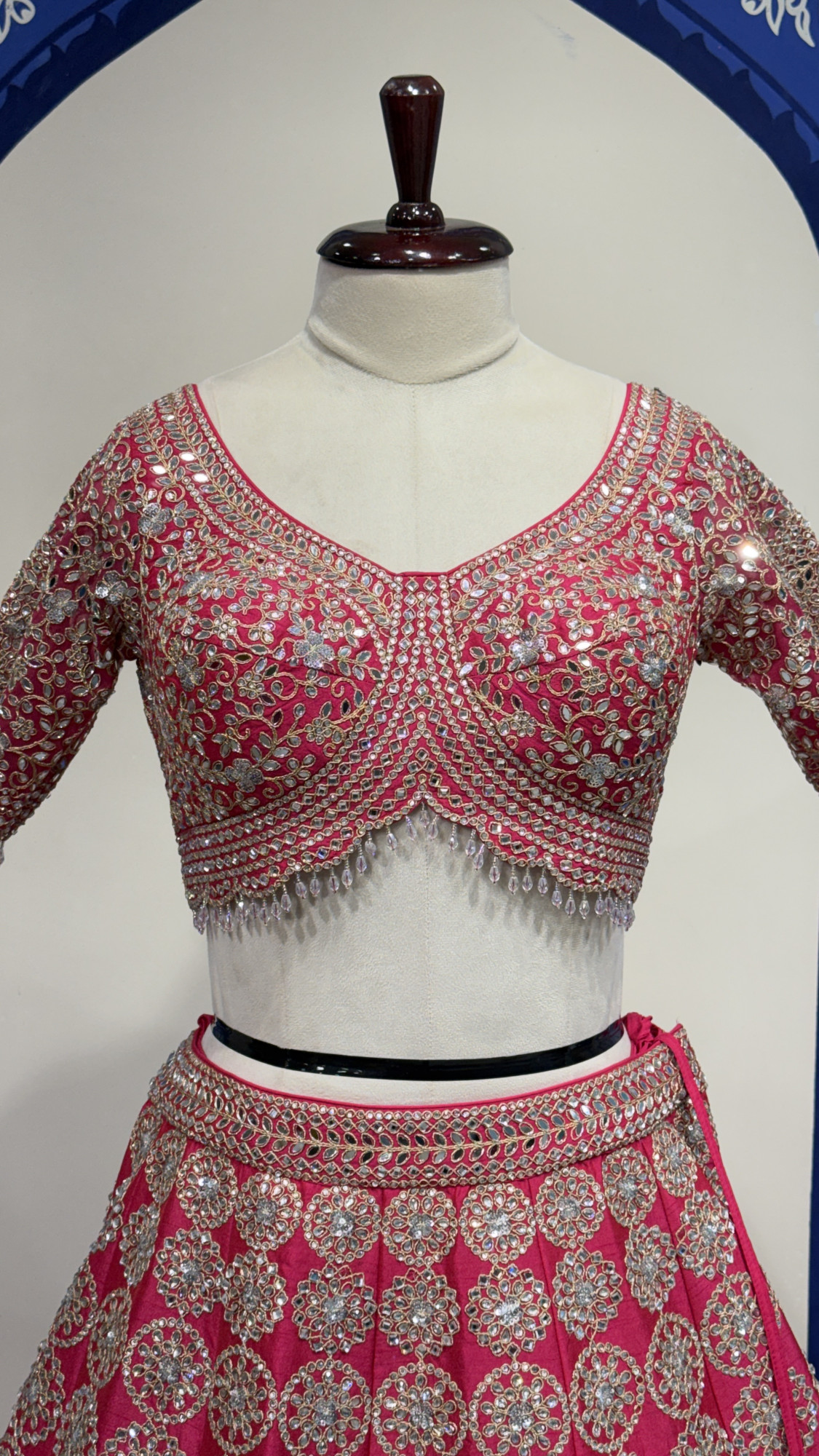 This stunning pink lehenga set radiates festive elegance with its rich embroidery and shimmering mirror work. The blouse features intricate floral and geometric patterns with delicate bead accents and elegant sleeve detailing. The lehenga skirt is adorned with repeating circular motifs and a heavily embroidered border that adds grandeur and movement. Paired with a soft net dupatta featuring subtle embroidery and a refined border, this ensemble creates a perfect blend of traditional charm and modern glamour—ideal for weddings, receptions, and grand celebrations.