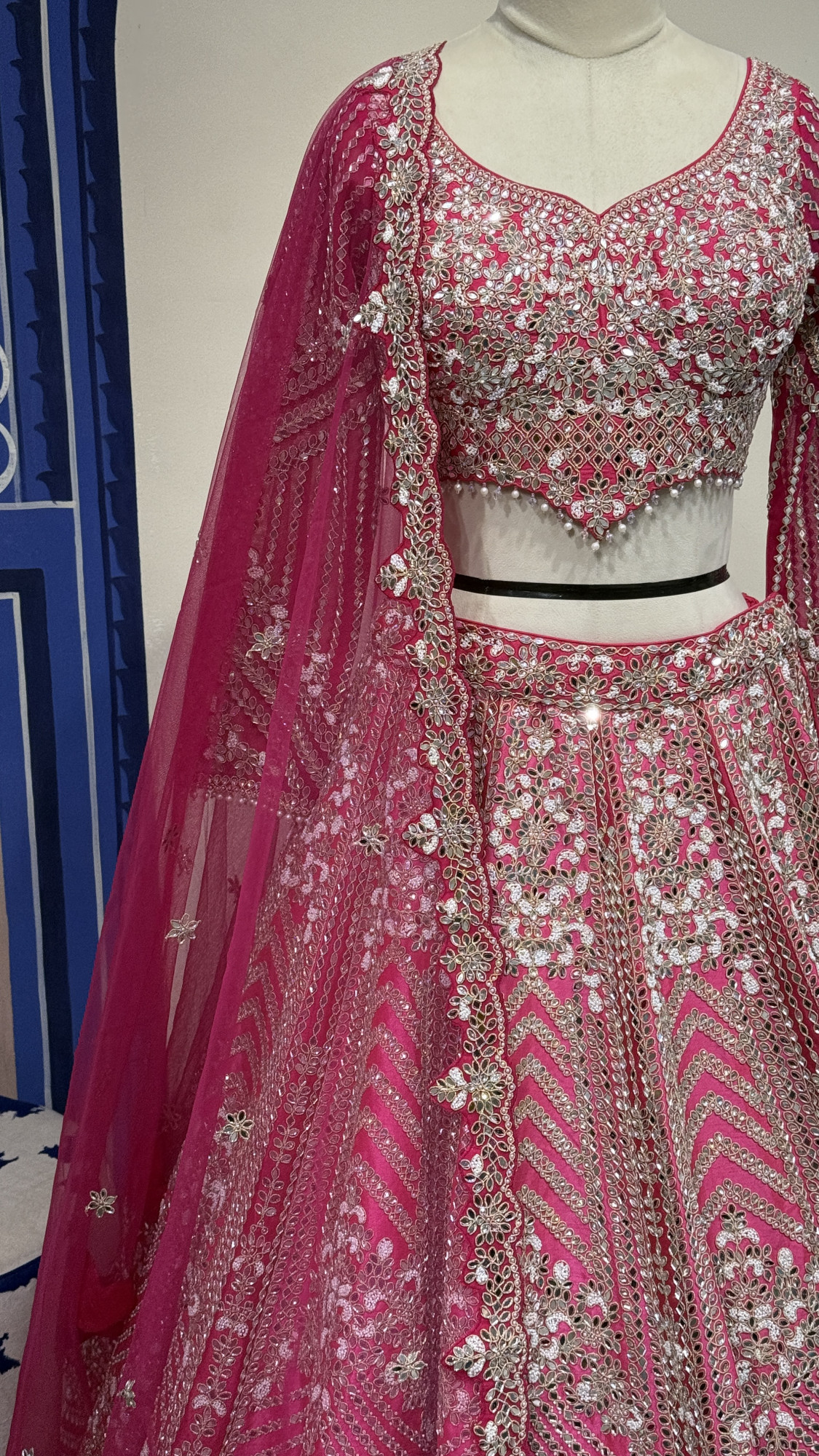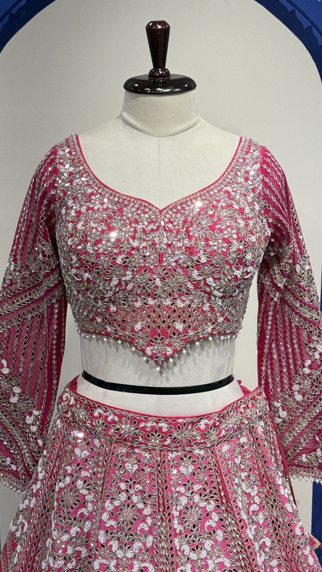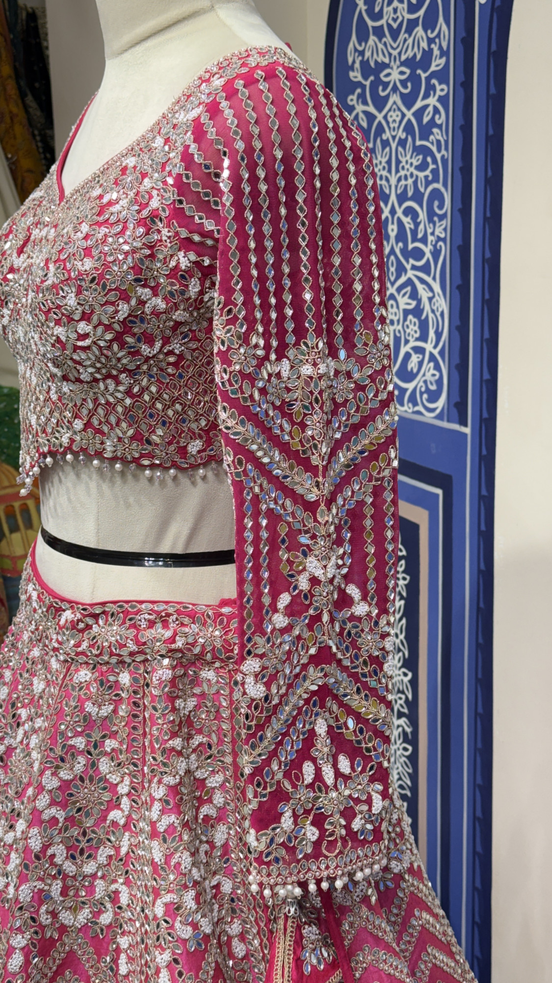 This stunning pink lehenga set is beautifully crafted with detailed mirror, zari, and sequin embroidery arranged in elegant floral and geometric patterns. The blouse features long embellished sleeves and a stylish deep-back design with delicate tassel ties, adding a touch of charm. The lehenga skirt showcases rich panel work and a heavily embroidered border that enhances its royal look. Paired with a soft net dupatta adorned with delicate embroidery, this ensemble radiates elegance and is perfect for weddings and grand festive occasions.