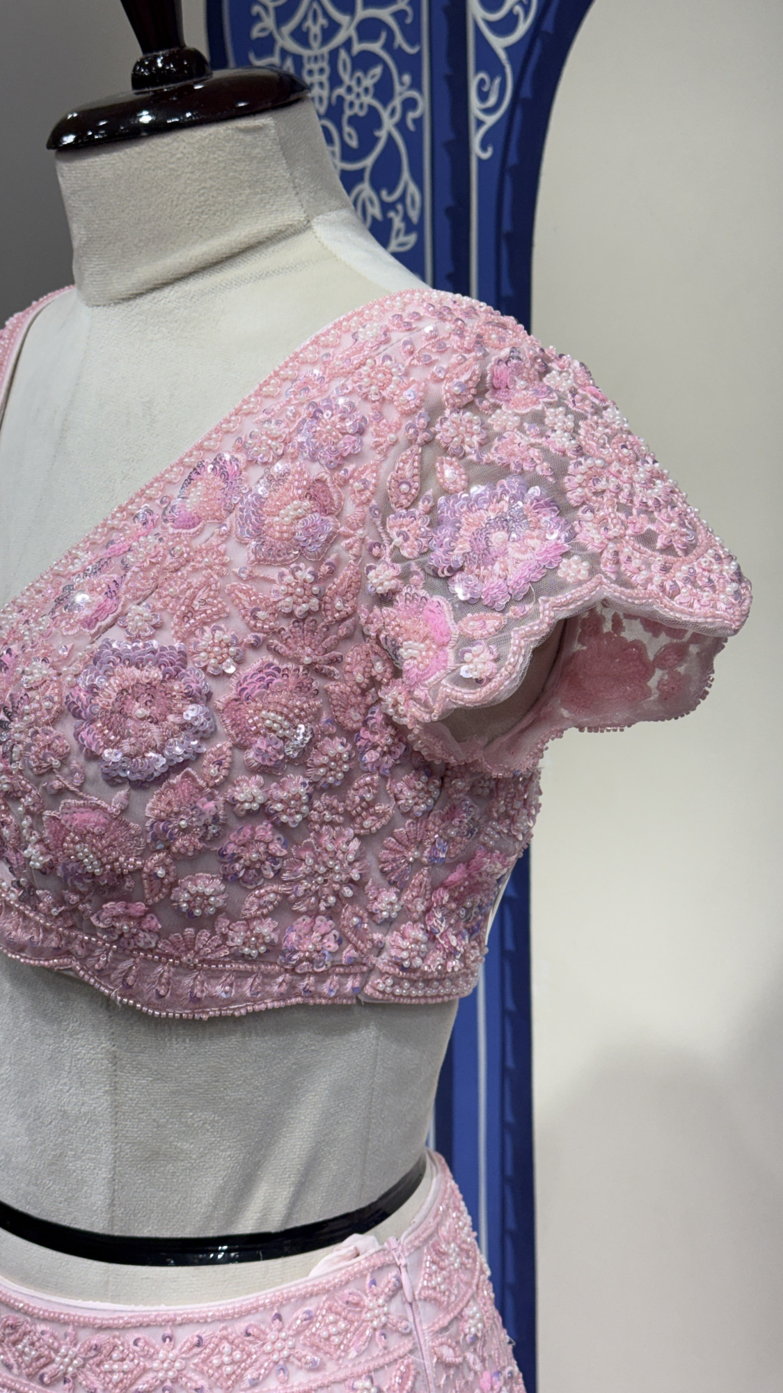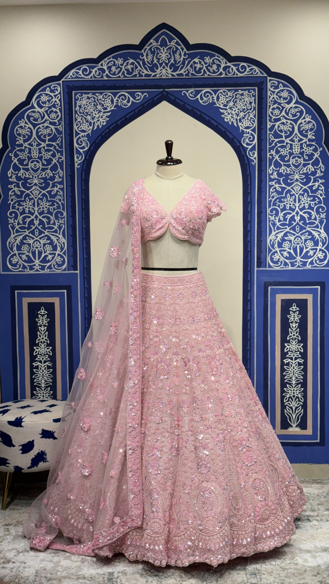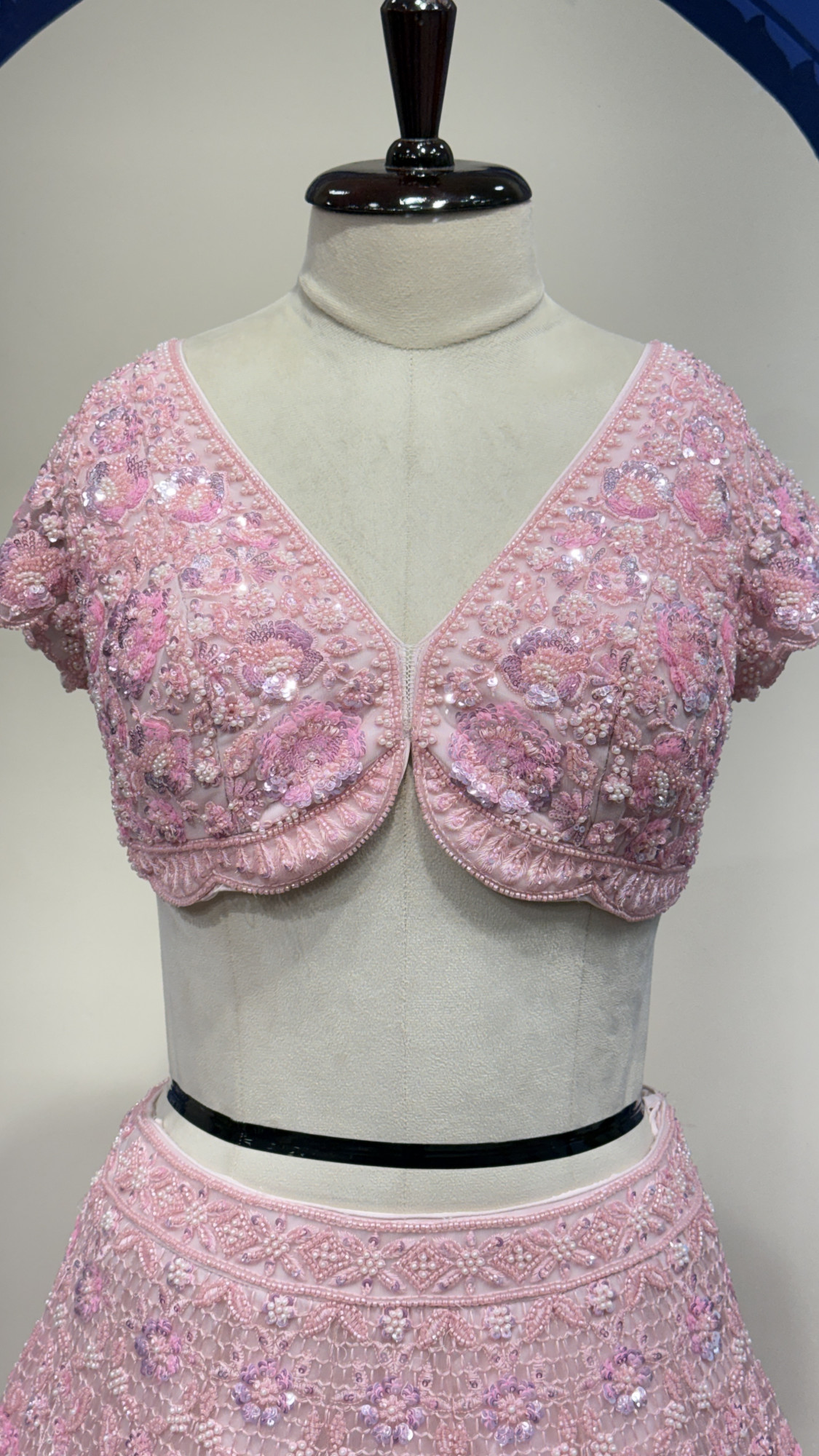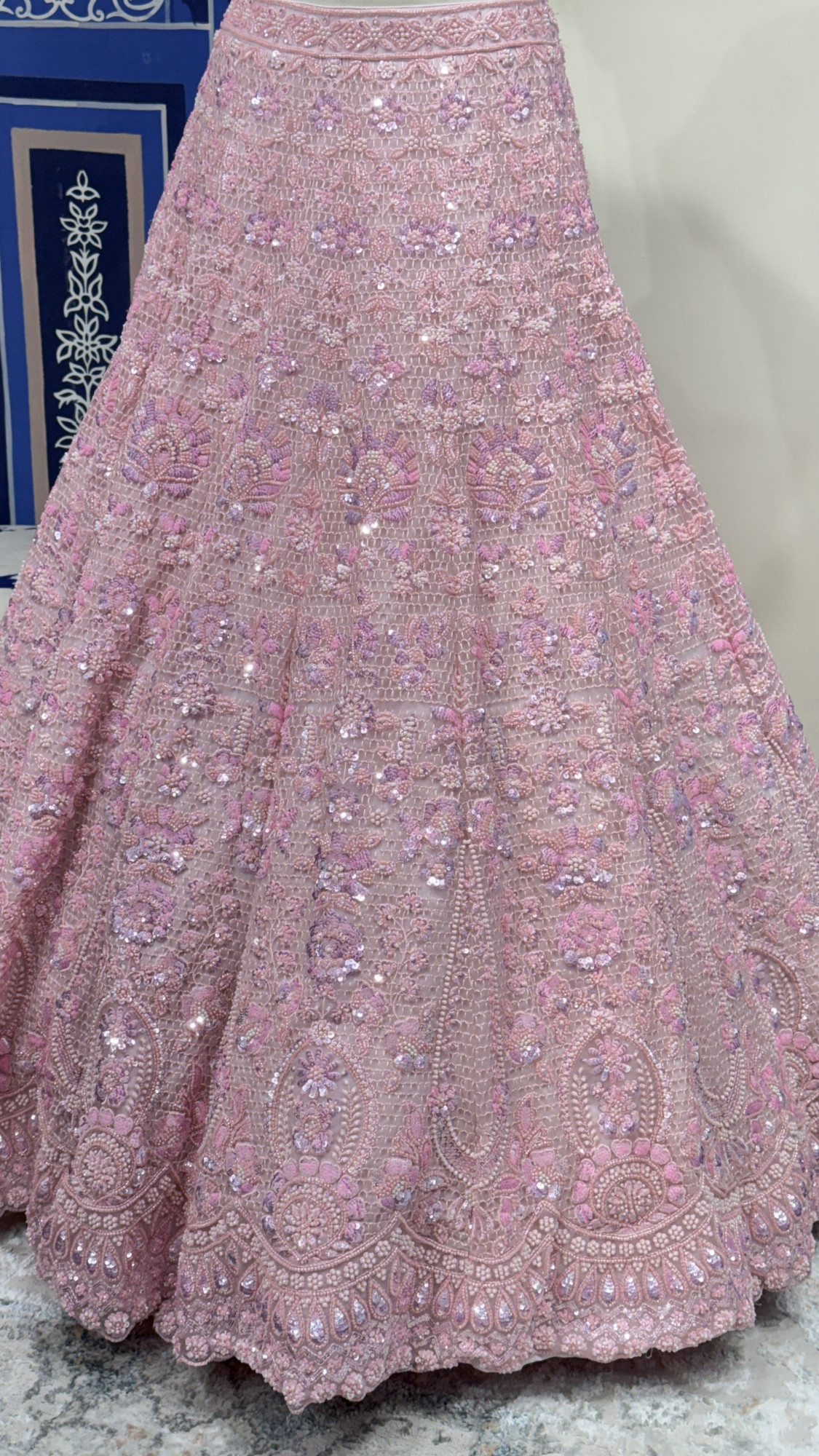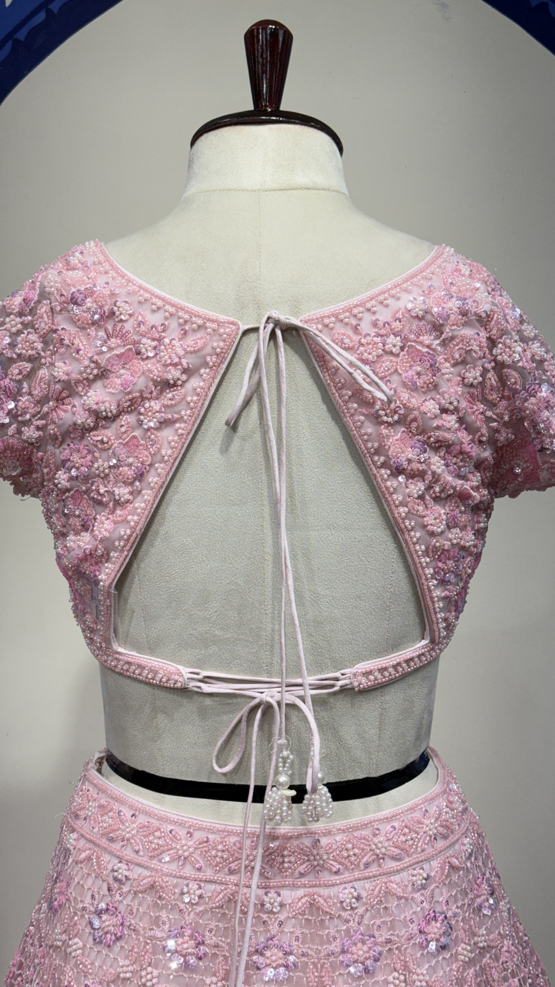 This elegant blush pink lehenga features intricate floral embroidery highlighted with sequins, pearls, and fine threadwork for a graceful sparkle. The blouse is beautifully detailed with 3D floral embellishments and a stylish open-back design with tie-up tassels, adding a modern yet feminine touch. The skirt showcases rich, detailed patterns with a heavily embroidered border that enhances its luxurious look. Paired with a soft net dupatta decorated with subtle floral motifs and an embroidered border, this ensemble is perfect for weddings, engagements, and festive celebrations.