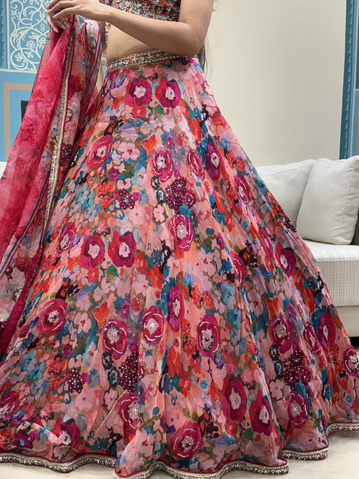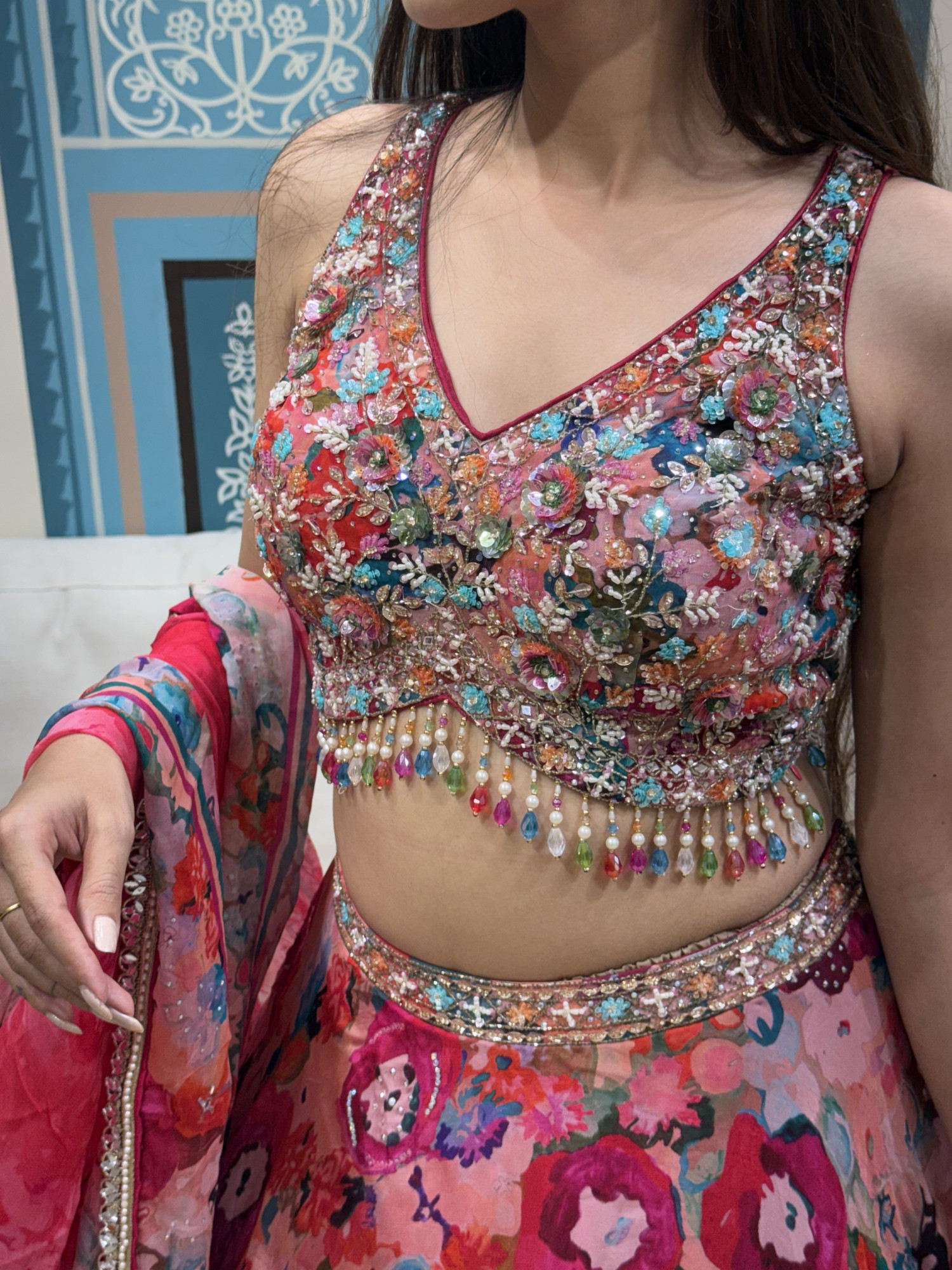 This lehenga features a vibrant floral-printed skirt paired with a heavily embroidered blouse adorned with multicolored bead drops. The matching printed dupatta adds a soft, flowing finish. Bold yet elegant, it’s perfect for festive events, mehendi functions, and joyful celebrations.