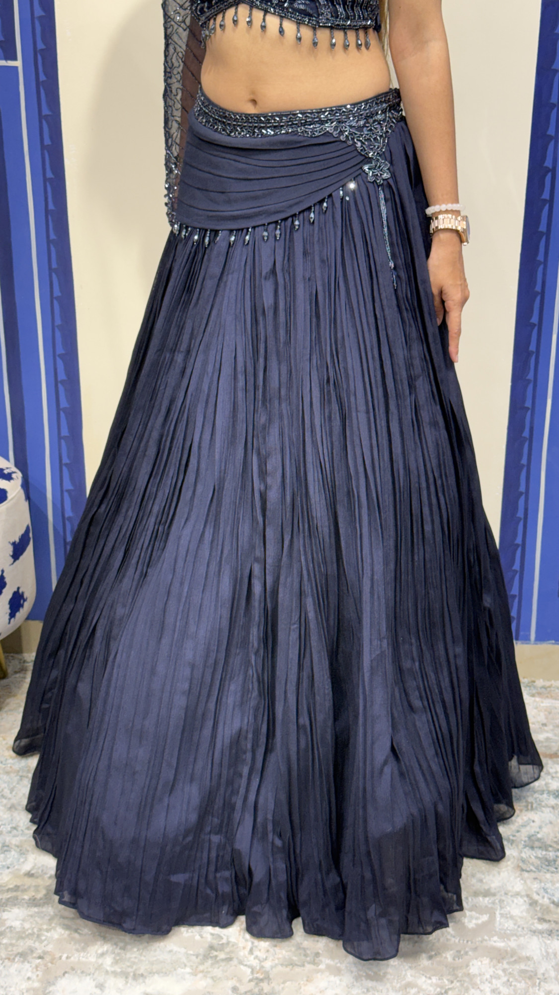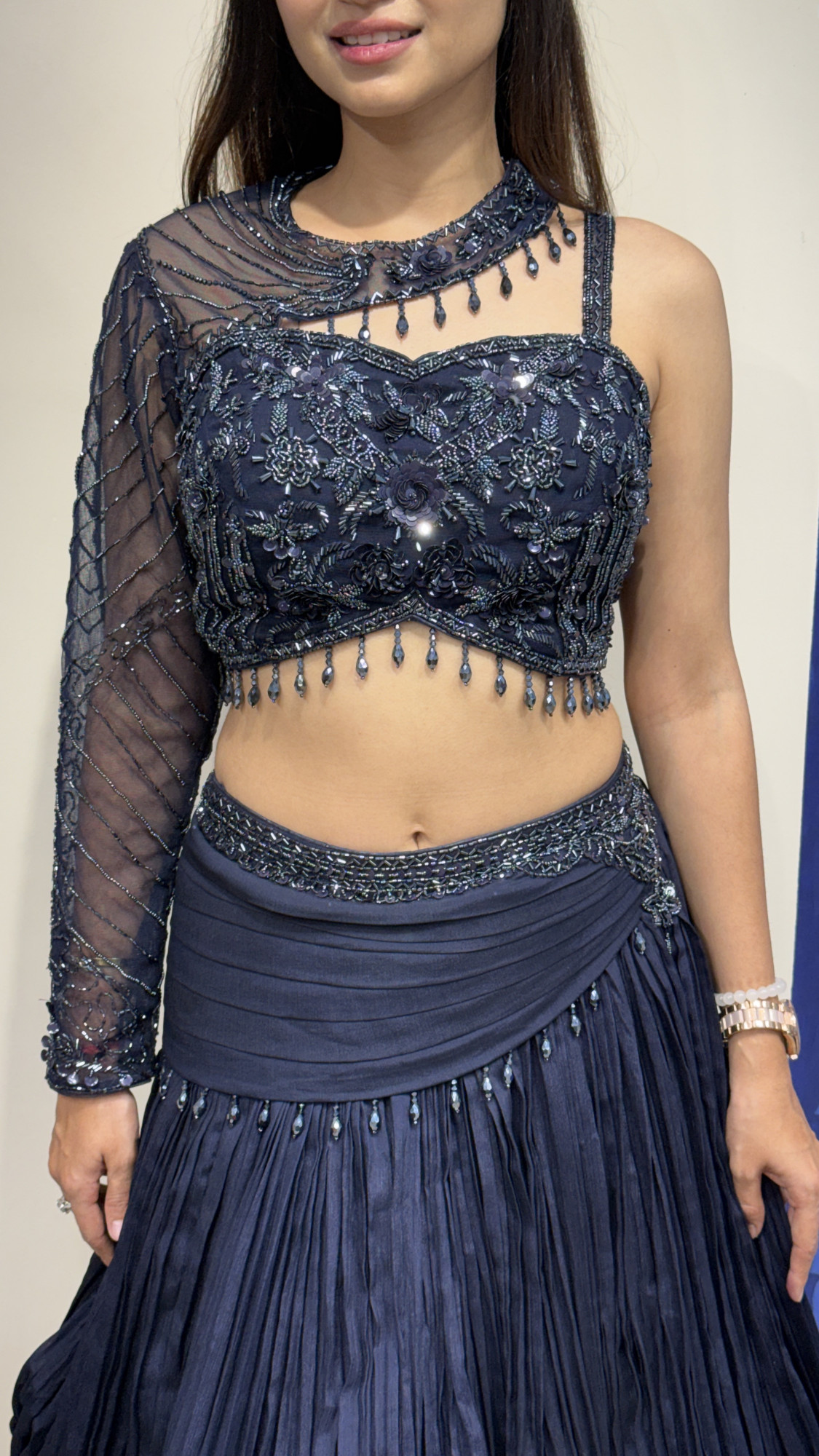 This elegant navy blue lehenga showcases detailed floral bead embroidery that adds a subtle shimmer to the ensemble. The blouse features a stylish one-shoulder design with a sheer embroidered sleeve and delicate hanging bead accents along the neckline and hem, creating a contemporary yet graceful look. The pleated lehenga skirt flows beautifully with a draped waist detail that enhances its silhouette. Paired with a soft flowing dupatta, this outfit is perfect for evening weddings, receptions, and festive celebrations, offering a refined and glamorous appeal.