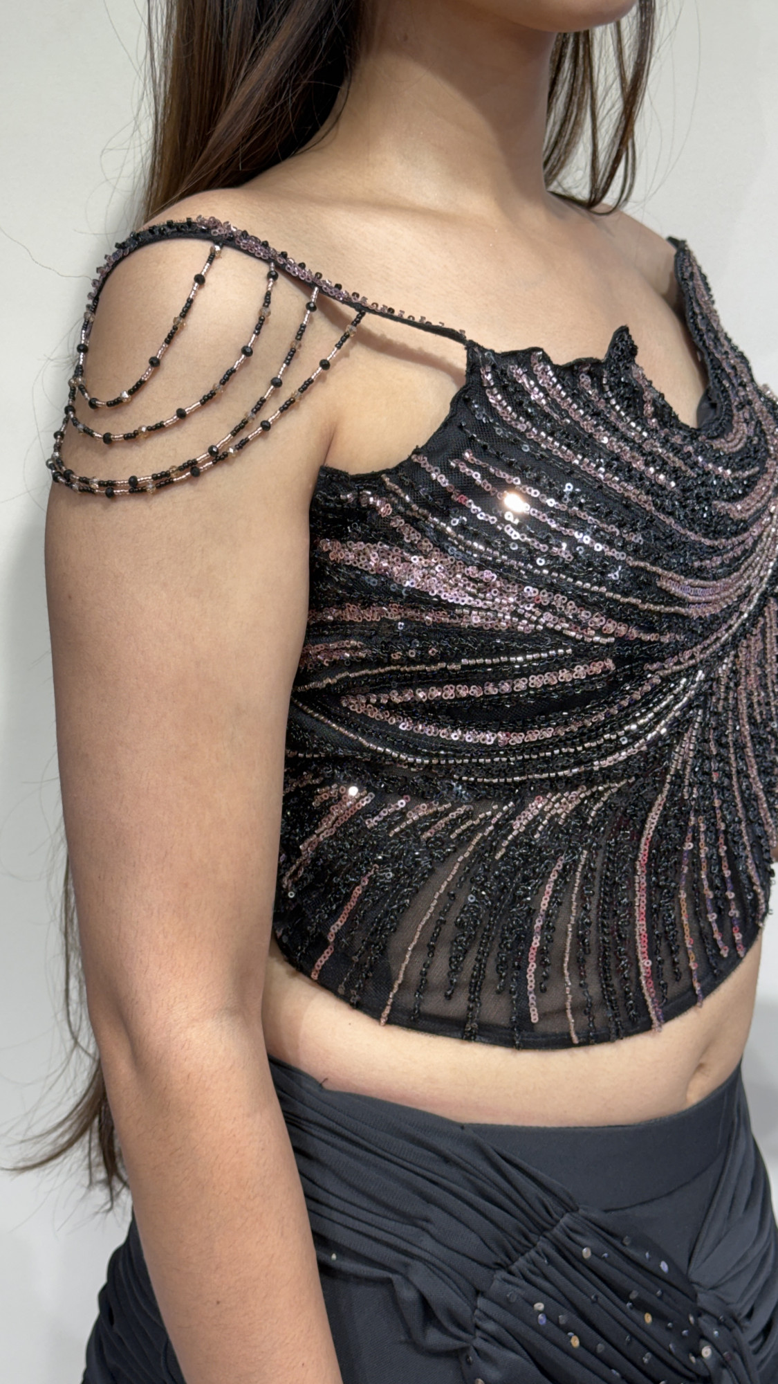 This striking black lehenga ensemble blends modern glamour with classic elegance. The blouse is beautifully designed with intricate sequin embroidery arranged in flowing wave-like patterns, creating a sculpted and eye-catching silhouette. Delicate beaded shoulder chains add a unique statement detail, enhancing its contemporary appeal. The lehenga skirt features soft drapes and subtle shimmer accents that flow gracefully with movement. Paired with a lightweight embellished dupatta, this outfit is perfect for evening receptions, cocktail events, and festive celebrations, offering a bold and sophisticated look.