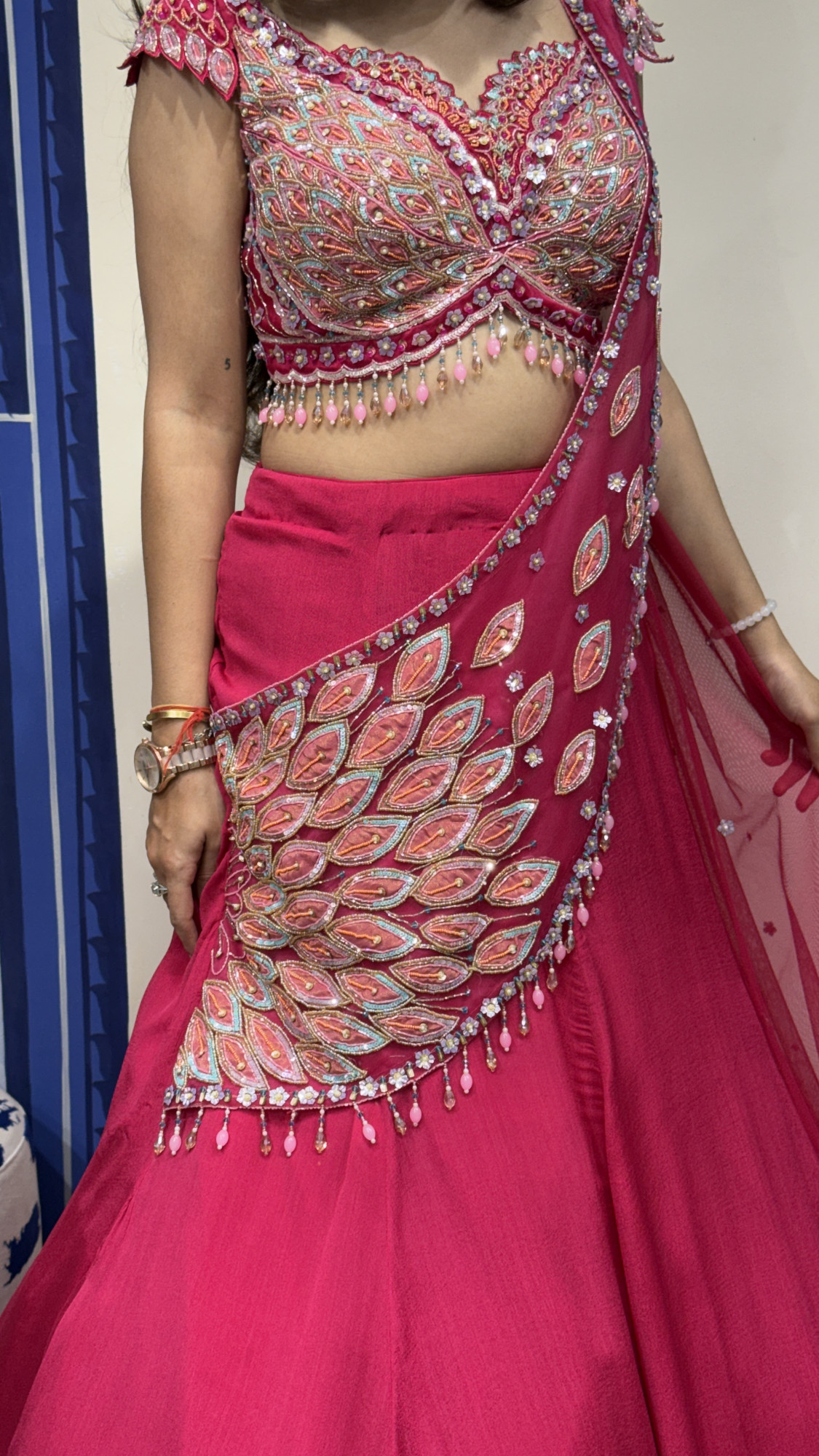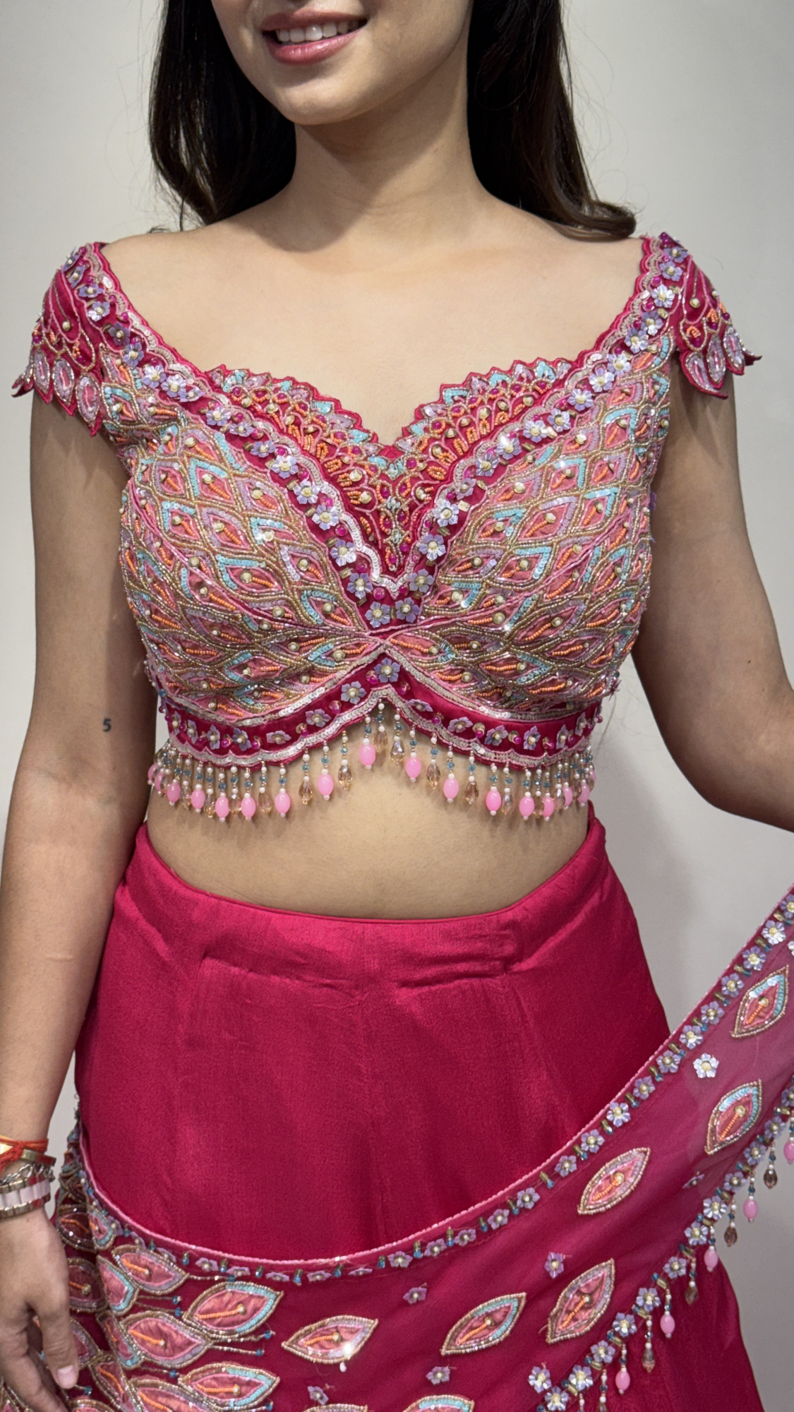 This stunning rani pink lehenga set is designed with rich multicolour threadwork, beadwork, and delicate embellishments that add texture and elegance. The blouse features a sweetheart neckline with heavily embroidered patterns and playful bead tassels along the hem, giving it a glamorous touch. The lehenga skirt flows beautifully with a smooth, elegant finish, while the embroidered draped dupatta with detailed borders enhances the overall silhouette. Perfect for weddings, receptions, and festive celebrations, this outfit blends traditional craftsmanship with a modern statement style.