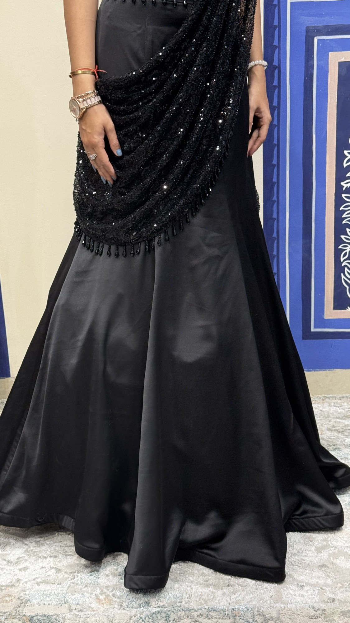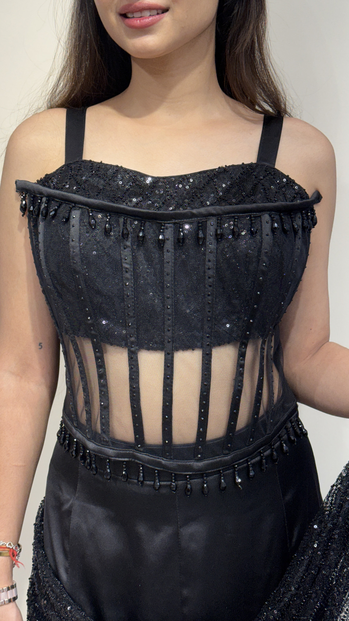 This elegant black ensemble features a modern corset-style bodice with sheer panel detailing and delicate bead embellishments that create a bold, sculpted silhouette. The outfit is paired with a smooth satin skirt that flows beautifully, adding a luxurious touch. A sparkling sequined drape with bead tassel edges enhances the look, giving it a dramatic saree-inspired finish. Perfect for cocktail events, receptions, and evening celebrations, this outfit combines contemporary glamour with timeless sophistication.