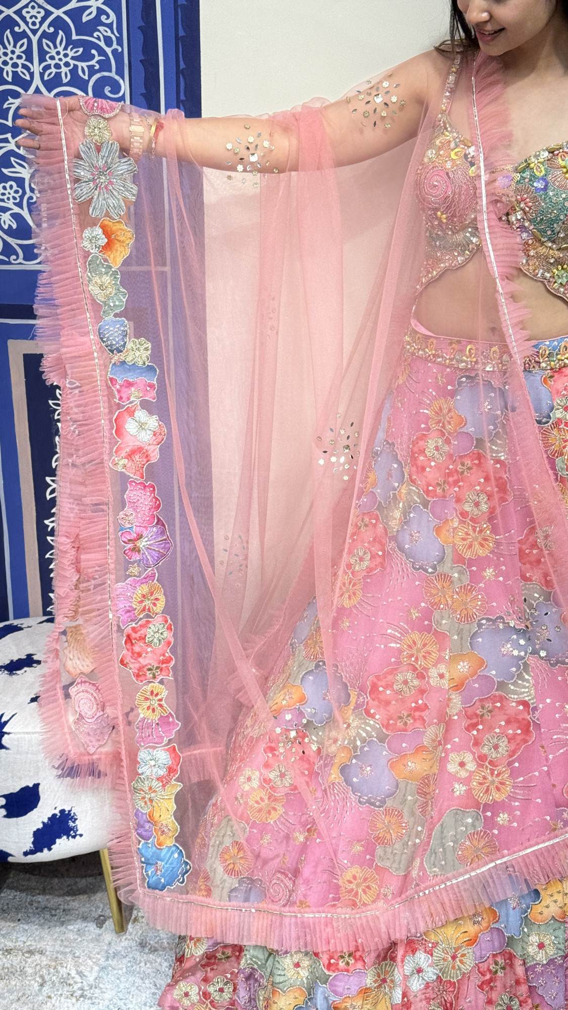 This stunning lehenga set is designed with a beautiful mix of colours and intricate floral embroidery that brings a lively and artistic feel to the outfit. The blouse is richly embellished with beads, sequins, and stone detailing, featuring elegant straps and a stylish back design that adds a modern touch. The lehenga skirt showcases colourful floral patterns with delicate handwork, creating graceful movement and a luxurious appearance. Paired with a soft net dupatta finished with ruffle edging and floral appliqué work, this outfit is perfect for weddings, sangeet nights, and grand festive occasions.