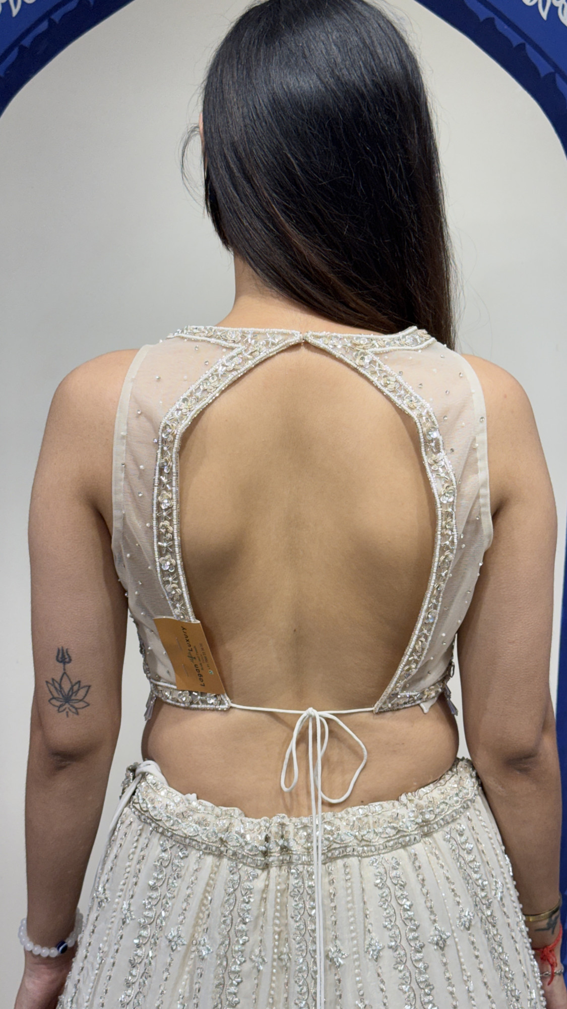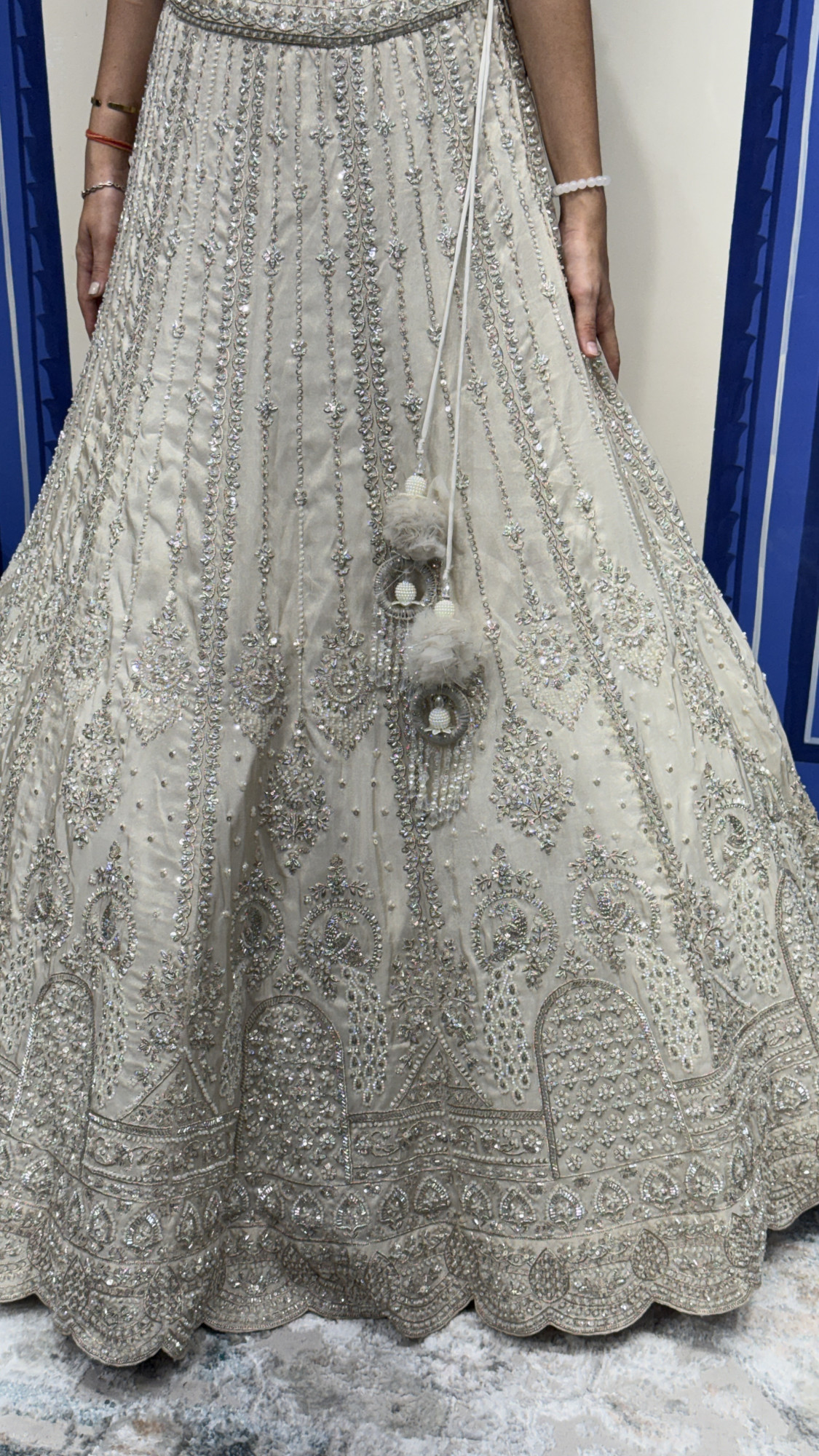 This beautiful ivory lehenga set exudes elegance and sophistication with its delicate craftsmanship and subtle shimmer. The blouse features intricate embroidery with a stylish net neckline that adds a modern touch while maintaining a traditional charm. The lehenga skirt is richly adorned with detailed patterns and fine embellishments that create a graceful, flowing silhouette. Paired with a matching dupatta featuring delicate embroidery and a refined border, this ensemble perfectly balances luxury and elegance. Ideal for weddings, receptions, and grand festive celebrations, this outfit offers a regal and timeless appeal.
