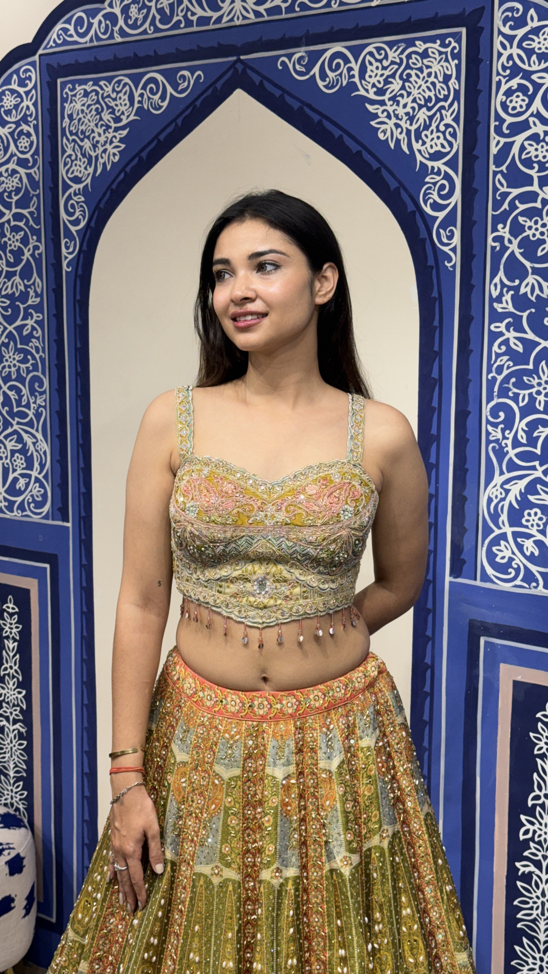 This stunning lehenga set blends earthy tones of olive green, rust, and soft pastels, creating a rich and artistic aesthetic. The blouse is intricately embroidered with delicate threadwork, subtle embellishments, and elegant bead tassels that add graceful movement. The lehenga skirt showcases detailed traditional patterns and motifs, enhanced with fine embellishments that give the outfit depth and character. Completing the ensemble is a beautifully printed dupatta with ornate borders, adding an extra layer of elegance. Perfect for festive occasions, weddings, and special celebrations, this outfit offers a beautiful balance of tradition and modern charm.