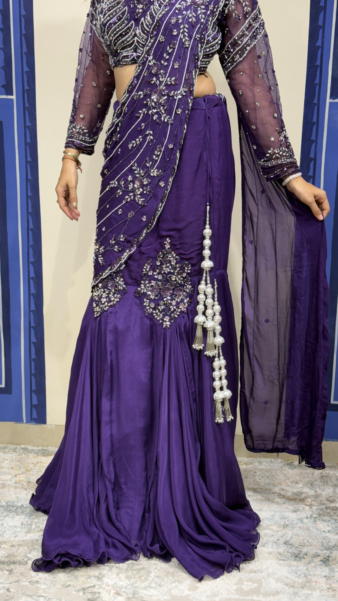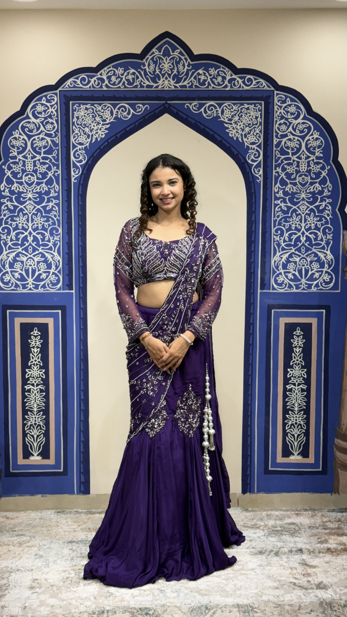 This elegant lehenga set showcases a rich deep purple hue that exudes sophistication and charm. The blouse features intricate silver beadwork and sequin embroidery arranged in graceful patterns, complemented by sheer full sleeves adorned with delicate embellishments. The lehenga skirt flows beautifully with subtle detailing and embroidered motifs that enhance its luxurious appeal. Adding a modern twist, the ensemble includes a stylish draped dupatta design with fine beadwork and sparkling accents that elevate the overall look. The back tie-up detail with tassels adds a traditional touch while maintaining a chic silhouette. Perfect for weddings, receptions, and festive celebrations, this outfit blends classic craftsmanship with contemporary elegance.
