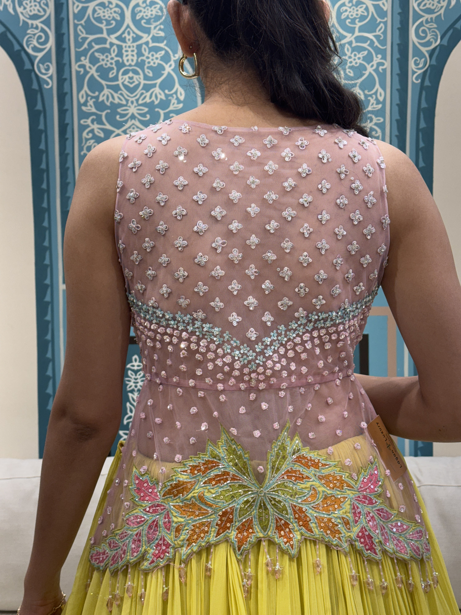 This lehenga features a flowy yellow skirt paired with a pastel pink blouse, detailed with delicate embroidery and subtle sparkle. Light, graceful, and perfect for daytime celebrations or festive occasions.