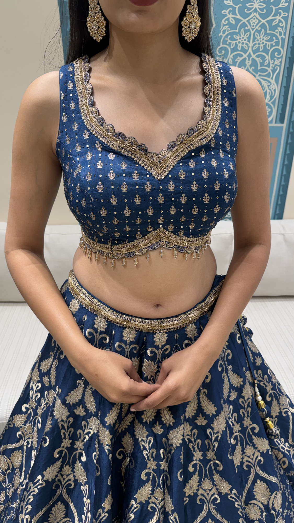 This deep blue lehenga is beautifully crafted with fine gold motifs that add richness without looking heavy. The fitted blouse complements the flared skirt perfectly, while the matching dupatta completes the traditional look. Simple, elegant, and timeless, this lehenga is ideal for weddings, festive celebrations, and special occasions where you want a graceful statement.
