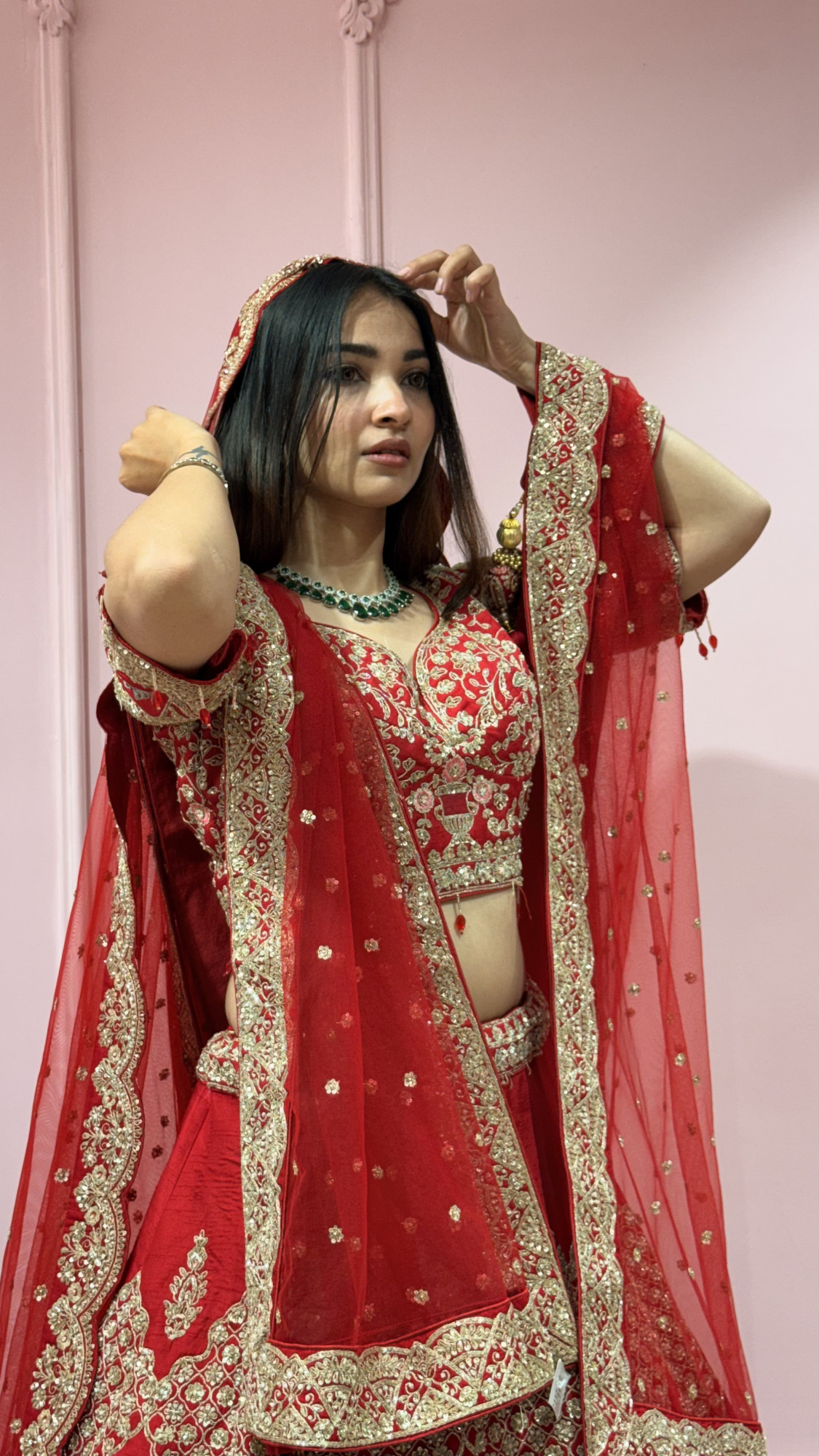 This red lehenga features detailed gold thread and sequin work on the blouse and skirt, paired with a matching embroidered dupatta. The traditional design and elegant finish make it a timeless choice for bridal and special celebrations.